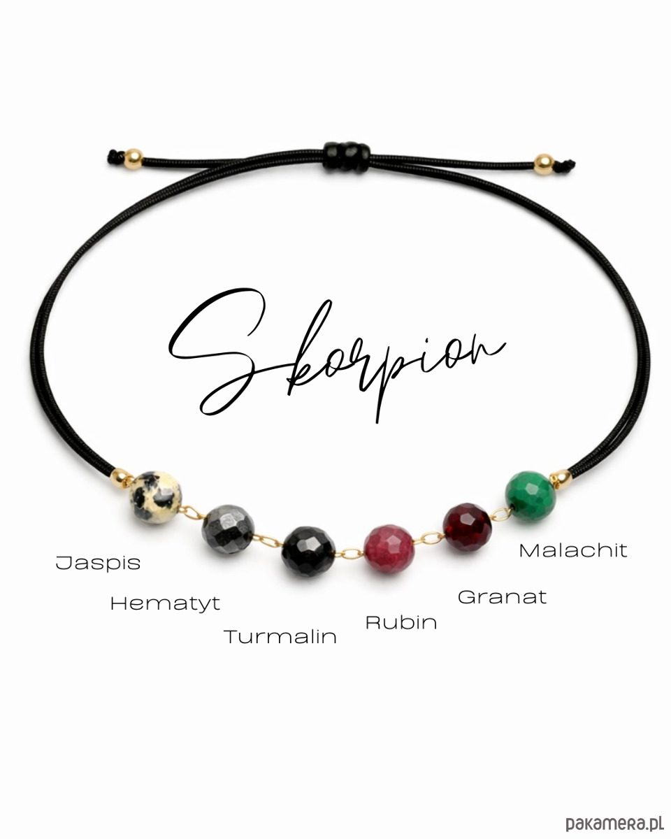 Bransoletka Zodiak Skorpion to kompozycja kamieni dobranych tak, aby nawiązywać do intensywności i głębi przypisywanej temu znakowi. W centrum znajduje się sześć naturalnych minerałów ułożonych w lekkiej, ruchomej formie na delikatnym łańcuszku, który pracuje razem z nadgarstkiem.