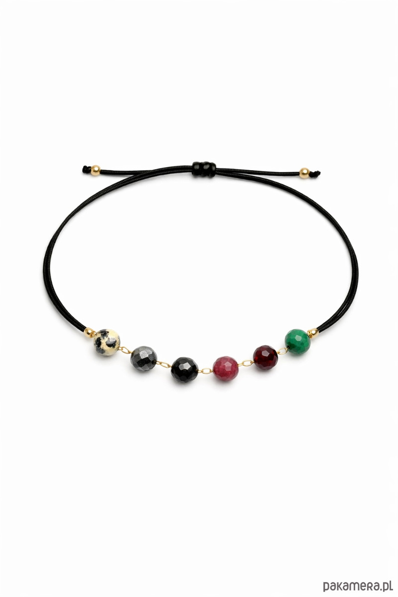Bransoletka została osadzona na trwałej nici z regulowanym przesuwanym zapięciem, dzięki czemu łatwo dopasowuje się do nadgarstka. Kamienie są fasetowane, subtelnie odbijają światło i zachowują naturalny charakter.