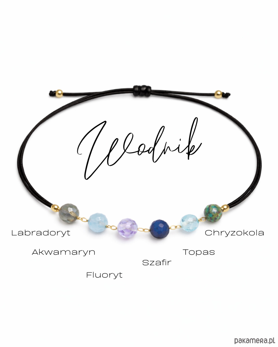 Bransoletka Zodiak Wodnik to kompozycja kamieni dobranych tak, aby nawiązywać do niezależności i otwartości przypisywanej temu znakowi. W centrum znajduje się sześć naturalnych minerałów ułożonych w lekkiej, ruchomej formie na delikatnym łańcuszku, który pracuje razem z nadgarstkiem.