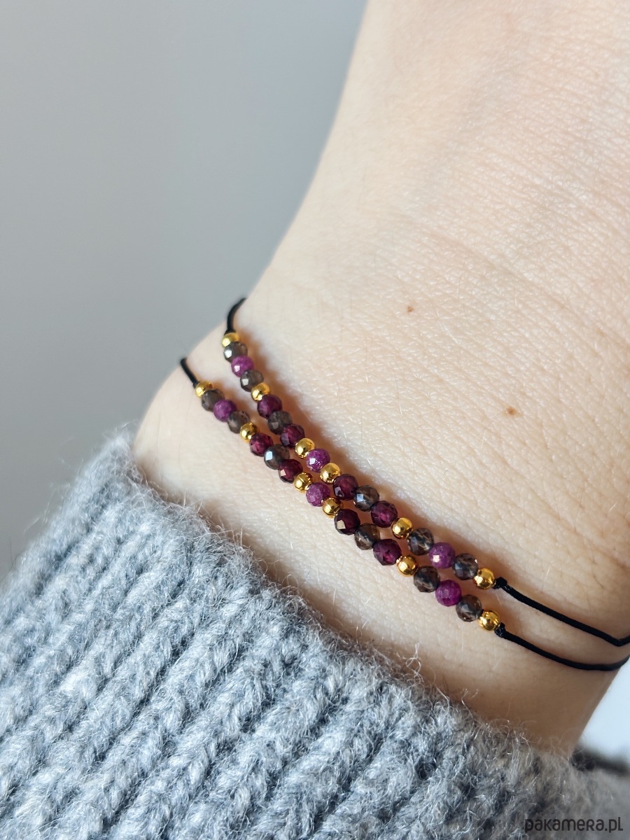 Ręcznie wykonana bransoletka z kwarcu dymnego, rubinu i granatu- kamieni siły, wytrwałości i wewnętrznej równowagi, które wspierają energię Koziorożca. Delikatne, starannie wyselekcjonowane kamienie o średnicy 2mm zostały osadzone na trwały nylonowy sznurek z regulowanym zapięciem, dzięki czemu bransoletka idealnie dopasowuje się do każdej dłoni.