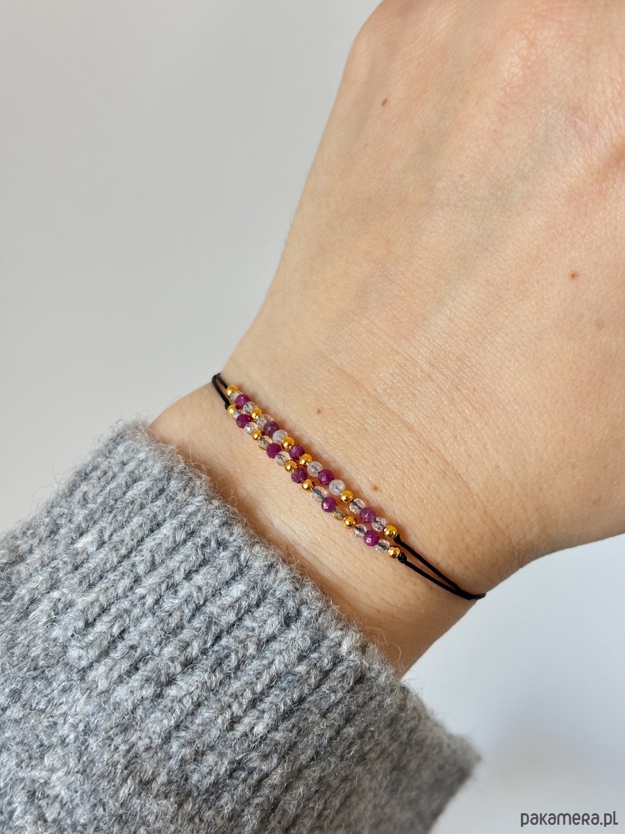 Ręcznie wykonana bransoletka z trzech kamieni mocy, odwagi i blasku- rubinu, cytrynu i kryształu górskiego. Delikatne, starannie wyselekcjonowane kamienie o średnicy 2mm zostały osadzone na trwały nylonowy sznurek z regulowanym zapięciem, dzięki czemu bransoletka idealnie dopasowuje się do każdej dłoni.