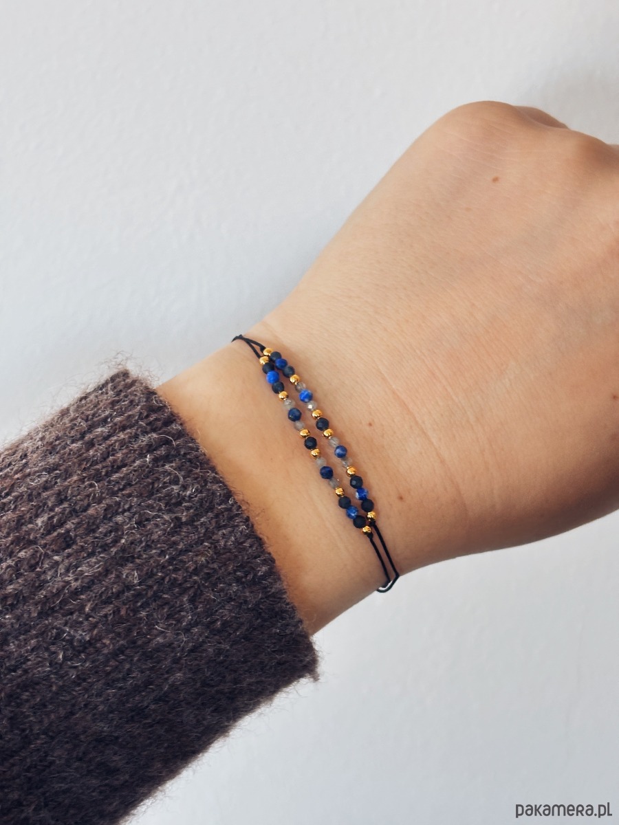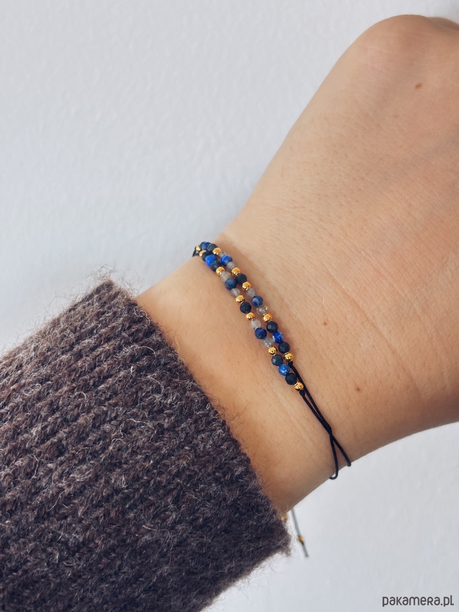 Ręcznie wykonana bransoletka z trzech kamieni mądrości, intuicji i wewnętrznej równowagi- szafiru, labradorytu i lapis lazuli. Delikatne, starannie wyselekcjonowane kamienie o średnicy 2mm zostały osadzone na trwały nylonowy sznurek z regulowanym zapięciem, dzięki czemu bransoletka idealnie dopasowuje się do każdej dłoni.