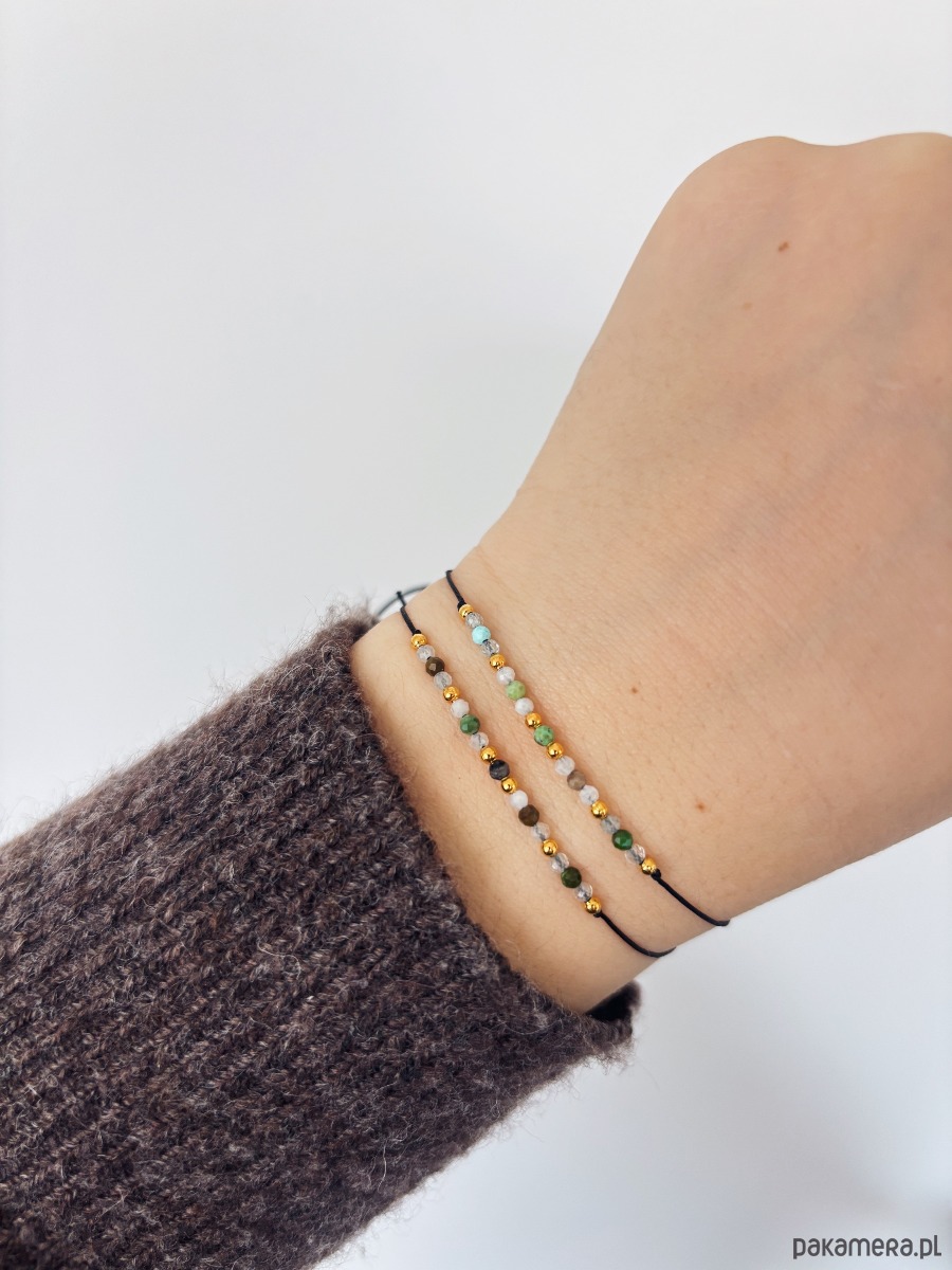 Ręcznie wykonana bransoletka z trzech kamieni intuicji, harmonii i delikatności- turkusu, akwamarynu i kamienia księżycowego. Delikatne, starannie wyselekcjonowane kamienie o średnicy 2mm zostały osadzone na trwały nylonowy sznurek z regulowanym zapięciem, dzięki czemu bransoletka idealnie dopasowuje się do każdej dłoni.