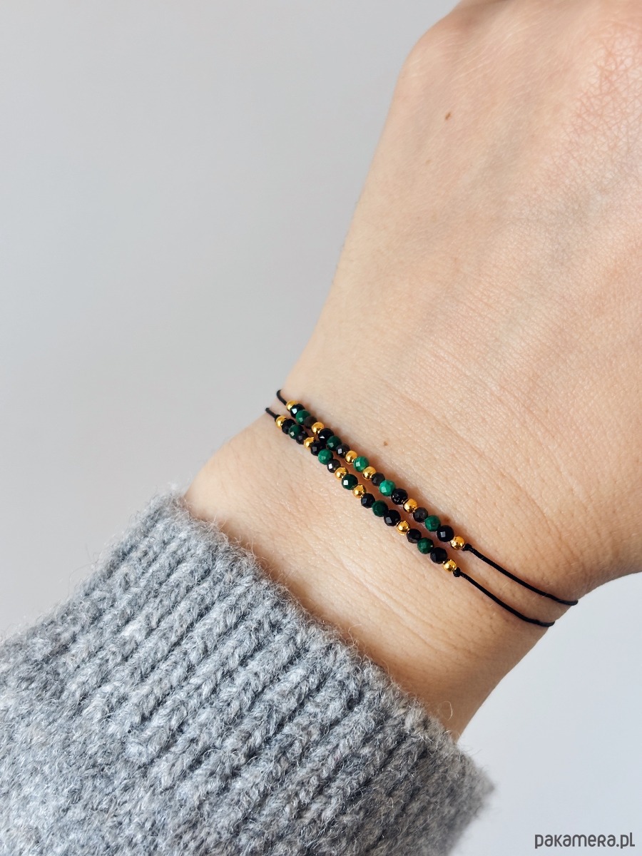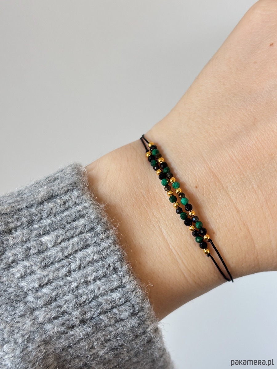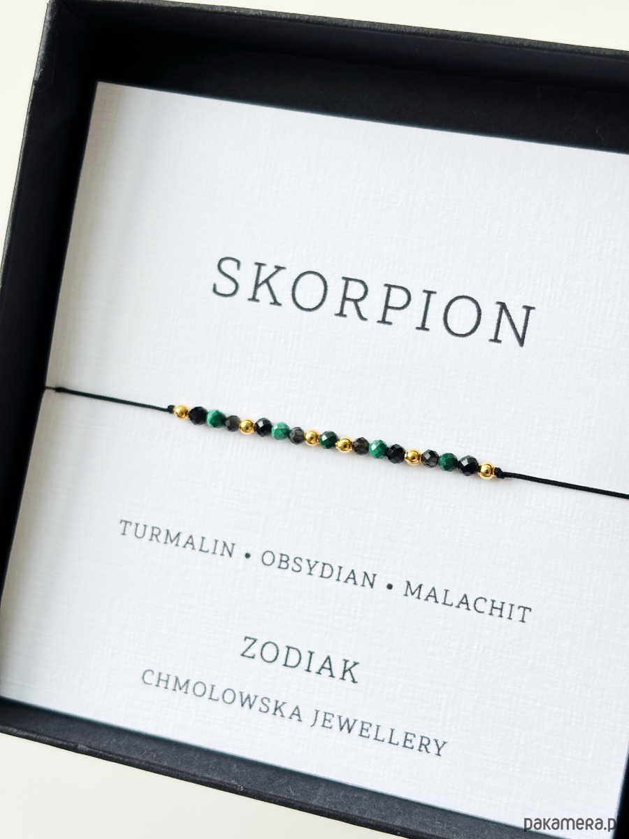 Ręcznie wykonana bransoletka z malachitu, obsydianu i czarnego turmalinu- kamieni mocy i ochrony dedykowanych Skorpionowi. Delikatne, starannie wyselekcjonowane kamienie o średnicy 2mm zostały osadzone na trwały nylonowy sznurek z regulowanym zapięciem, dzięki czemu bransoletka idealnie dopasowuje się do każdej dłoni.