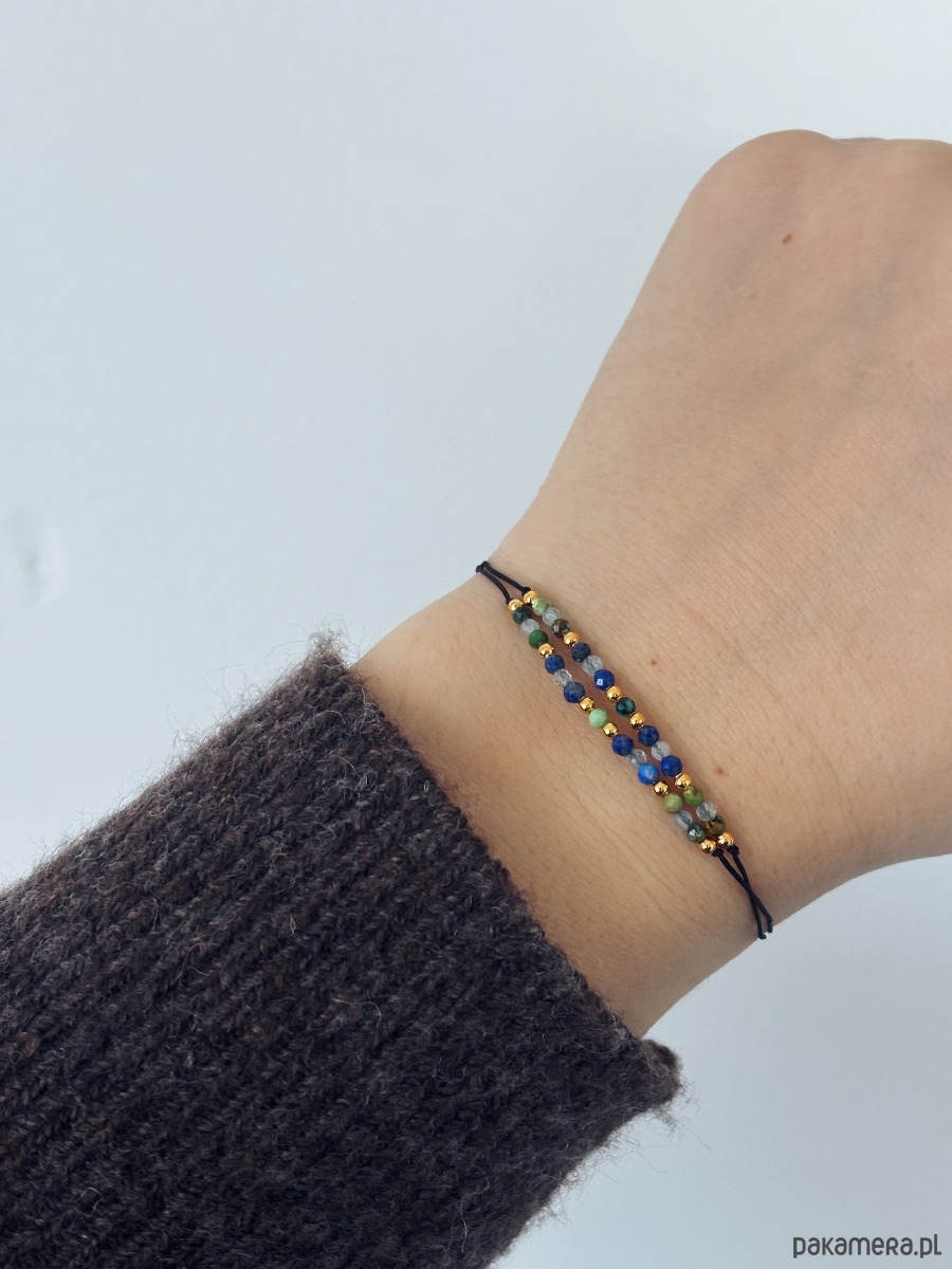 Ręcznie wykonana bransoletka z trzech kamieni równowagi, spokoju i komunikacji- akwamarynu, lapis lazuli i turkusu. Delikatne, starannie wyselekcjonowane kamienie o średnicy 2mm zostały osadzone na trwały nylonowy sznurek z regulowanym zapięciem, dzięki czemu bransoletka idealnie dopasowuje się do każdej dłoni.