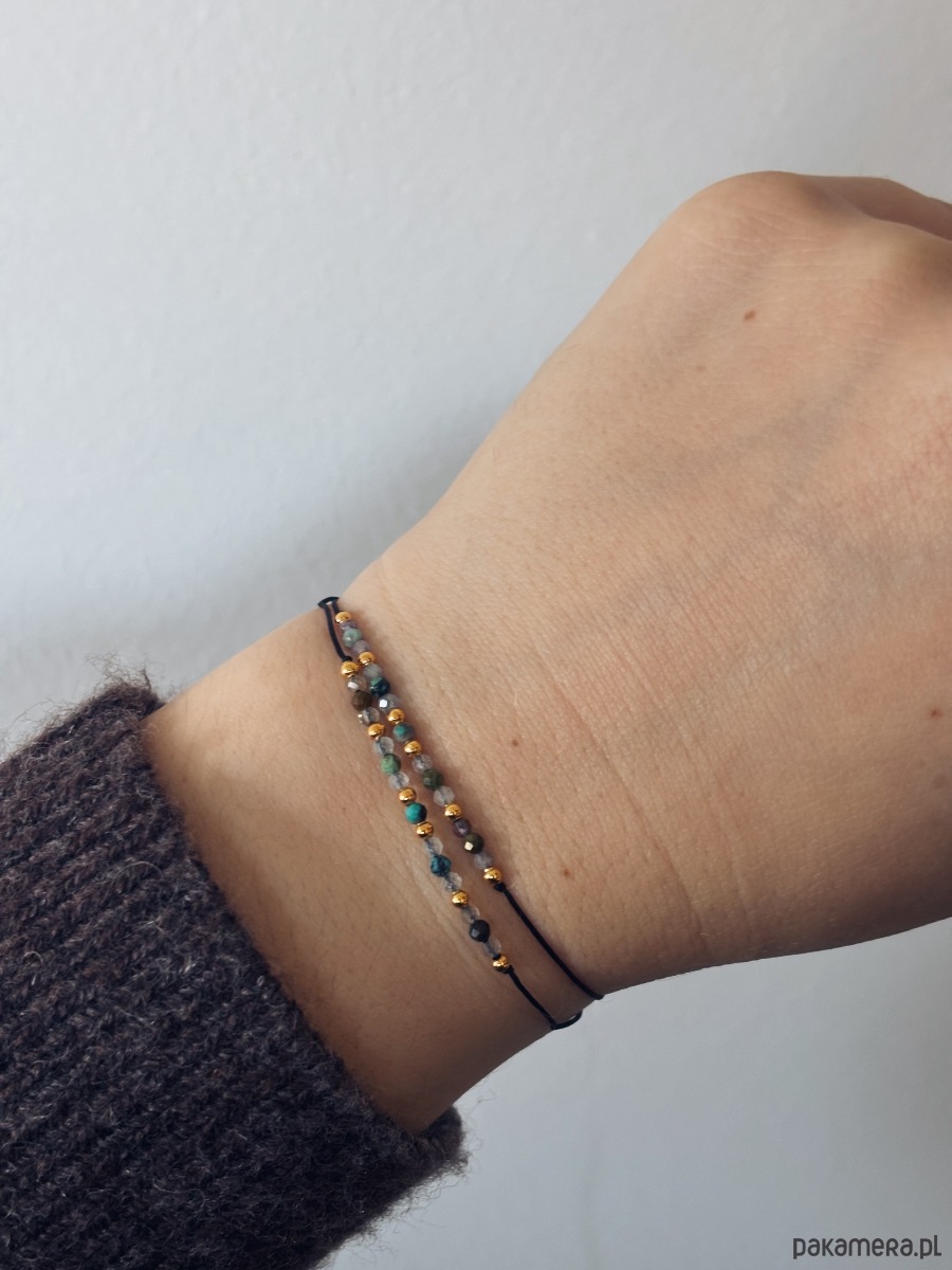 Ręcznie wykonana bransoletka z trzech kamieni harmonii i inspiracji- ametystu, akwamarynu i turkusu. Delikatne, starannie wyselekcjonowane kamienie o średnicy 2mm zostały osadzone na trwały nylonowy sznurek z regulowanym zapięciem, dzięki czemu bransoletka idealnie dopasowuje się do każdej dłoni.