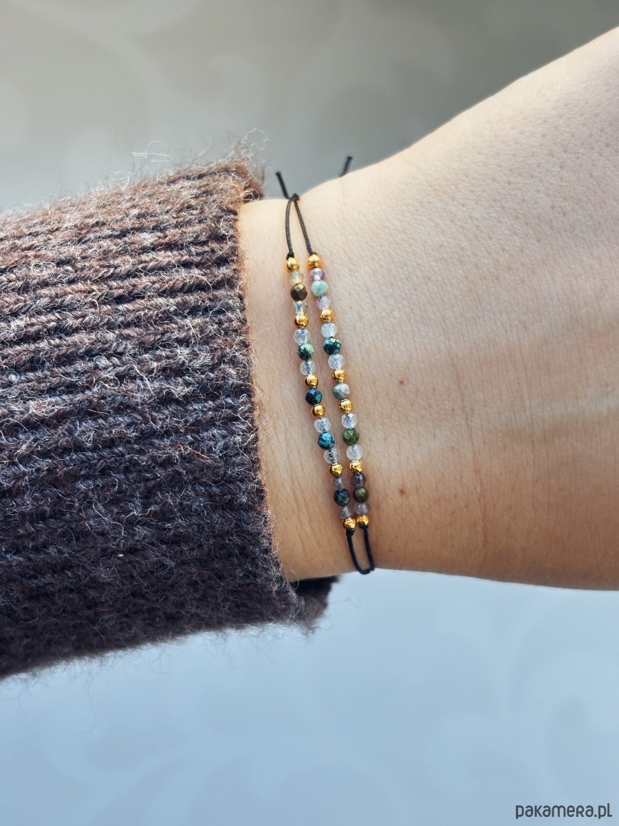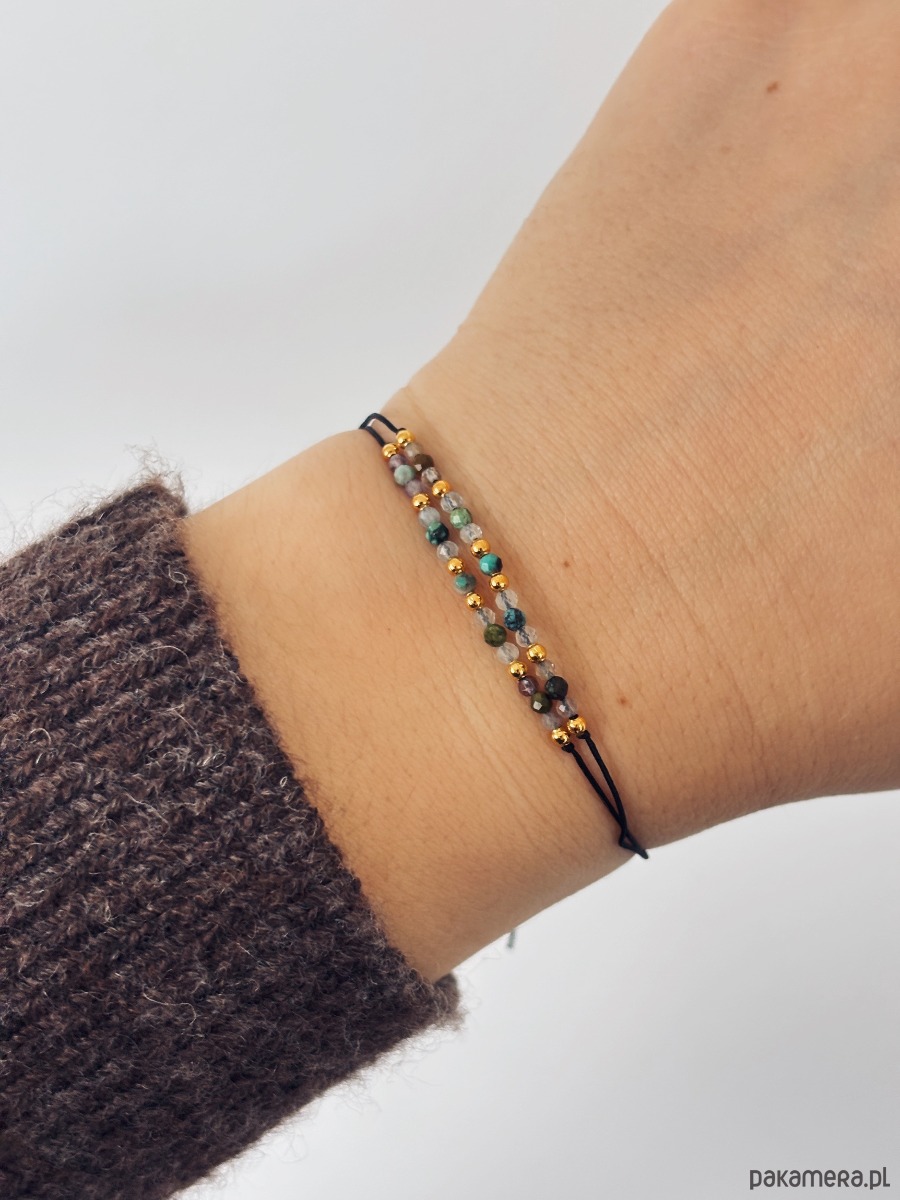 Ręcznie wykonana bransoletka z trzech kamieni harmonii i inspiracji- ametystu, akwamarynu i turkusu. Delikatne, starannie wyselekcjonowane kamienie o średnicy 2mm zostały osadzone na trwały nylonowy sznurek z regulowanym zapięciem, dzięki czemu bransoletka idealnie dopasowuje się do każdej dłoni.