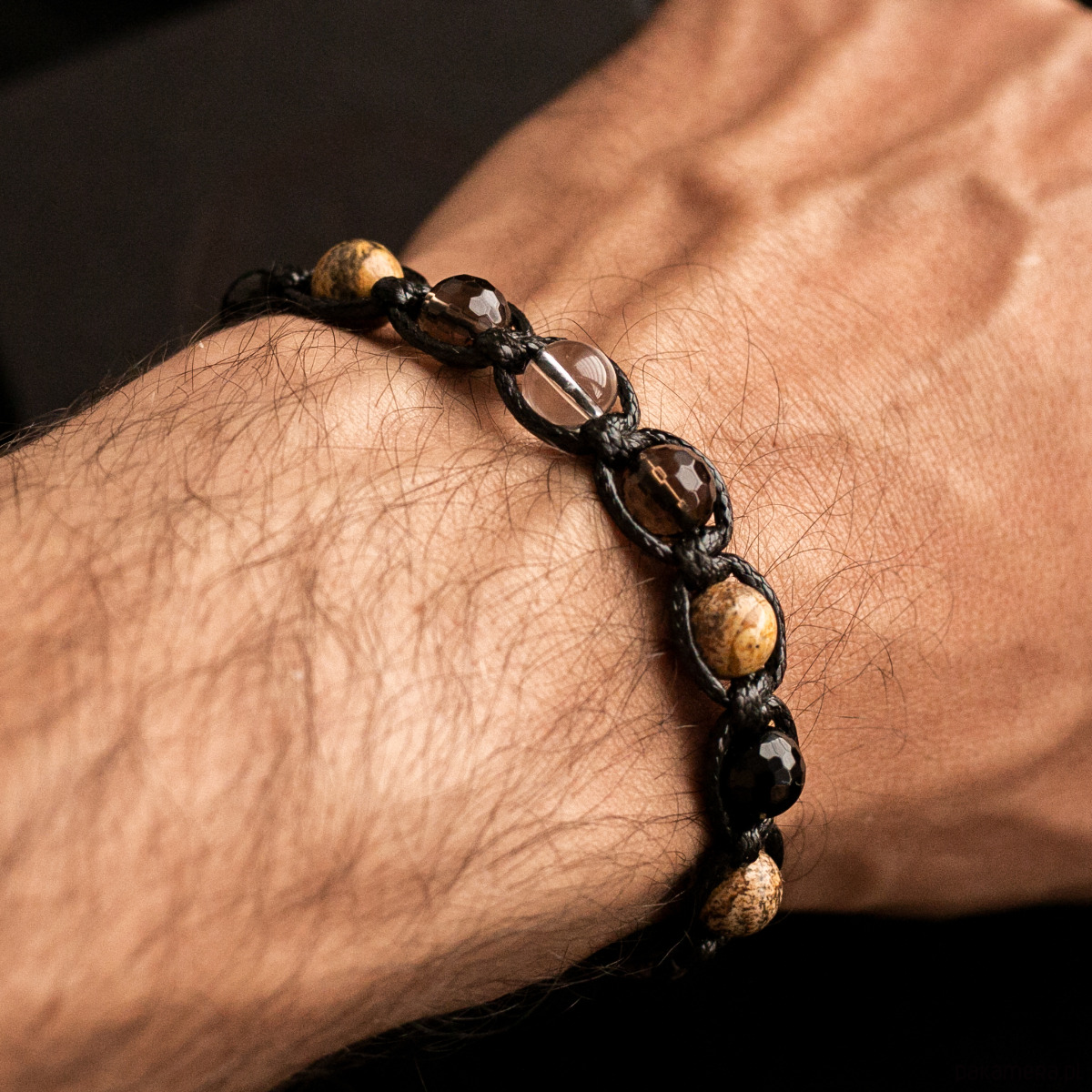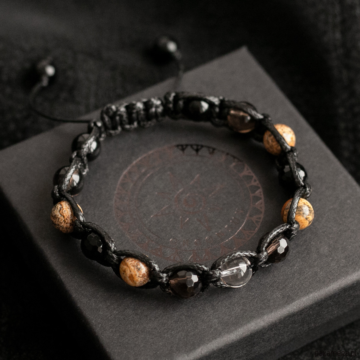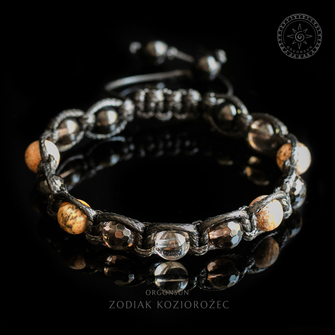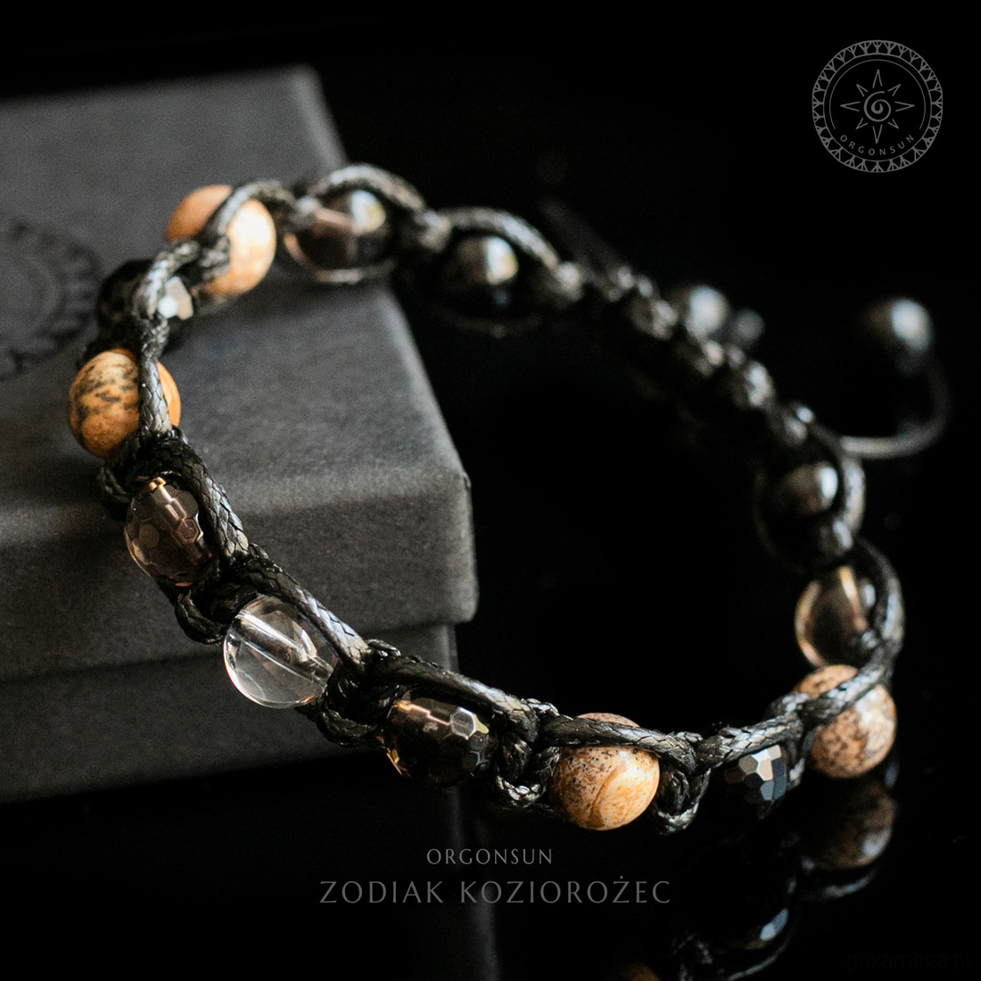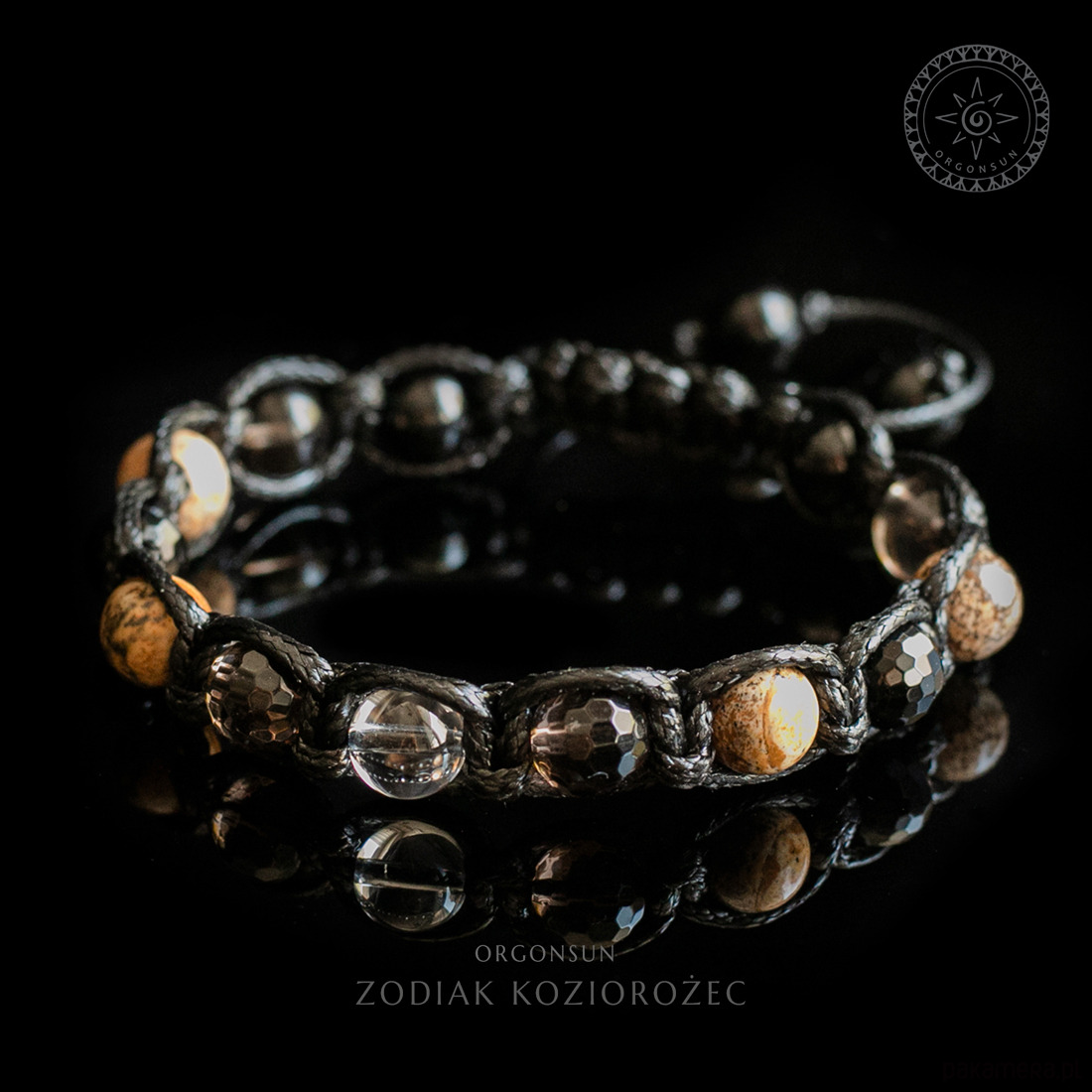 Zodiak Koziorożec - bransoletka męska została wykonana z kamieni naturalnych dla zodiakalnych Koziorożców: Jaspis, Kryształ Górski, Kwarc Dymny, Turmalin i Onyks.