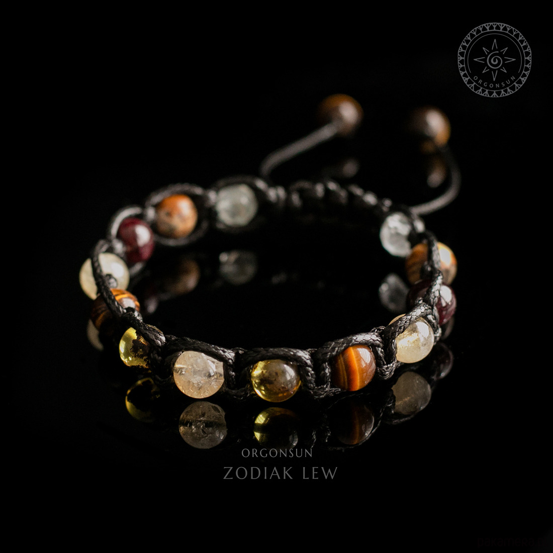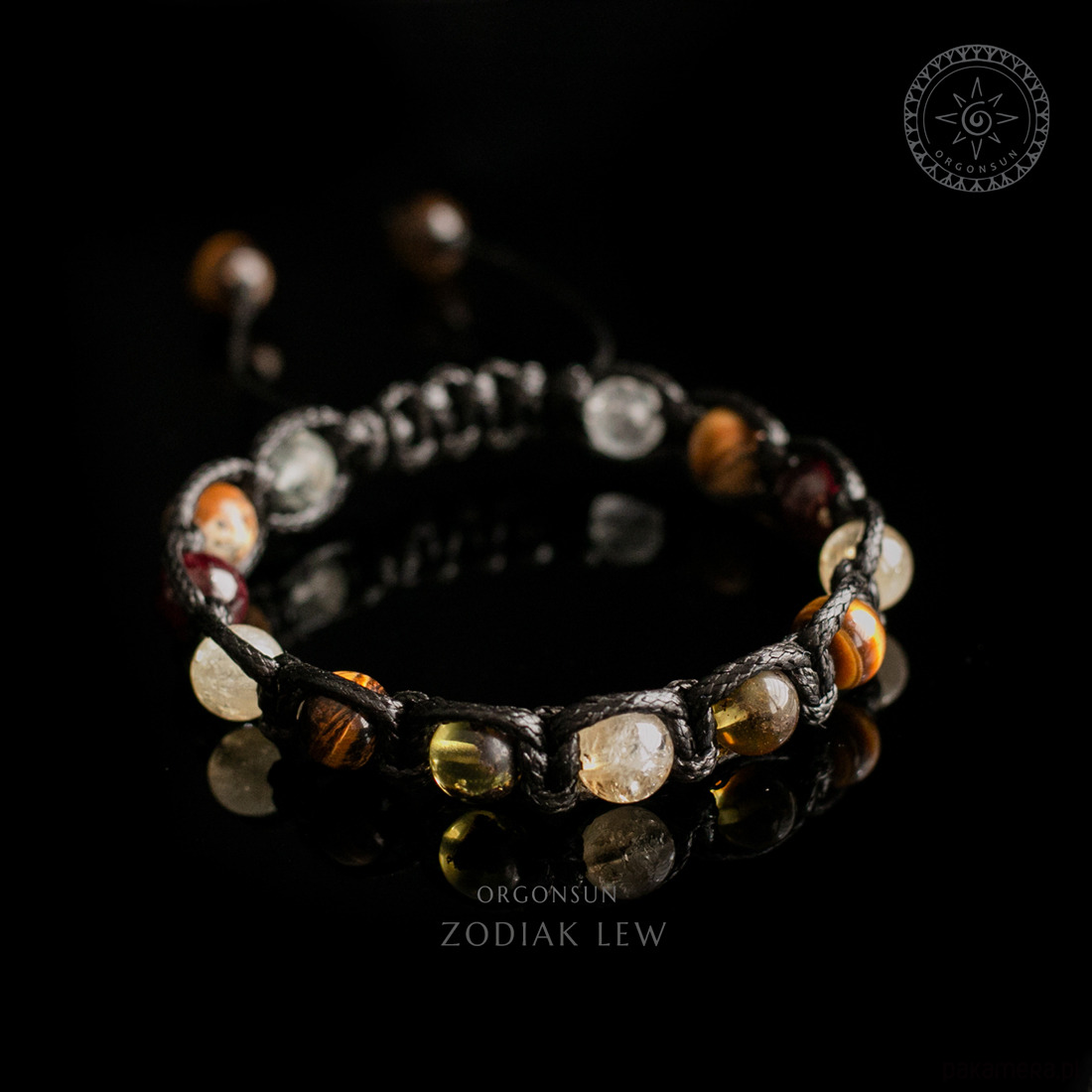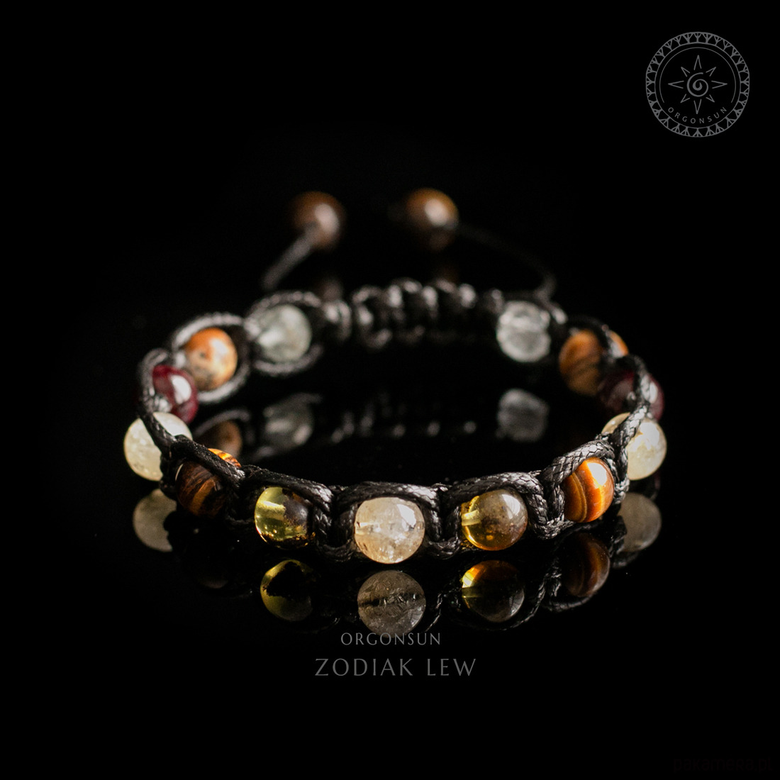 Zodiak Lew - bransoletka męska została wykonana z kamieni naturalnych dla zodiakalnych Lwów: Tygrysie Oko, Cytryn, Bursztyn, Granat, Topaz i Jaspis.