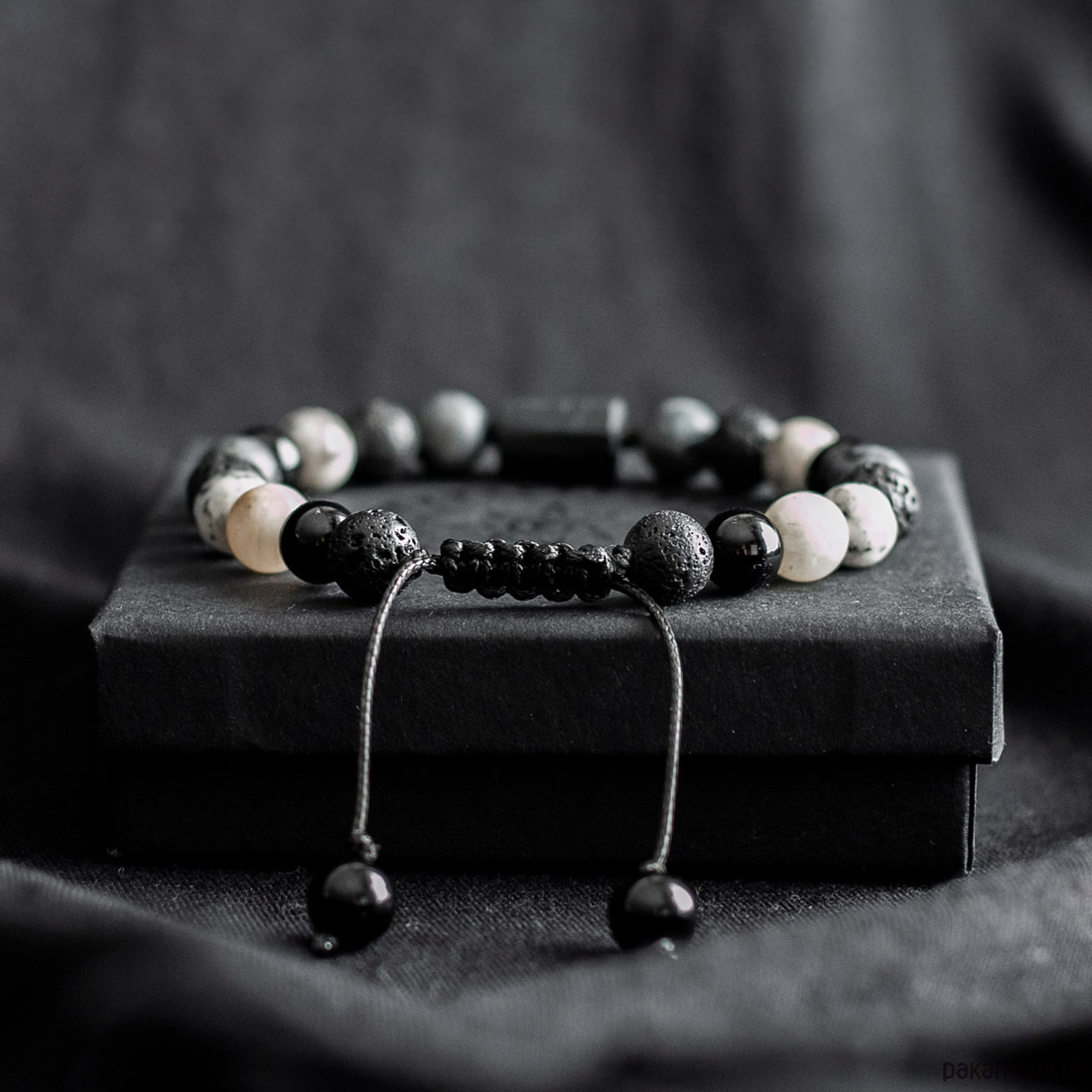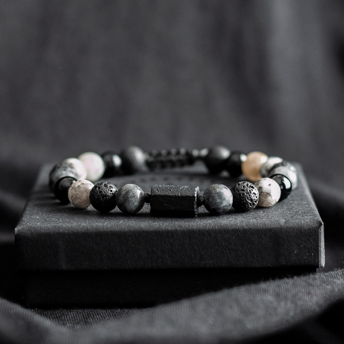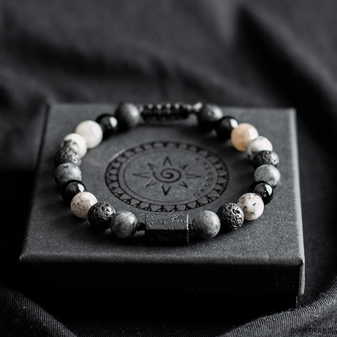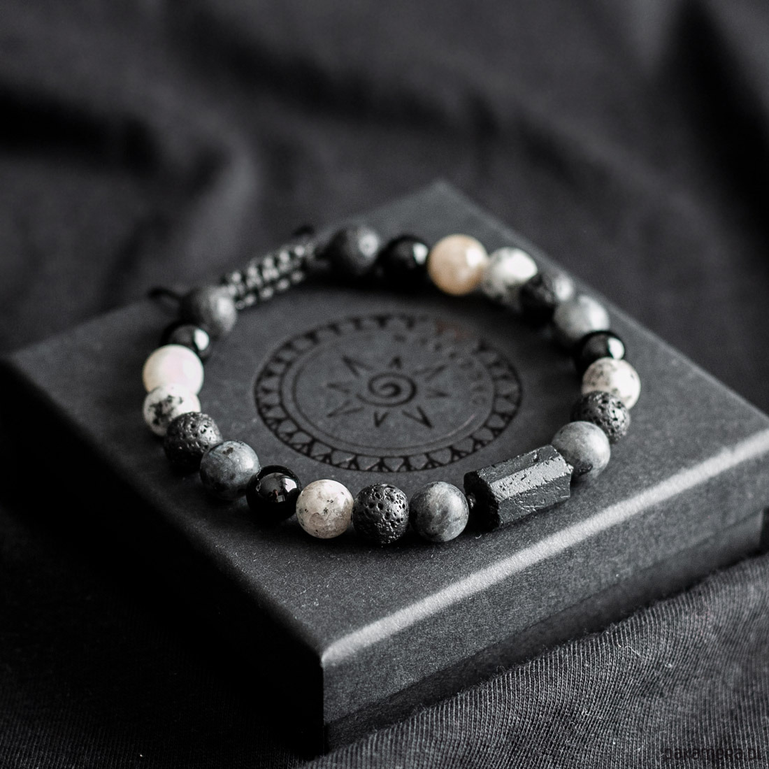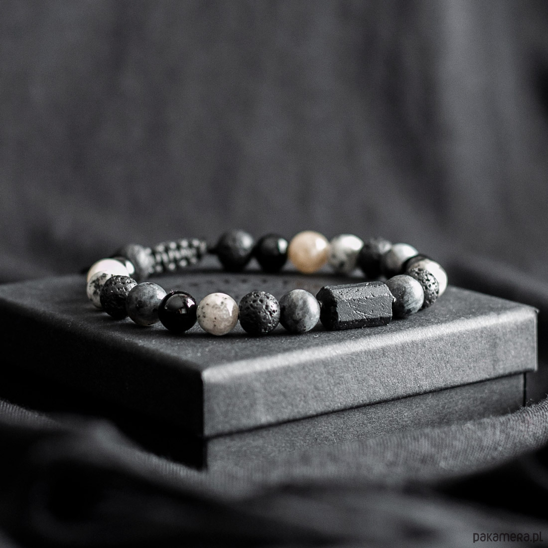 Zodiak Rak – Bransoletka męska stworzona dla zodiakalnego Raka. Łączy w sobie potężne kamienie: Kamień Księżycowy, Jadeit, Larvikit, Turmalin, Onyks i Kamień Wulkaniczny.