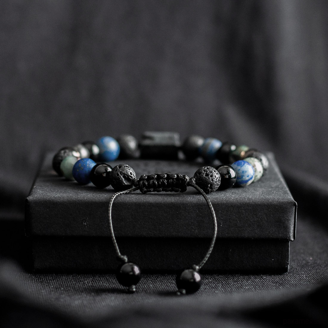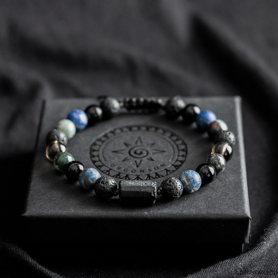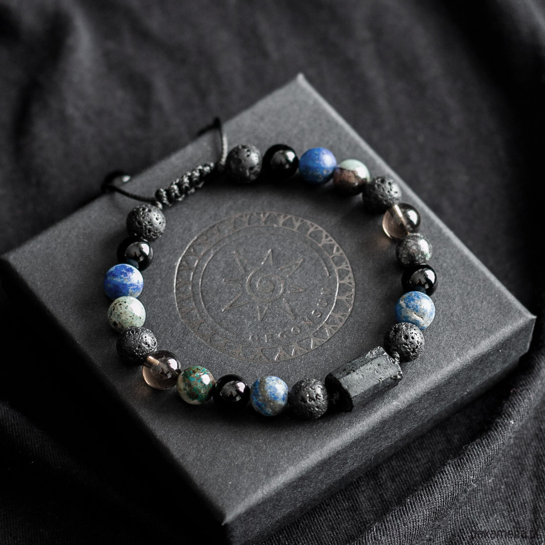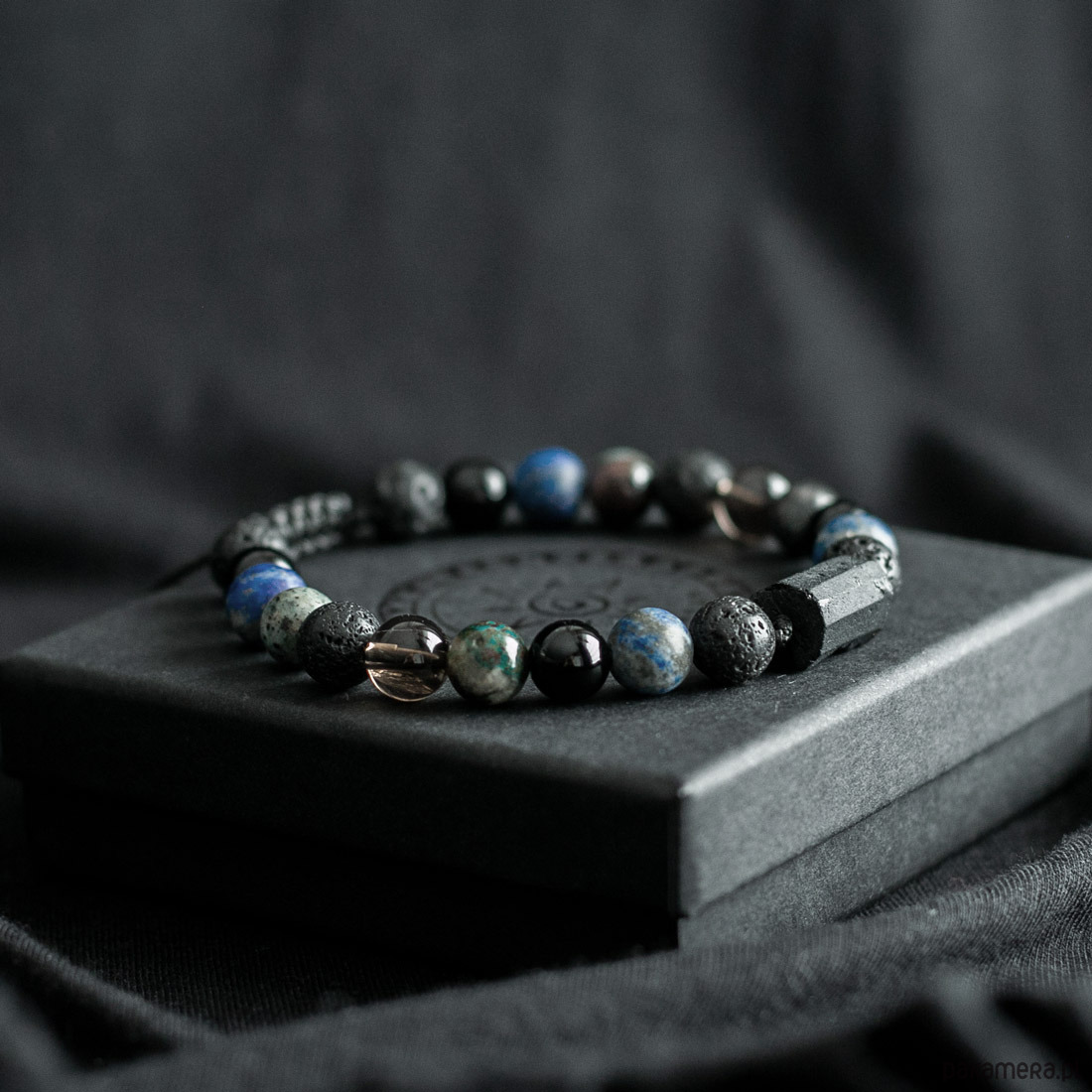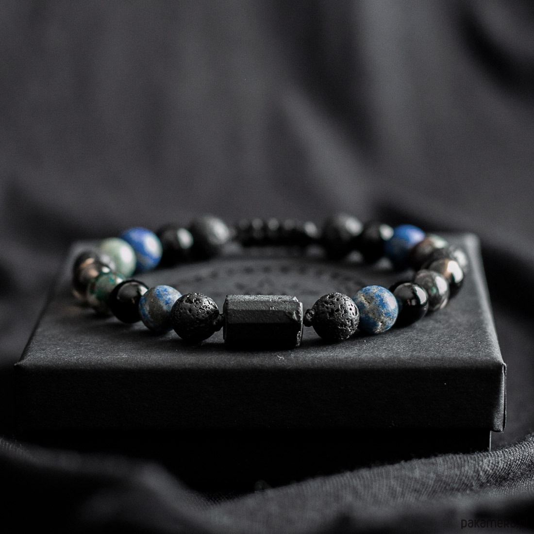 Materiał: Kamienie naturalne: Surowy Turmalin – Bryła, Lapis Lazuli, Turkus, Kwarc Dymny, Onyks i Kamień Wulkaniczny o średnicy 8mm. Są to kamienie naturalne dlatego kamienie mogą różnić się nieznacznie wyglądem.