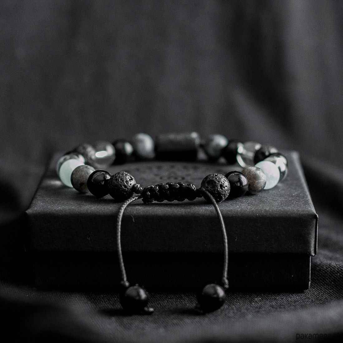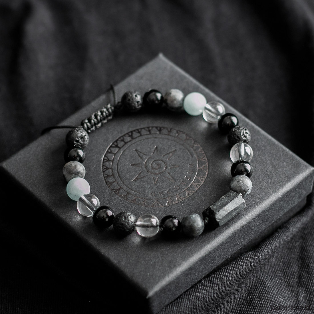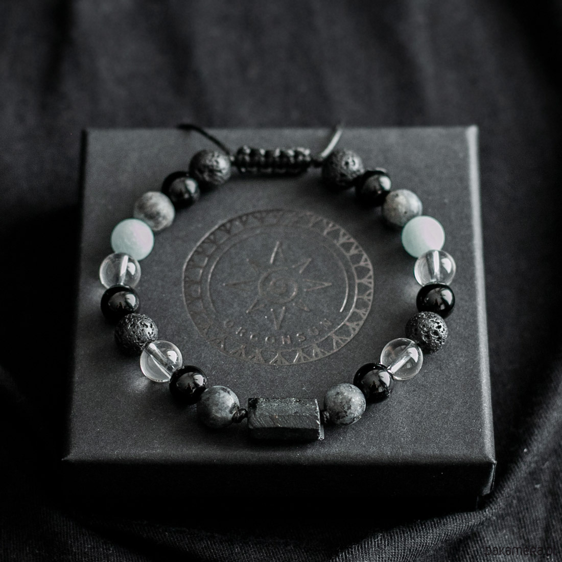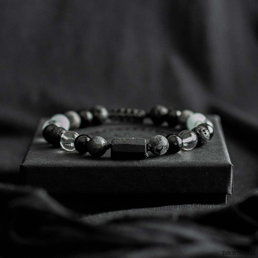 Zodiak Wodnik - bransoletka męska stworzona dla zodiakalnego Wodnika. Wykonana jest z kamieni naturalnych: Akwamaryn Larvikit, Kryształ Górski, Turmalin, Onyks i Kamień Wulkaniczny.