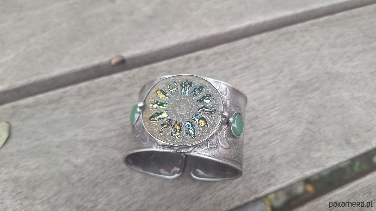 Bransoletka wykonana z miedzi, cyny i awenturynów. Szerokość 4 cm. Regulowana.