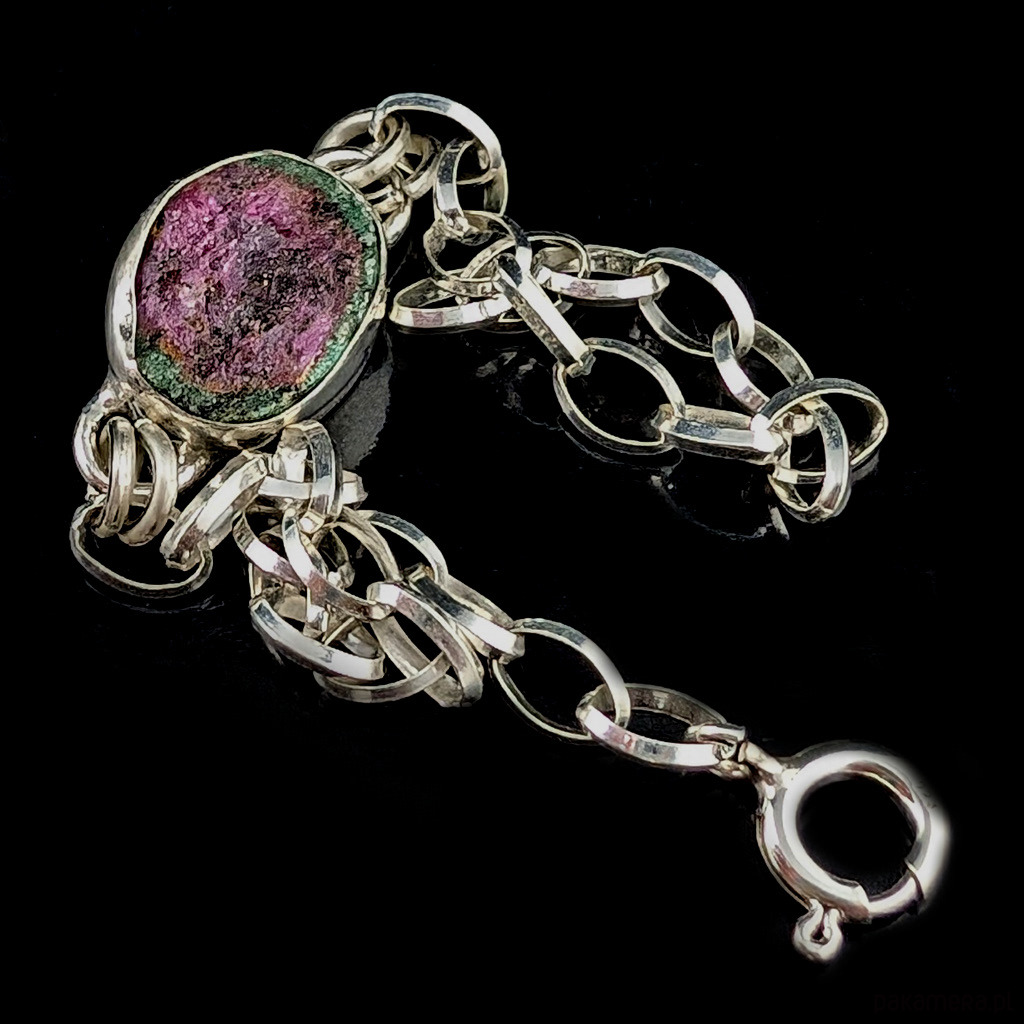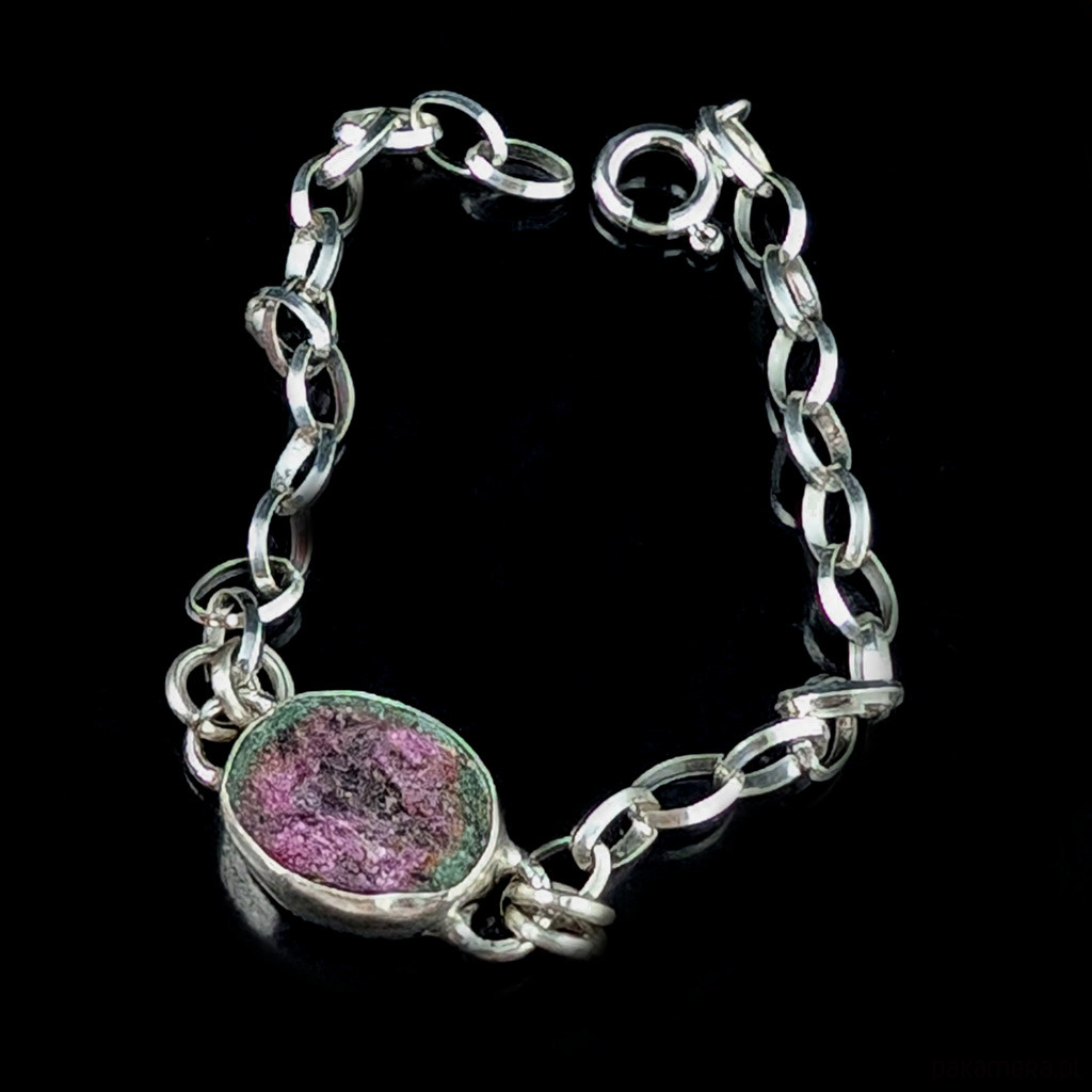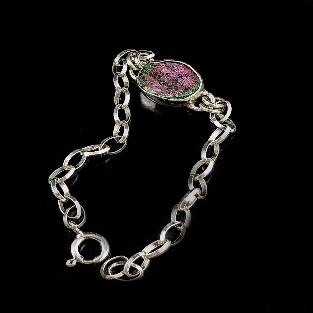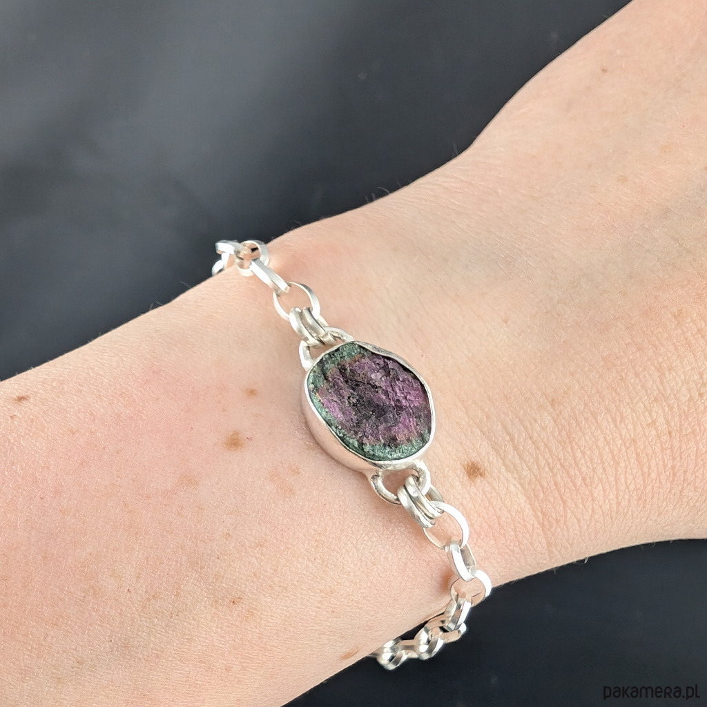Naturalny, surowy zoisyt z wtrętem rubinu zakomponowany w srebrną, elegancką bransoletę. Oprawa srebra próby 925 ma 17 x 13 mm, waga 7 g. Piękne barwy minerału połyskującego w świetle drobinkami kryształów. Długość bransoletki 18,5 grama, możliwa zmiana owodu. Wysłana zostanie w ozdobnym pudełeczku. Idealna na prezent.