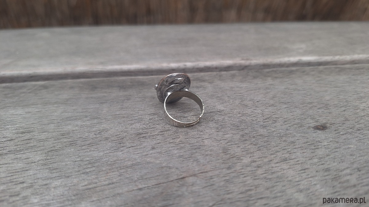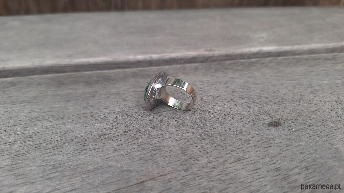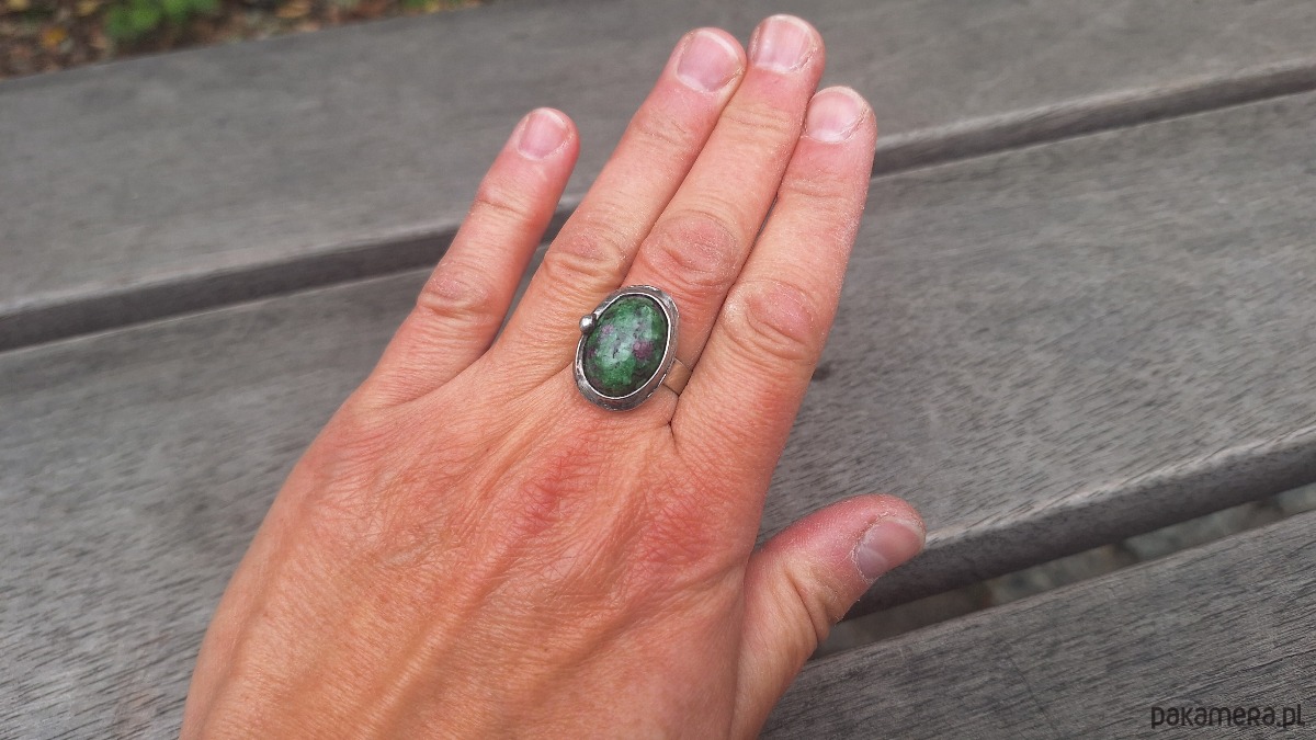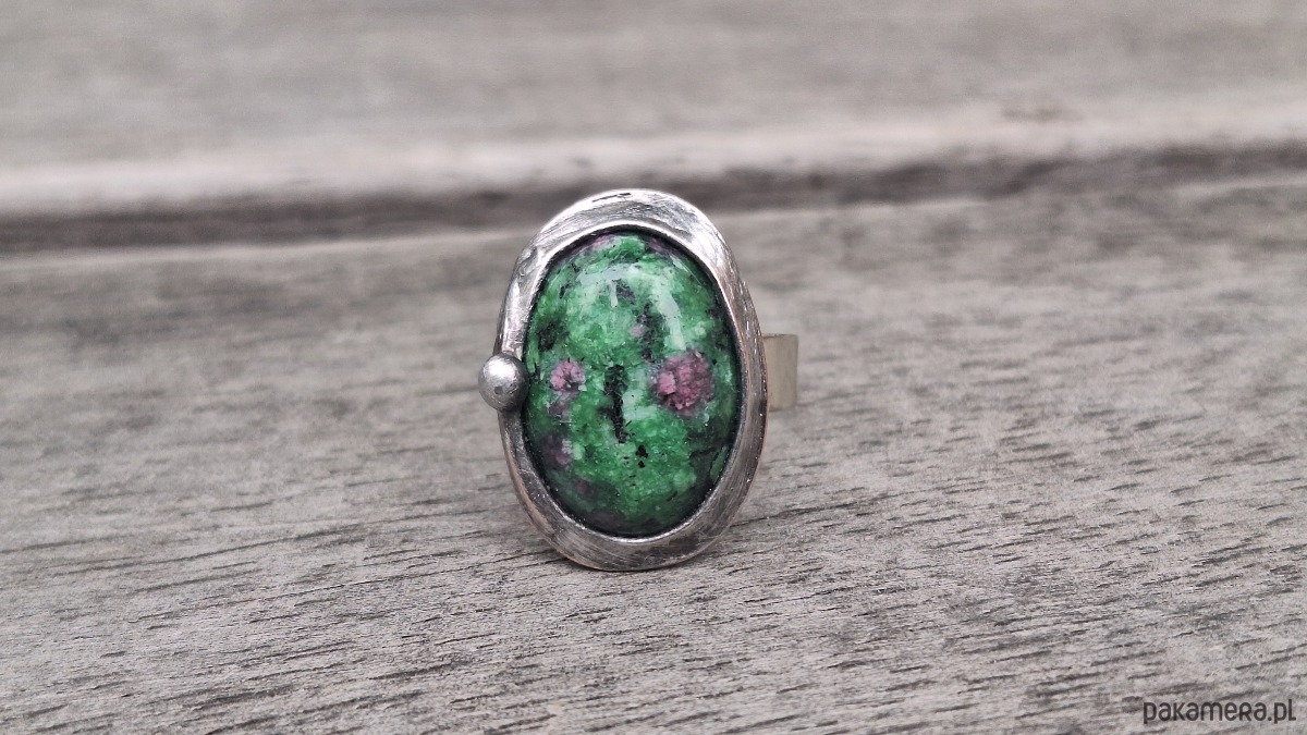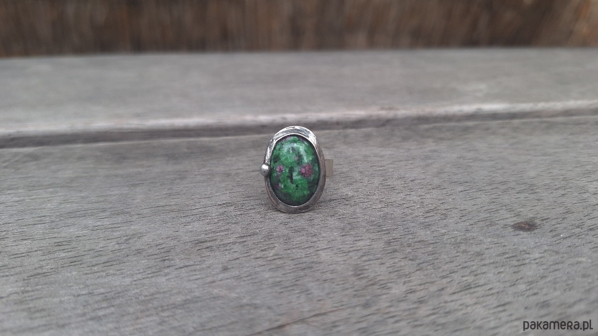 Pierścionek wykonany z miedzi, cyny i zoisytu z rubinem. Wymiary ok. 2 na 1.5 cm. Regulowany. Nie jest ciężki.
