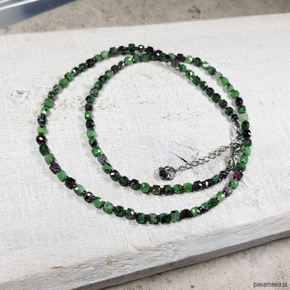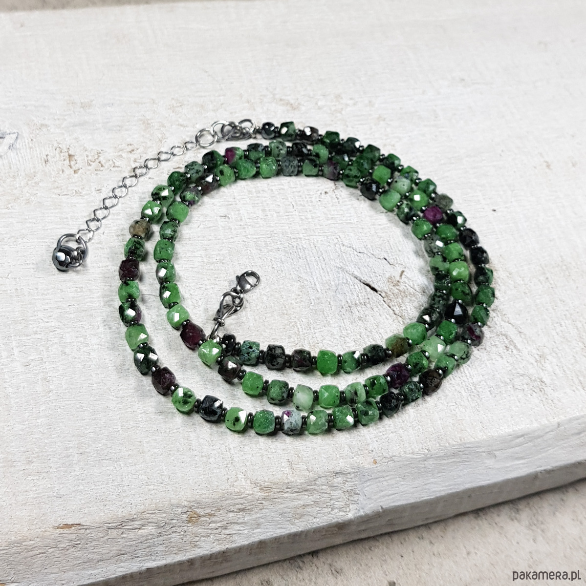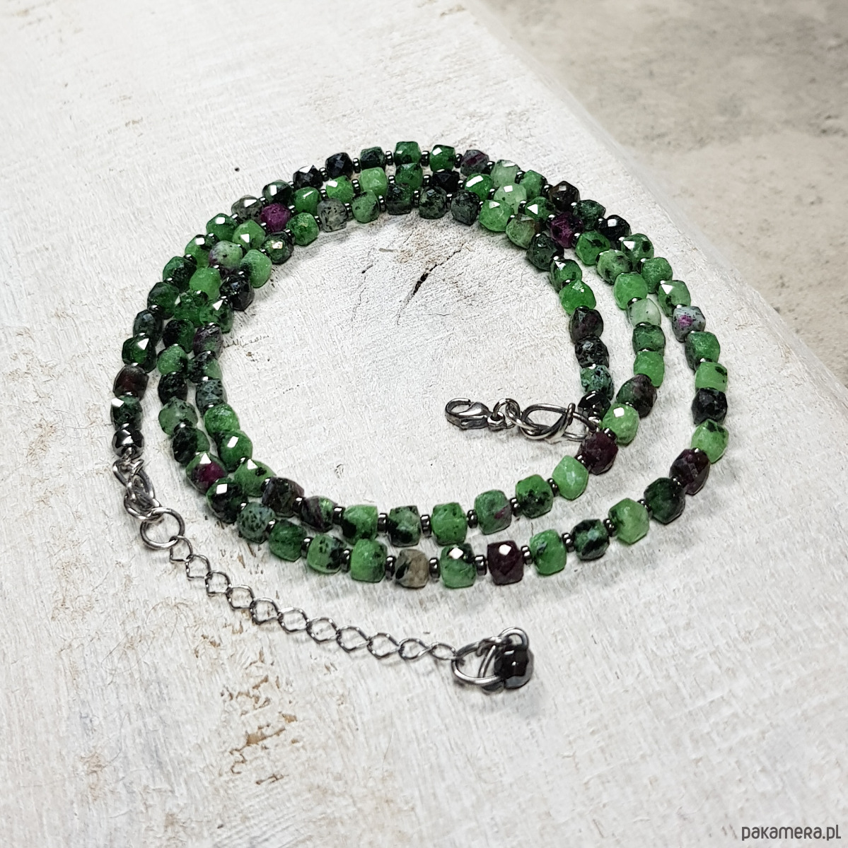 Sznur korali wykonany ręcznie z naturalnych kostek 4mm zoisytu z rubinem i z 1mm przekładek hematytu. Wykończenia i zapięcie wykonane w srebrze 925, oksydowanym i wypolerowanym. Długość korali wynosi ok. 53,5cm plus przedłużka 3,5cm.