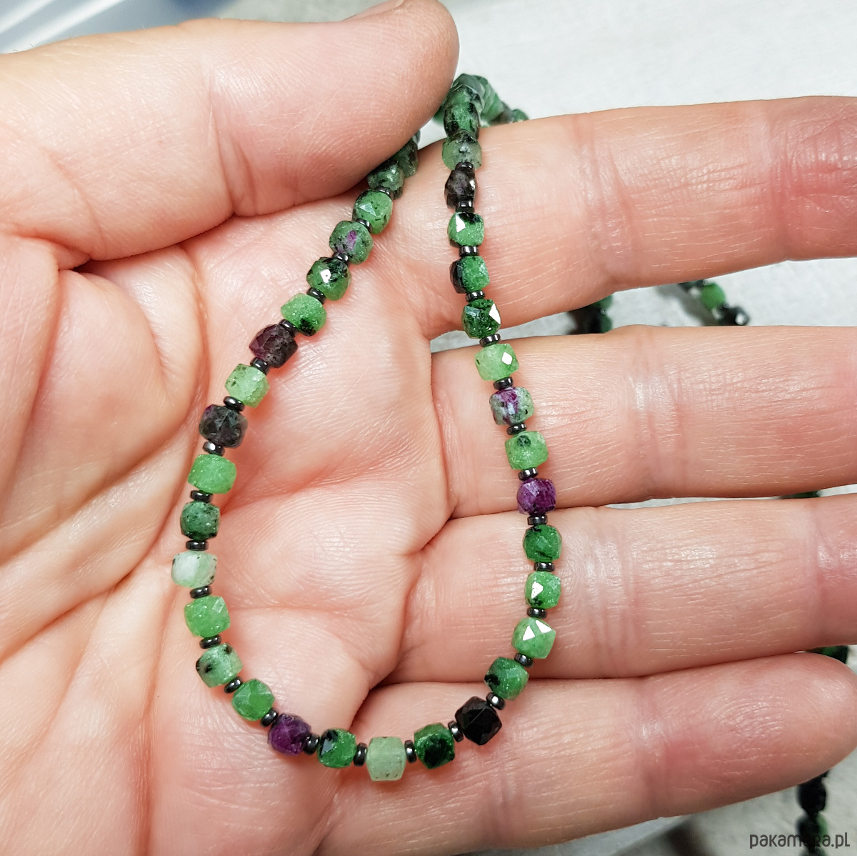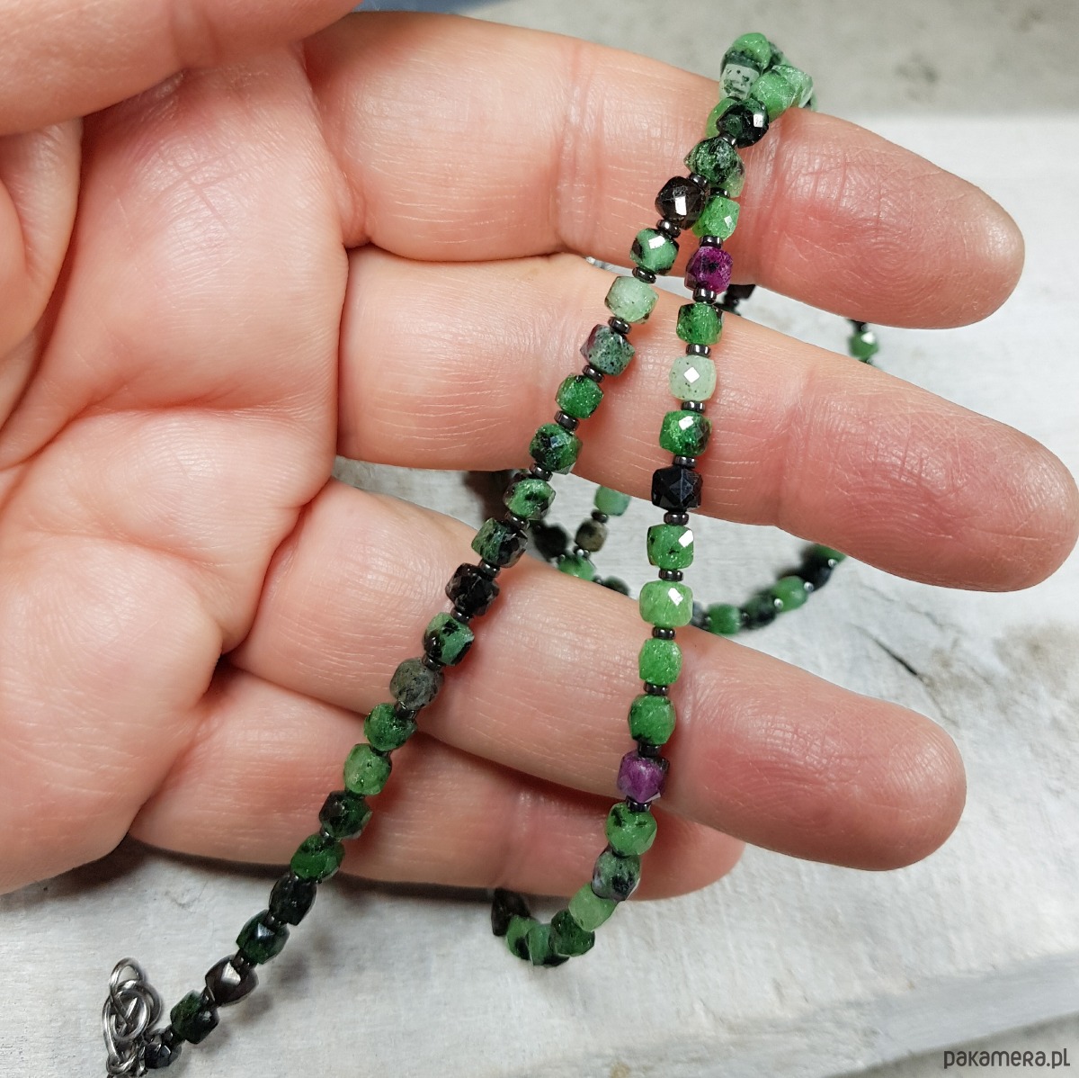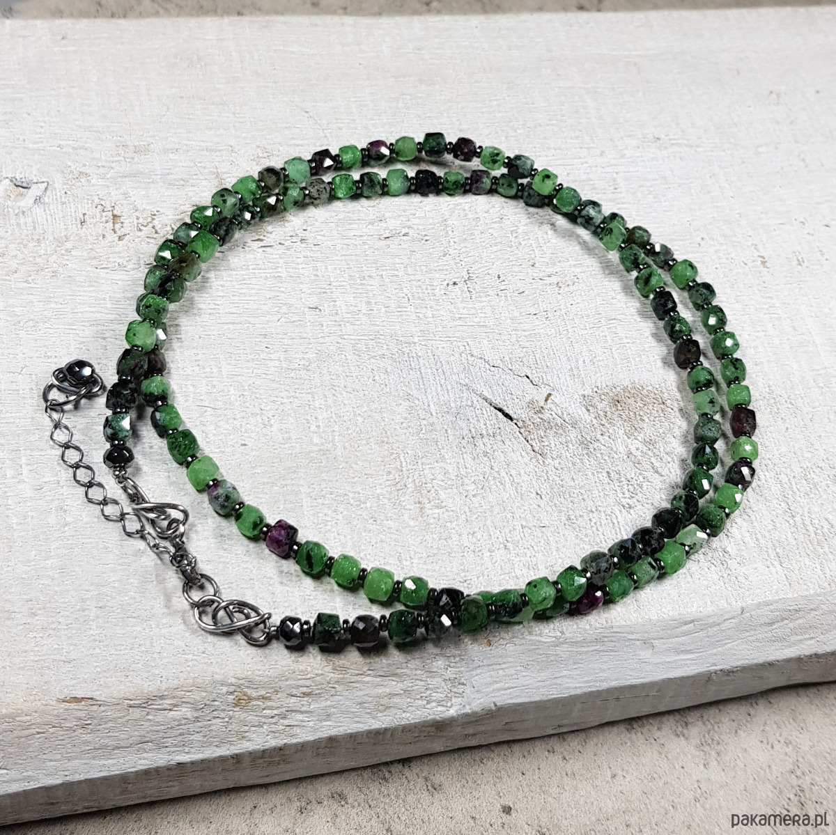 Sznur korali wykonany ręcznie z naturalnych kostek 4mm zoisytu z rubinem i z 1mm przekładek hematytu. Wykończenia i zapięcie wykonane w srebrze 925, oksydowanym i wypolerowanym. Długość korali wynosi ok. 53,5cm plus przedłużka 3,5cm.