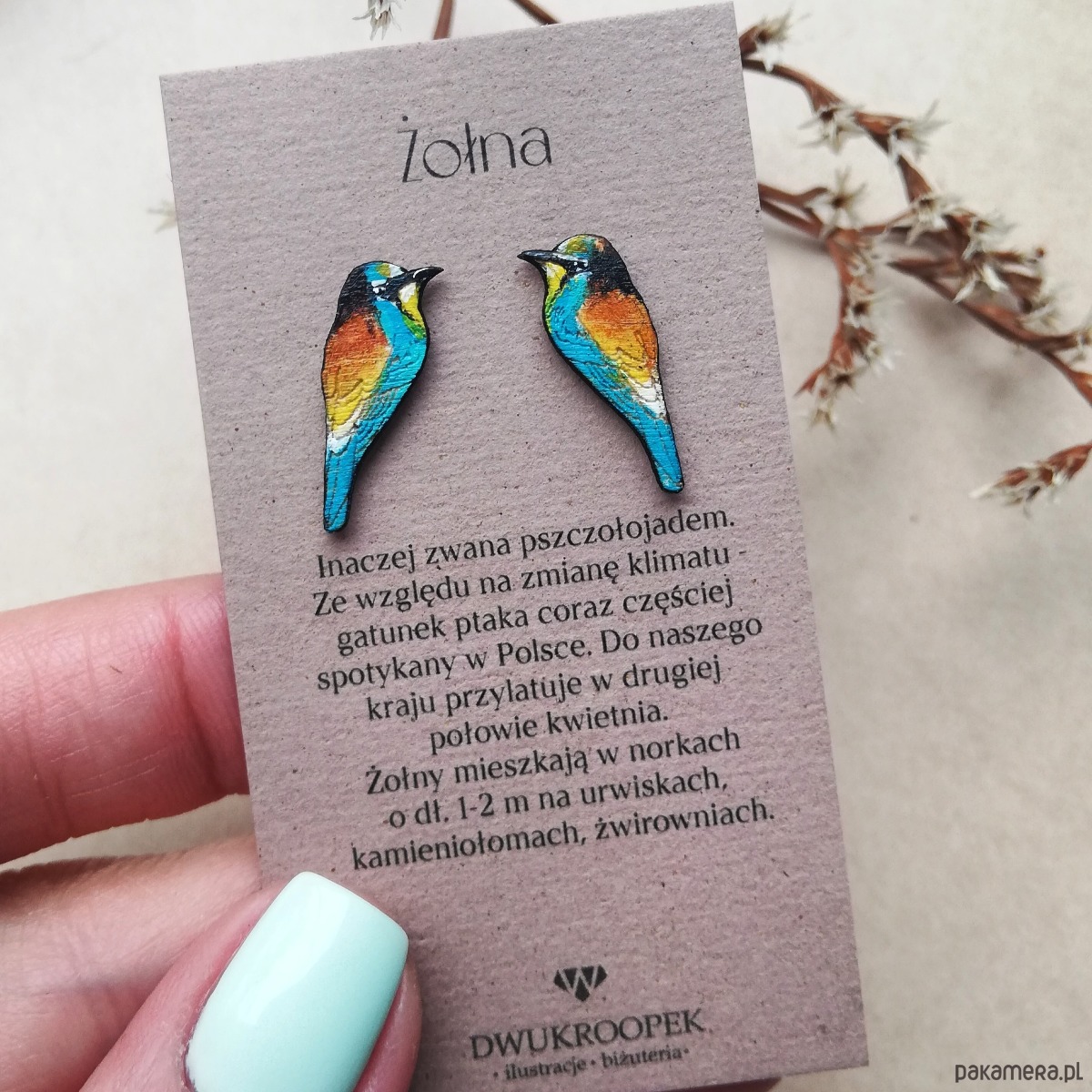 Lekkie kolczyki-sztyfty wycinane według autorskiego rysunku w drewnie i ręcznie malowane. Każda para będzie niepowtarzalna. Wielkość kolczyków ok 1,5cm. Sztyfty nie uczulą, bo są z silikonu!