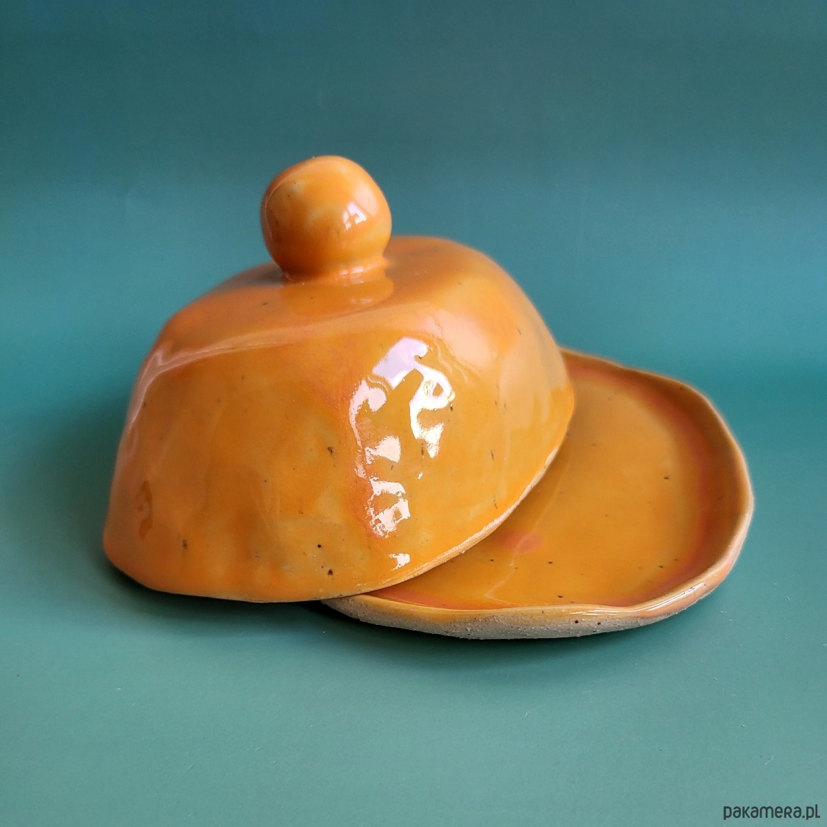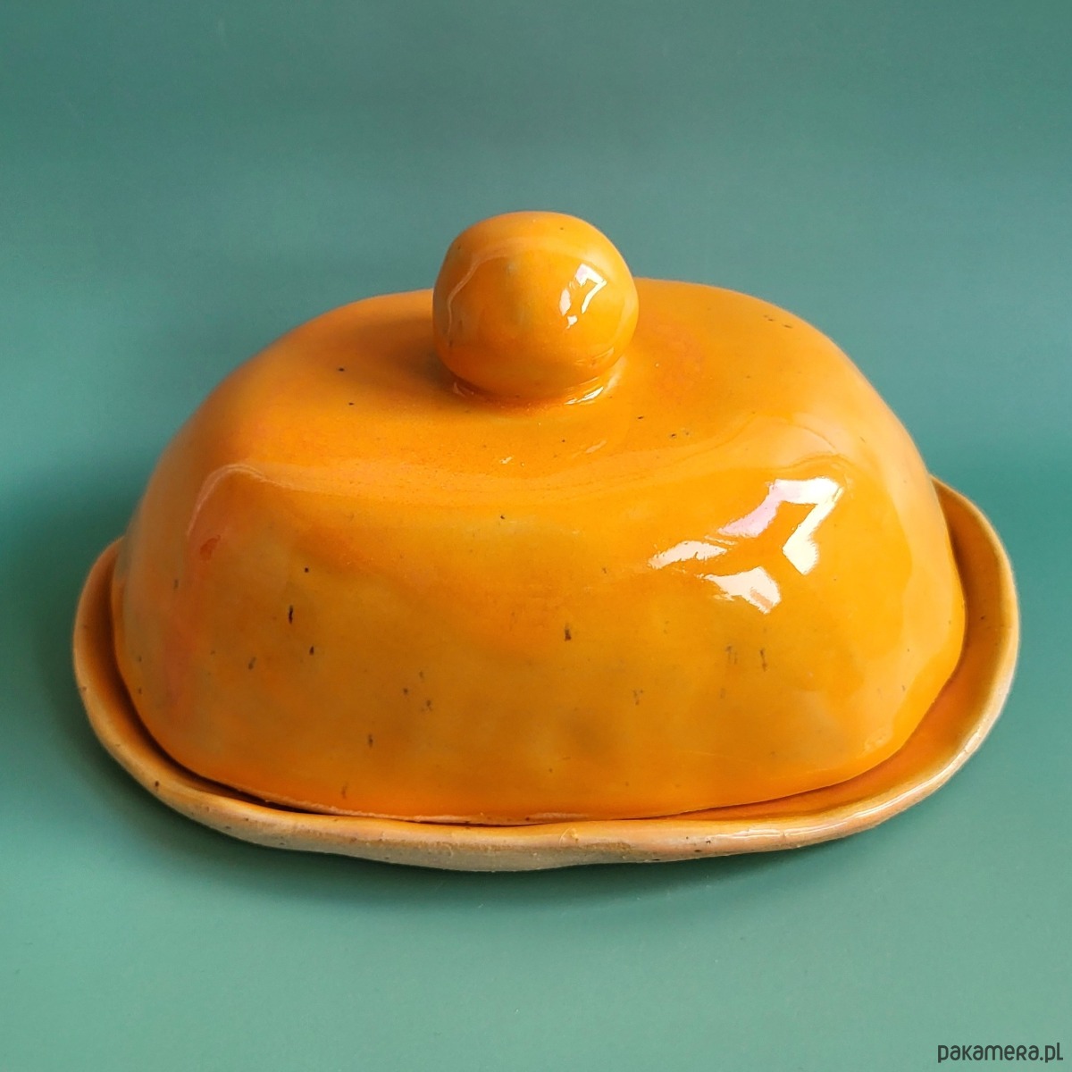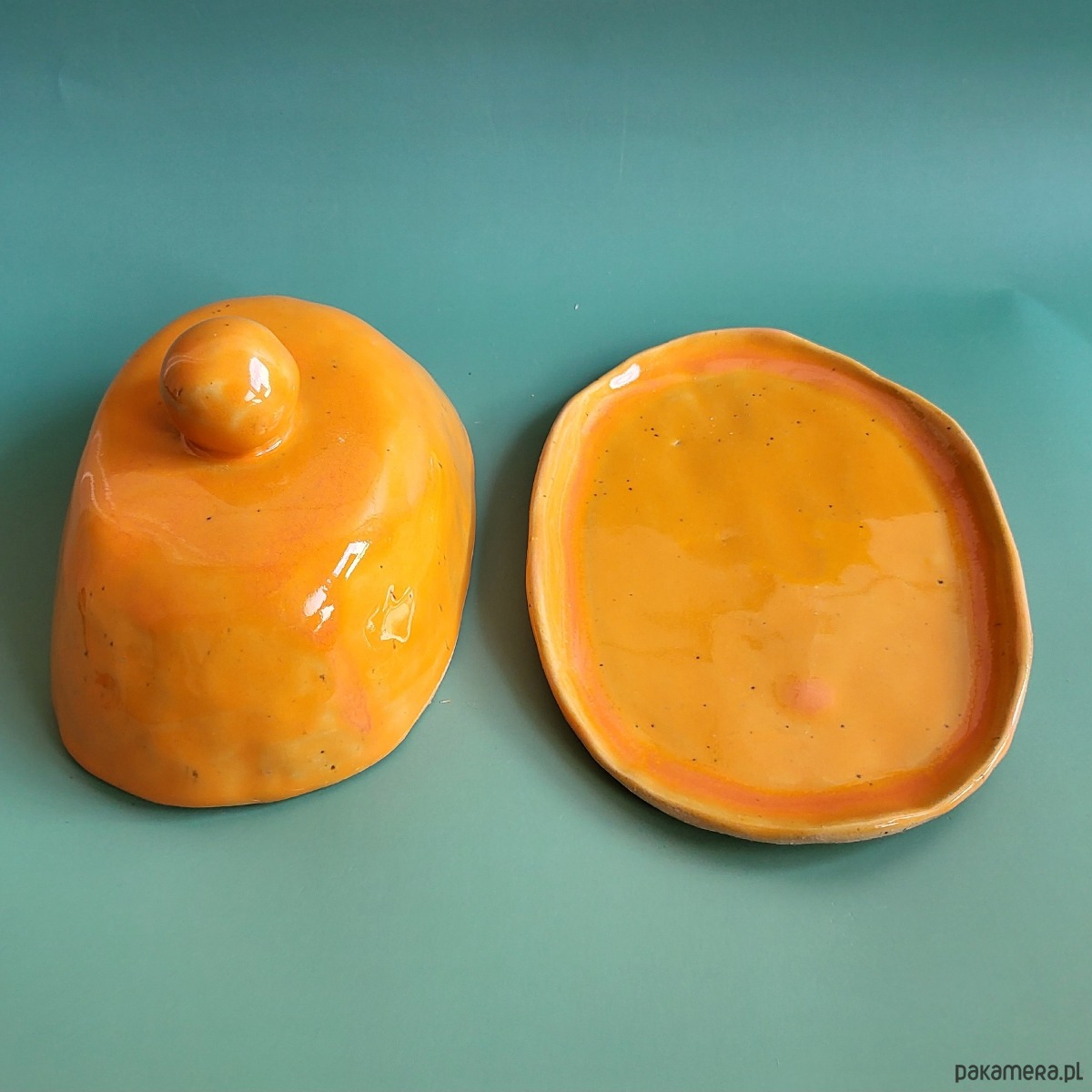 Ręcznie robiona ceramika do codziennego użytku — żółta maselniczka ceramiczna Kurki