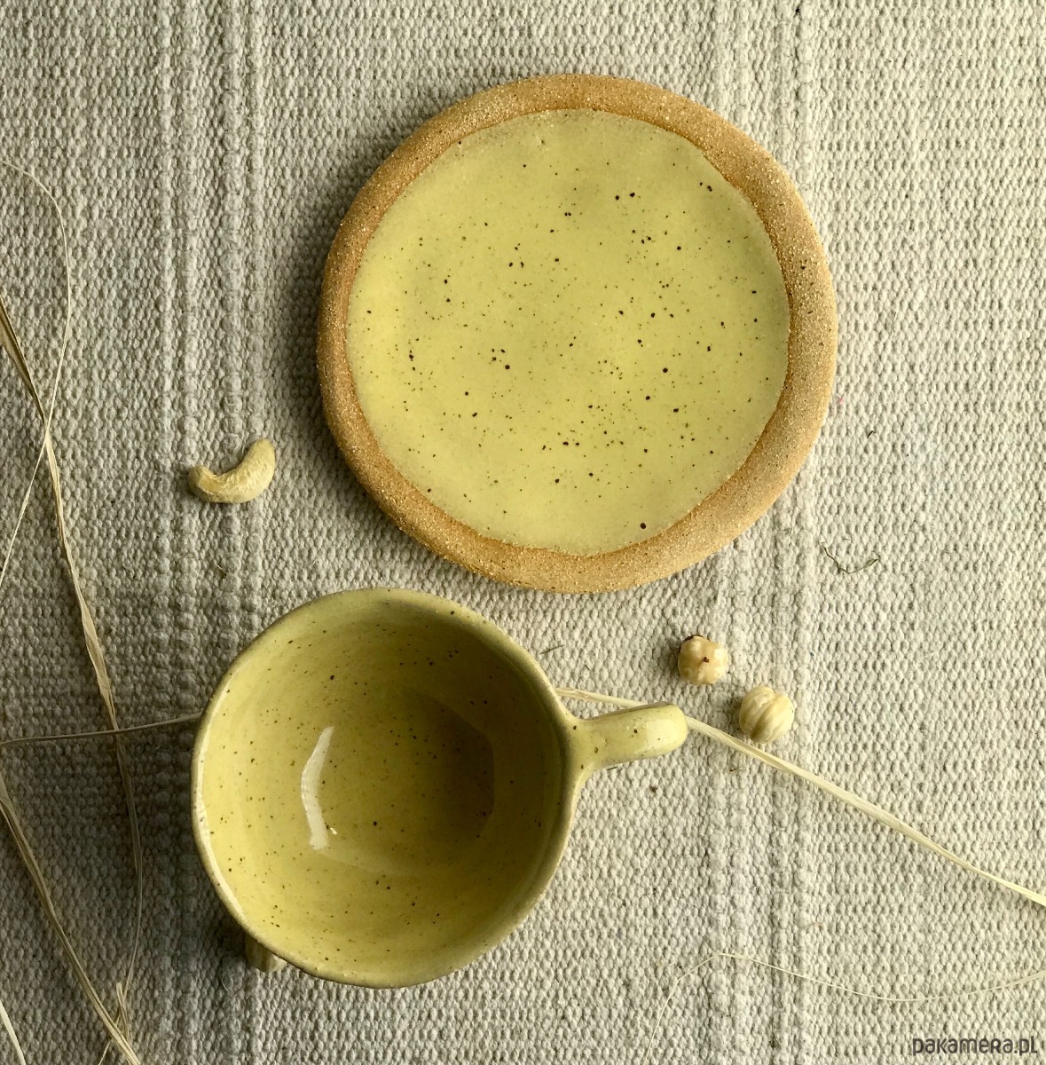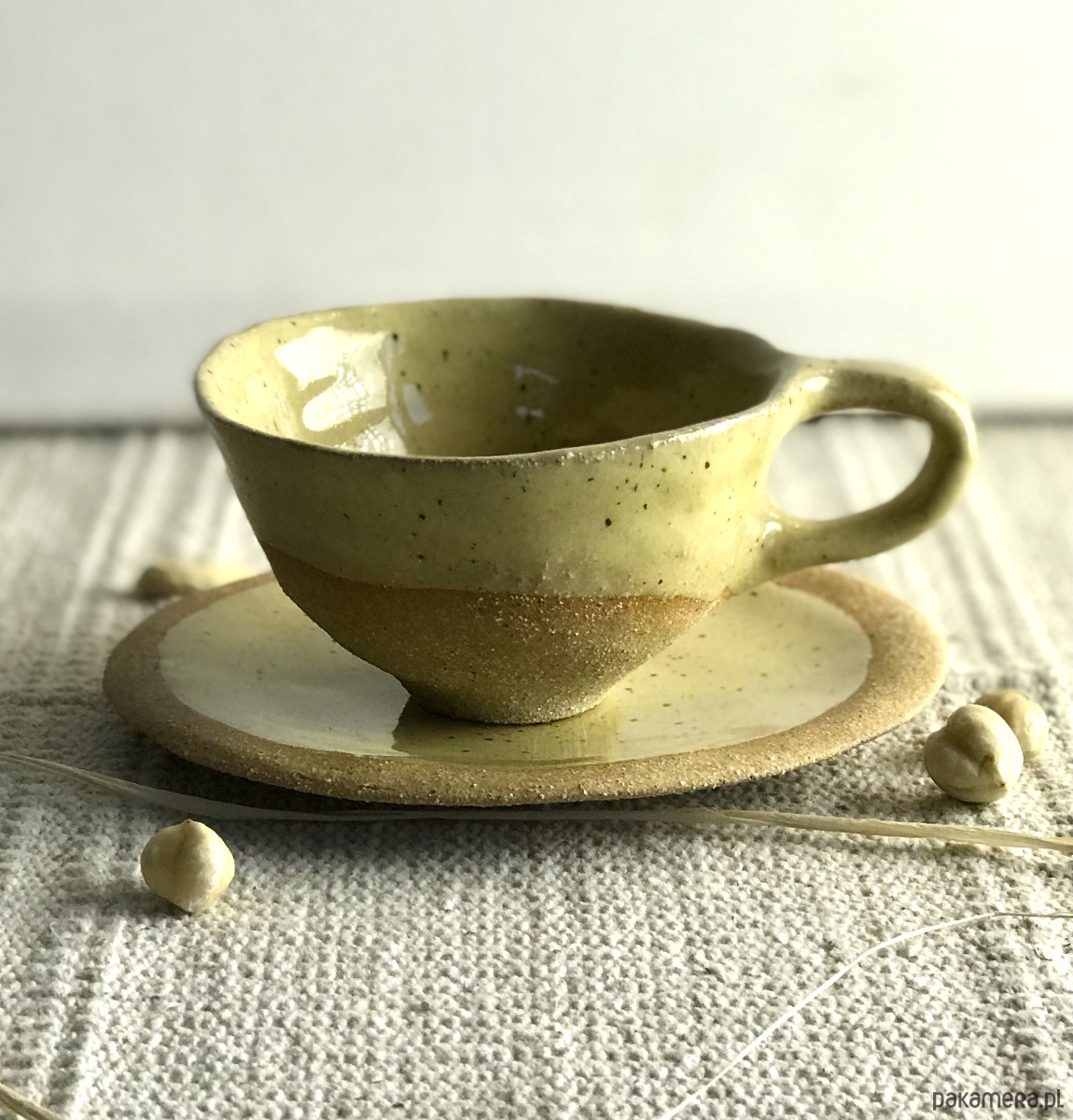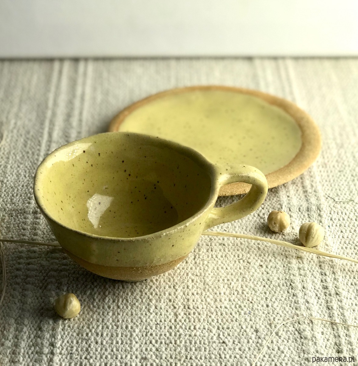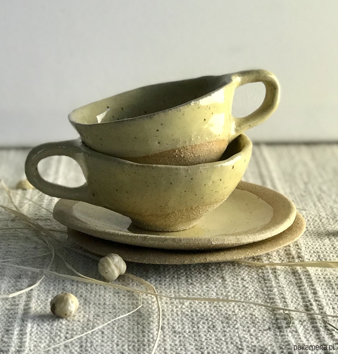 Naczynia (filiżanka + talerzyk) zostały wykonane z gliny i poszkliwione na kolor żółty z delikatnymi kropeczkami.. Uwydatniona faktura gliny nadaje zestawowi oryginalny, rustykalny charakter.