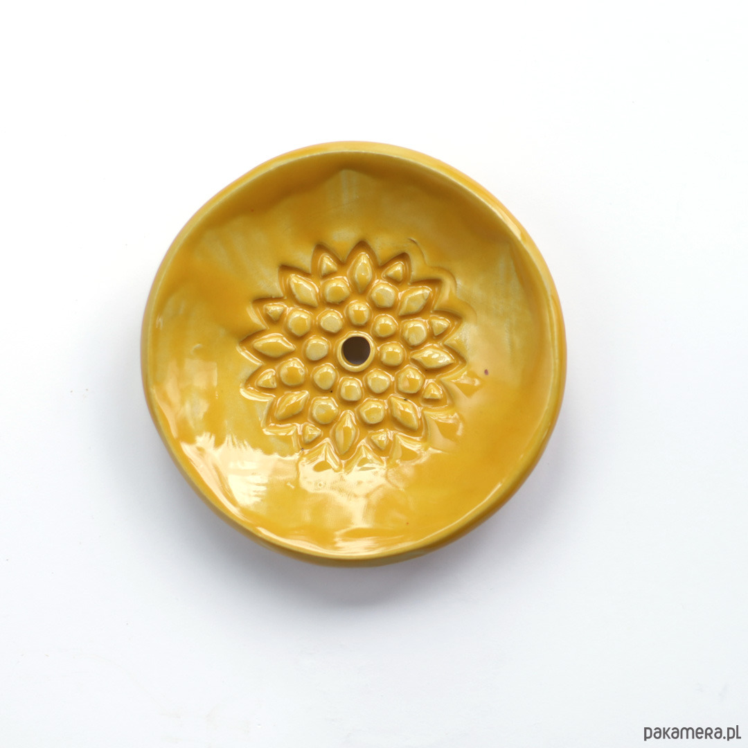 Mydelniczka ulepiona ręcznie z białej gliny. Zdobiona wzorem mandali i poszkliwiona błyszczącym szkliwem . Posiada dziurkę na odpływ wody oraz stopki. Odporna na wodę i wysokie temperatury.