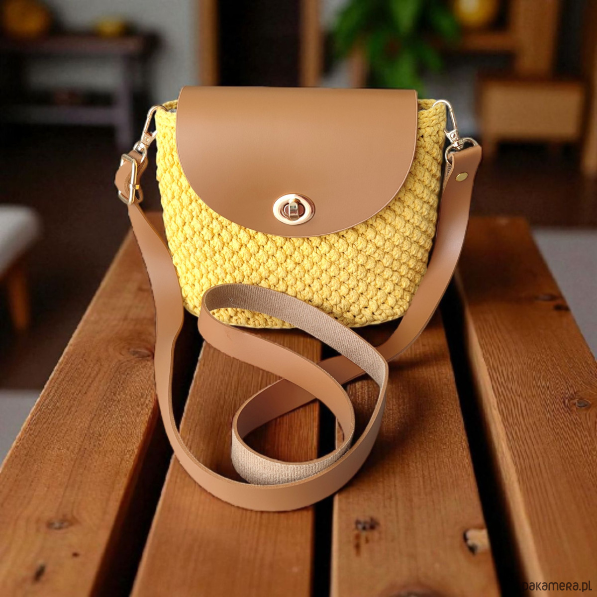 Żółta torebka kuferek wykonana ręcznie ze sznurka bawełnianego z brązową klapką z eko skóry to połączenie stylu i ekologii. Unikalny design sprawia, że wyróżnisz się w każdej stylizacji. Lekka, praktyczna i modna – idealna na co dzień i wyjątkowe okazje.
