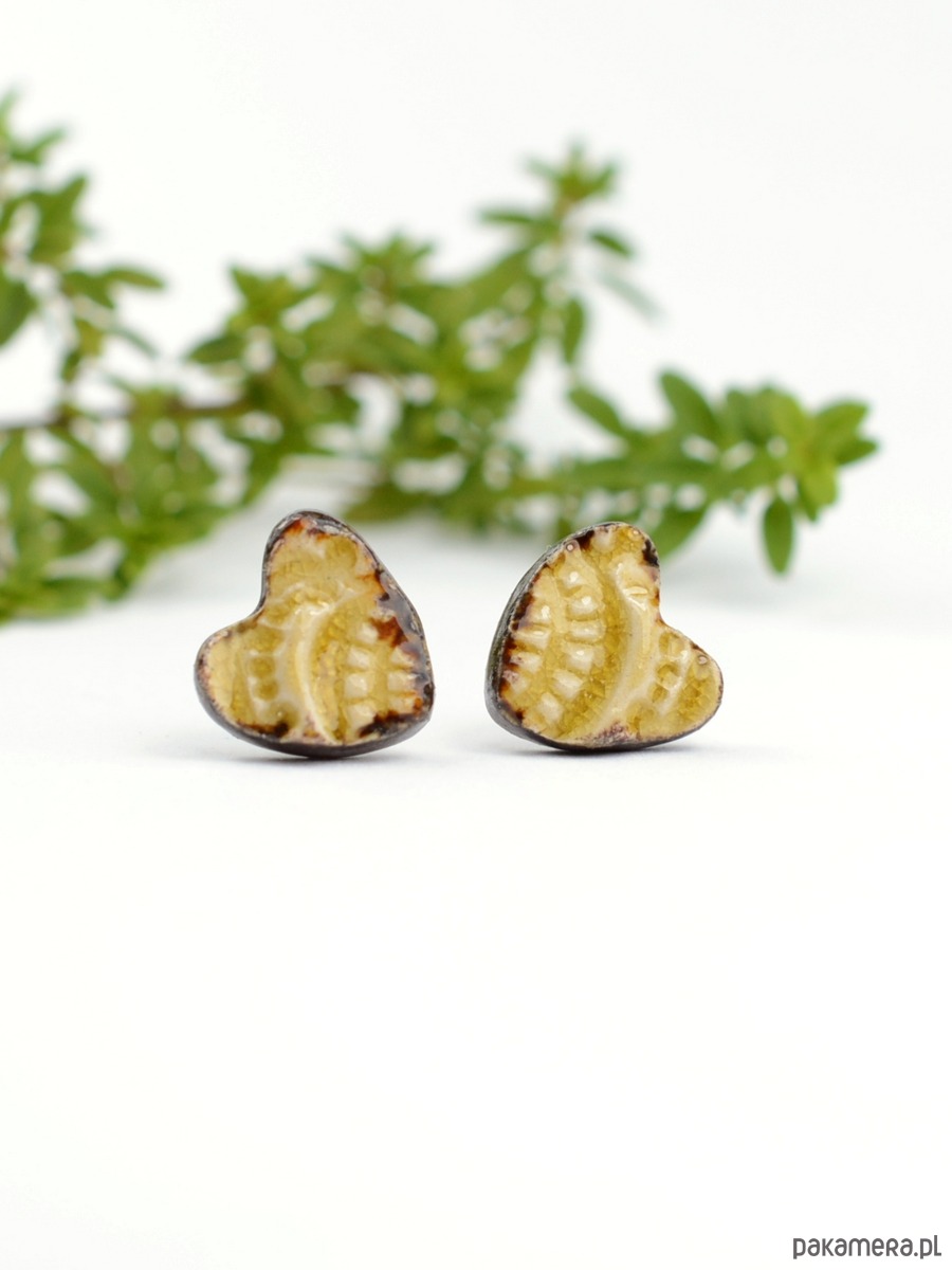 Kolczyki w kształcie serduszek o średnicy 1,1cm i grubości 2mm .Elementy zostały ozdobione wzorem i poszkliwione w kolorystyce żółto-brązowej. Efekt spękań w żółtym szkliwie i delikatny, srebrzysty połysk na bocznych krawędziach daje efekt vintage. Elementy ceramiczne zostały przeze mnie dopracowane w najmniejszym szczególe :))) Kolczyki są solidnie umocowane na sztyftach ze stali chirurgicznej- antyalergiczna, w kolorze oksydowanego srebra. Wysyłam ozdobnie zapakowane- gotowe na prezent:)