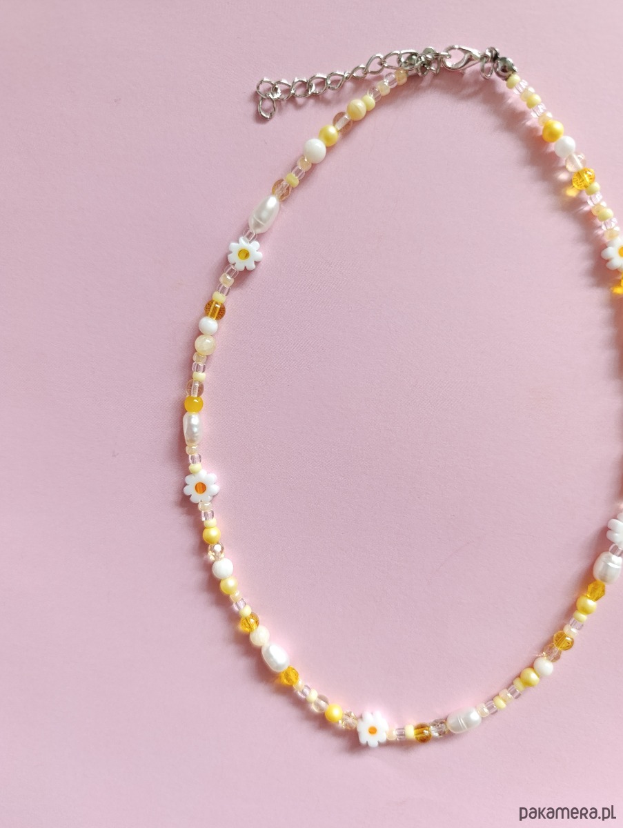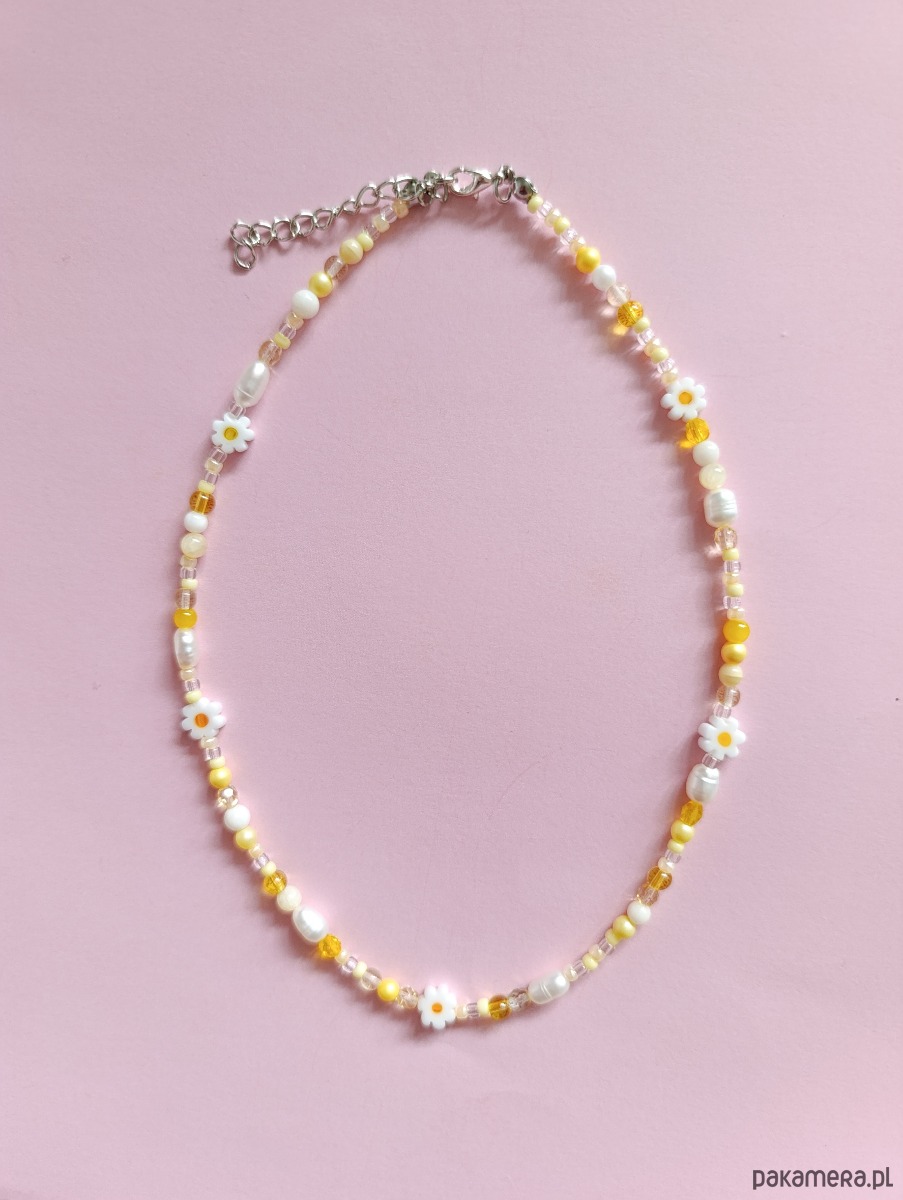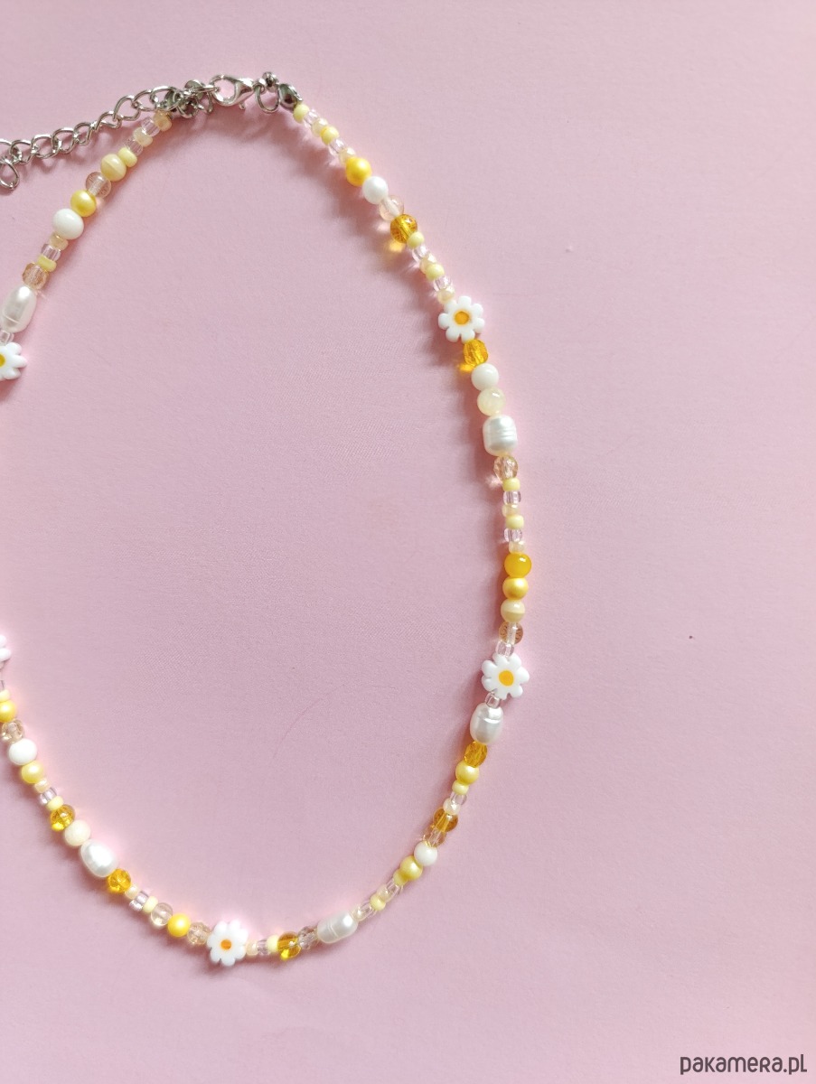 Żółto-biały naszyjnik choker kwiatki stokrotki perły koral