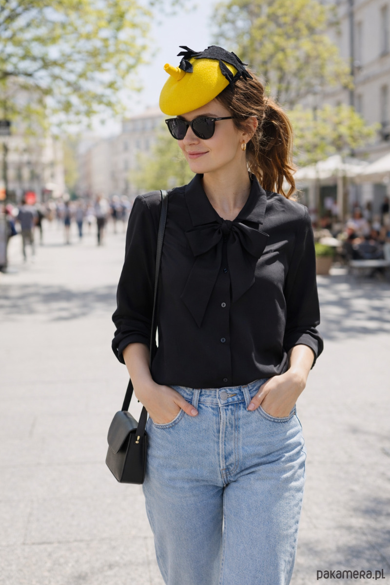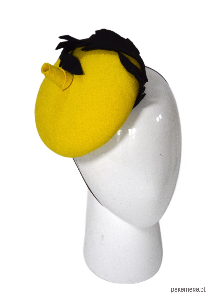 Fascynator z filcu w kolorze żółtym. Zobiony wycinanymi ręcznie liściami z czarnego filcu,.