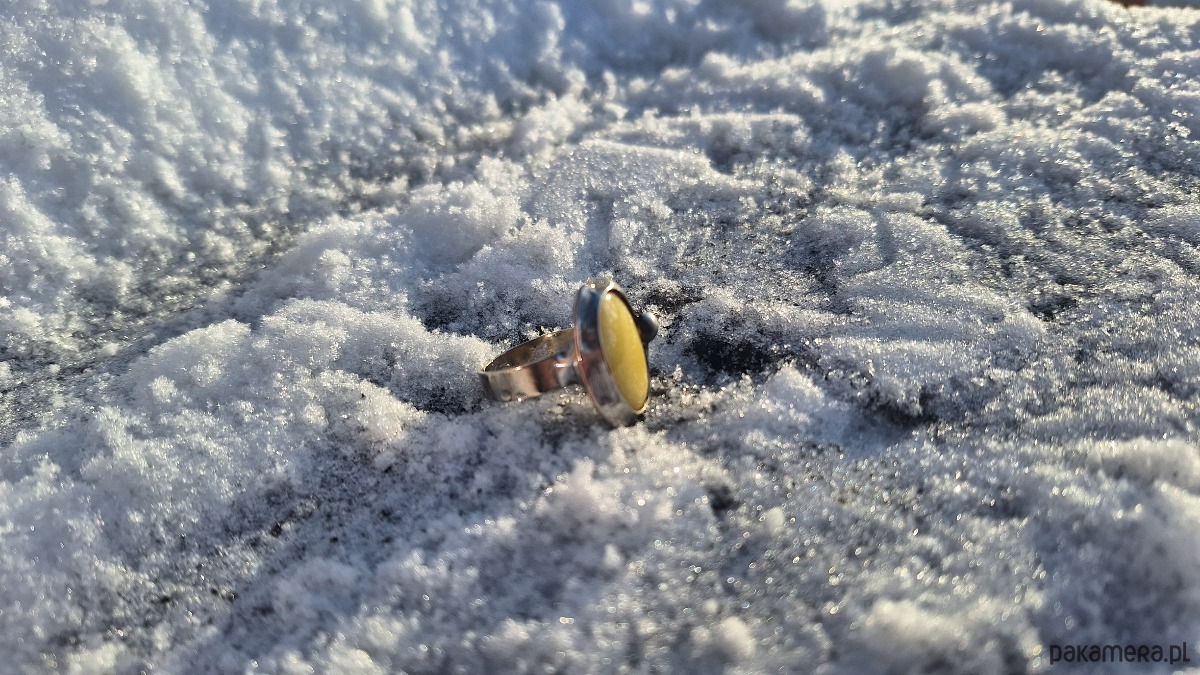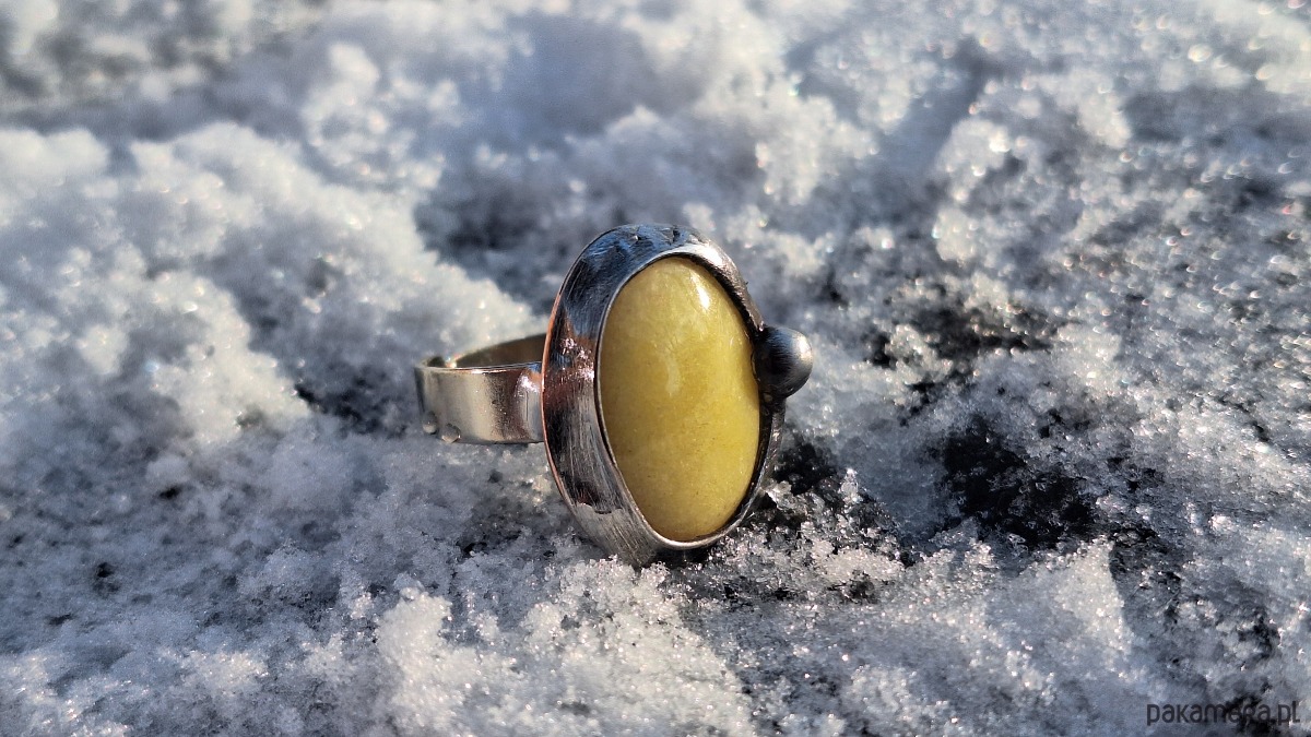 Pierścionek wykonany z miedzi, cyny i jadeitu. Wymiary ok. 2 na 1.5 cm. Regulowany. Nie jest ciężki.