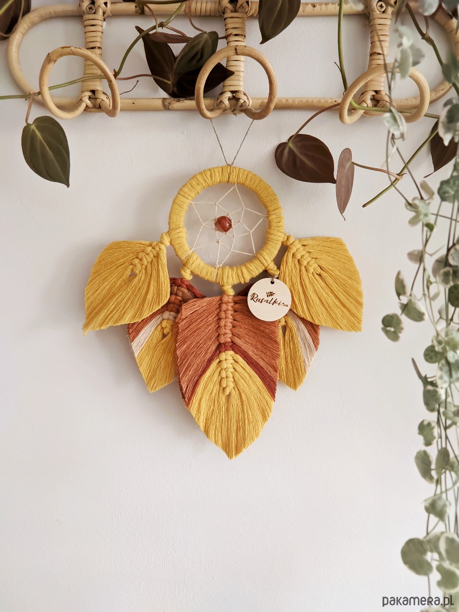 Żółty pleciony łapacz snów - makramowe piórka 26cm, etniczne dekoracje