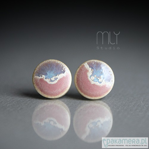 Ceramiczne okrągłe kolczyki w formie sztyftów, ręcznie wykonane z delikatnej gliny kamionkowej, jednostronnie szkliwione mieszanką różowych szkliw z efektem plamek, na antyalergicznych sztyftach w kolorze srebrnym. Średnica ok.9mm. Polecam