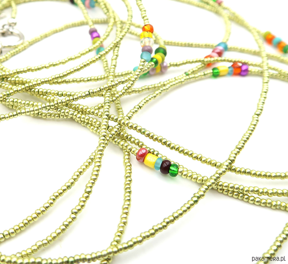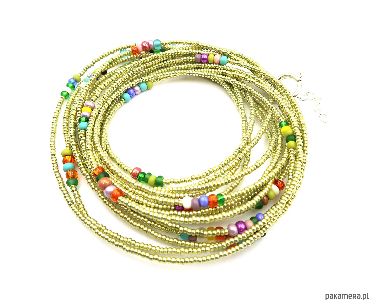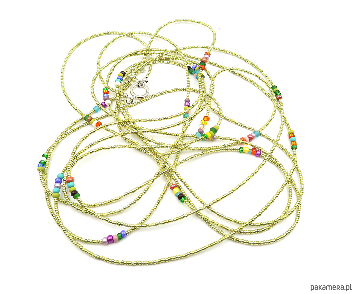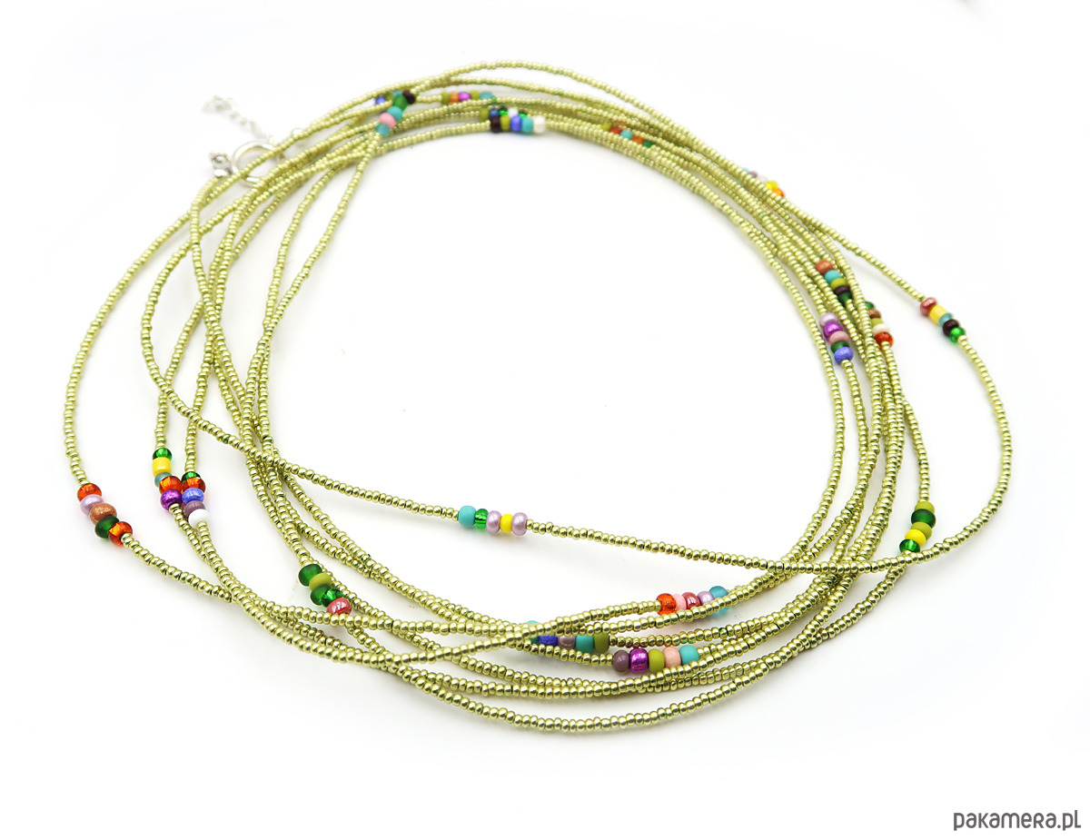 Bardzo długi sznur korali wykonanych na wytrzymałej lince jubilerskiej, z drobnych (ok. 2 mm) szklanych koralików czeskiej firmy Jablonex. Subtelna kolorystyka seledynowej zieleni przełamana została akcentami różnobarwnego szkła, co nadaje całości lekkości i świeżości.