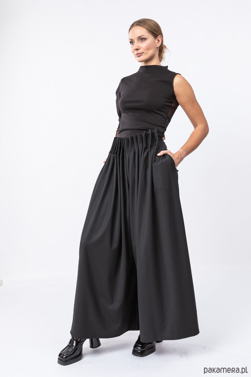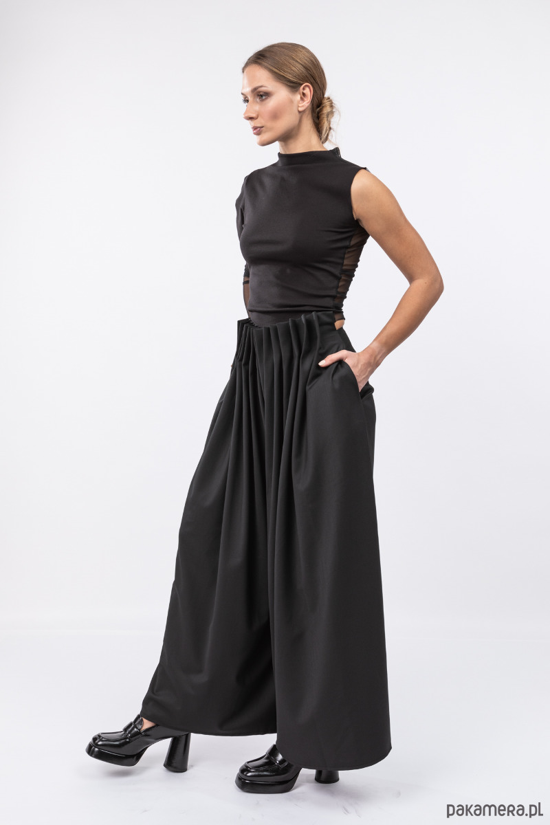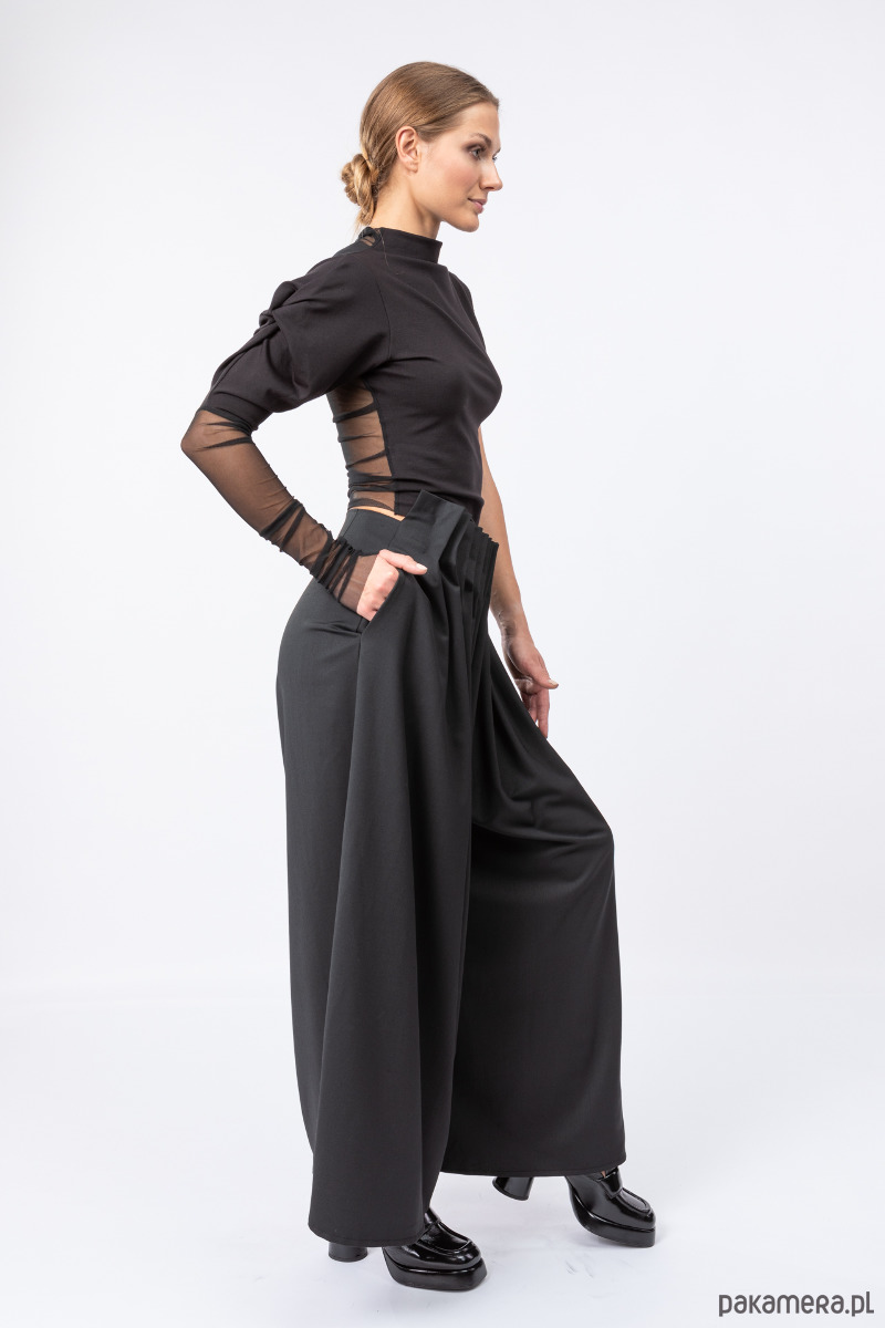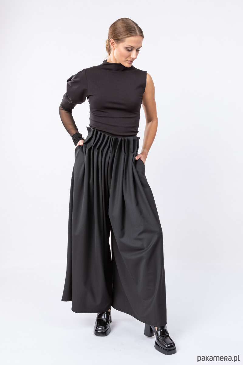 eleganckie i stylowe spodnie z szerokimi nogawkami, z przodu ręcznie splisowane, z tyłu dopasowane zaszewkami, przód jest nieco powyżej talii, na tylnym szwie kryty suwak,