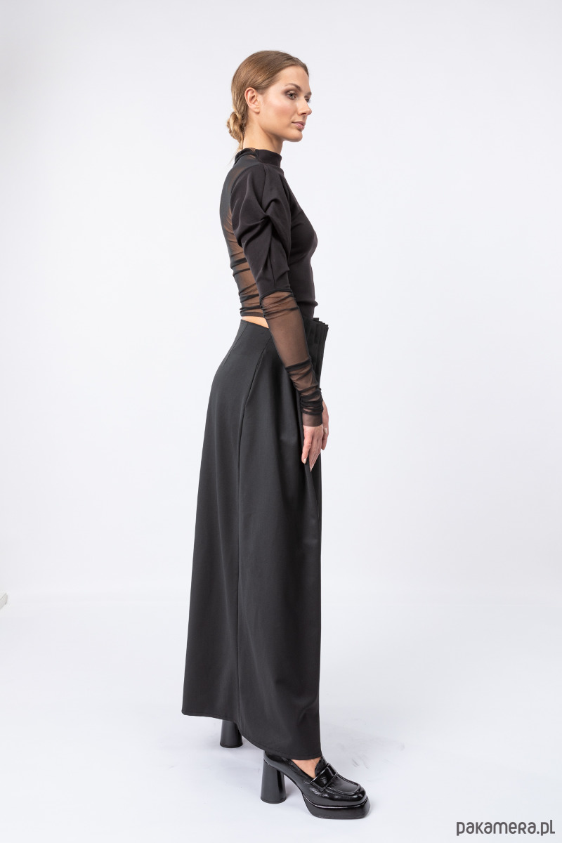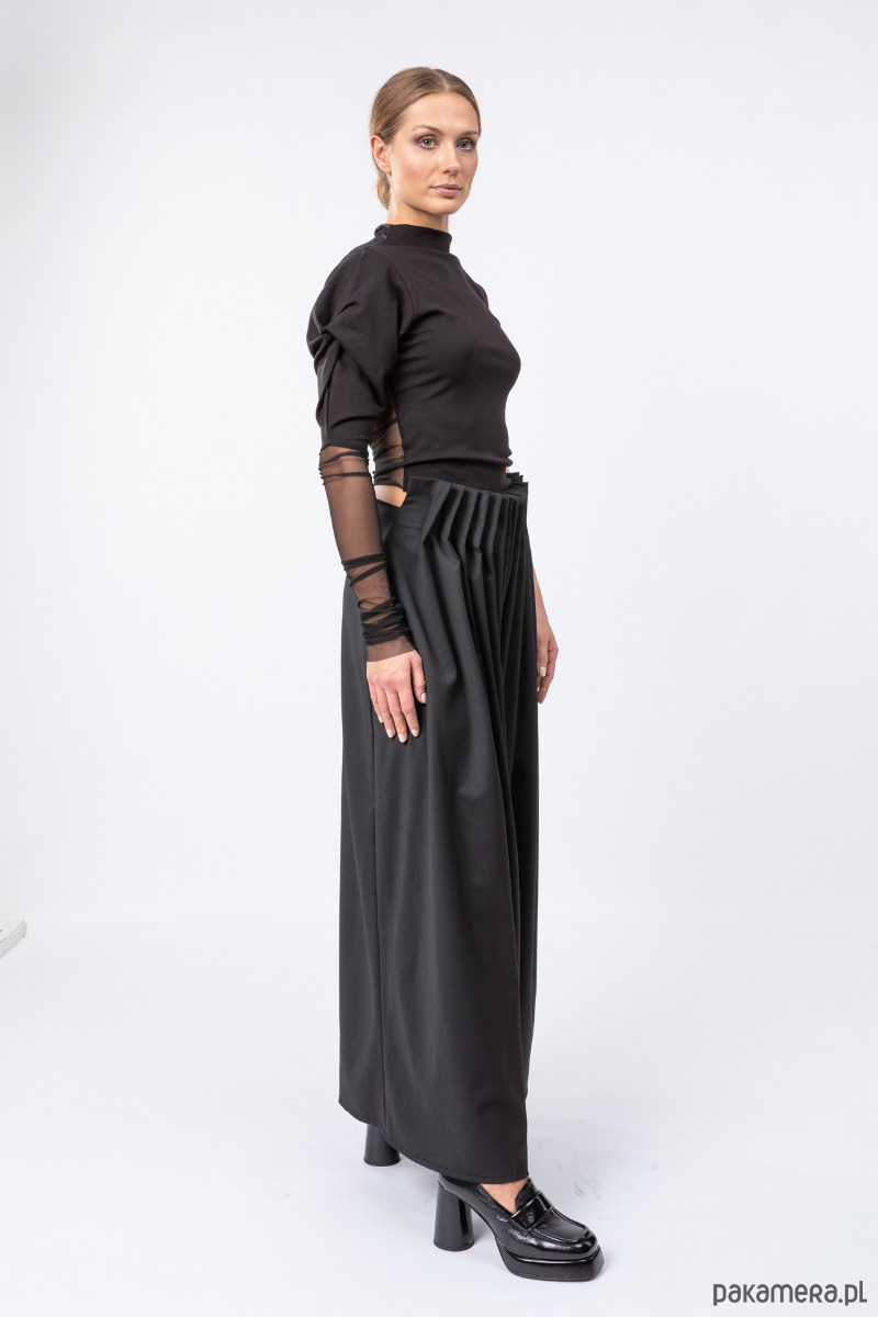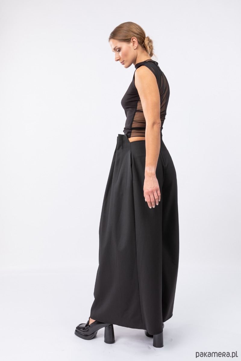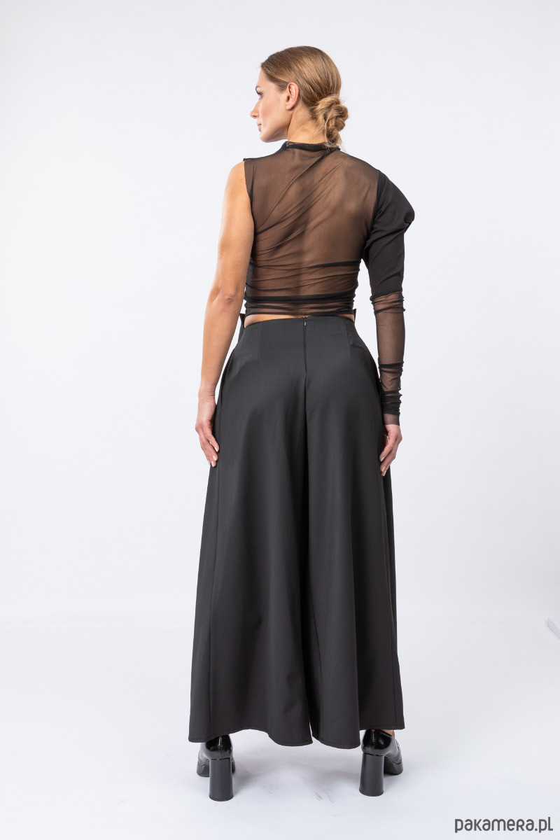 eleganckie i stylowe spodnie z szerokimi nogawkami, z przodu ręcznie splisowane, z tyłu dopasowane zaszewkami, przód jest nieco powyżej talii, na tylnym szwie kryty suwak,