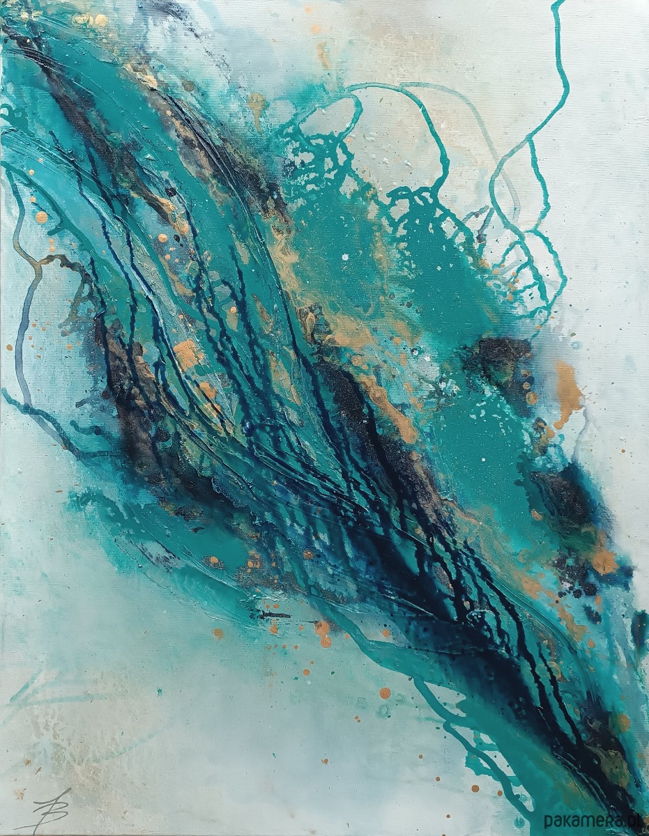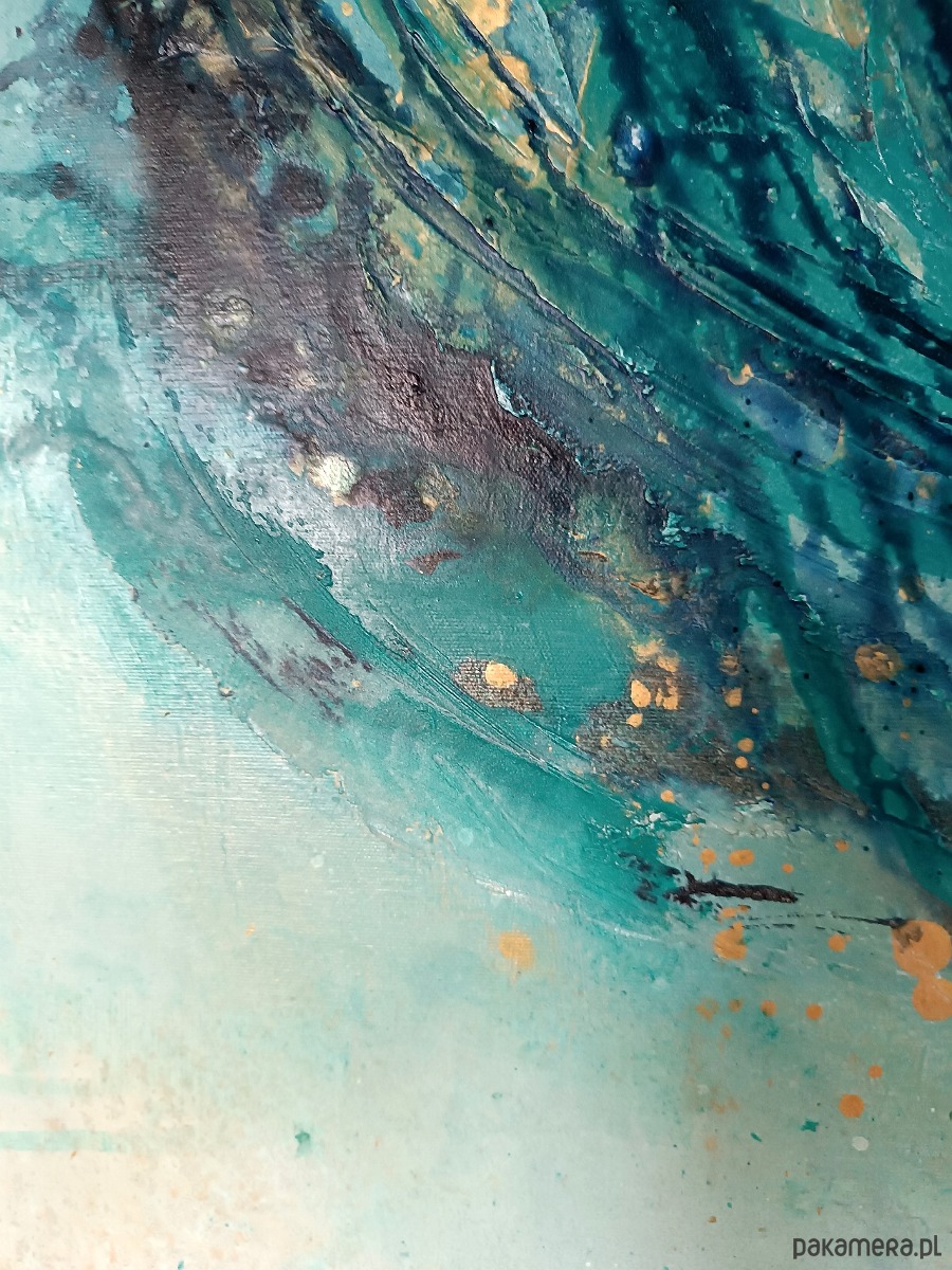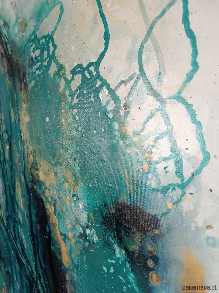 Obraz abstrakcyjny malowany farbami akrylowymi na dobrej jakości podobraziu bawełnianym produkcji polskiej, zabezpieczony werniksem, sygnowany. Boki są przedłużeniem obrazu, dzięki czemu nie wymaga dodatkowej oprawy.