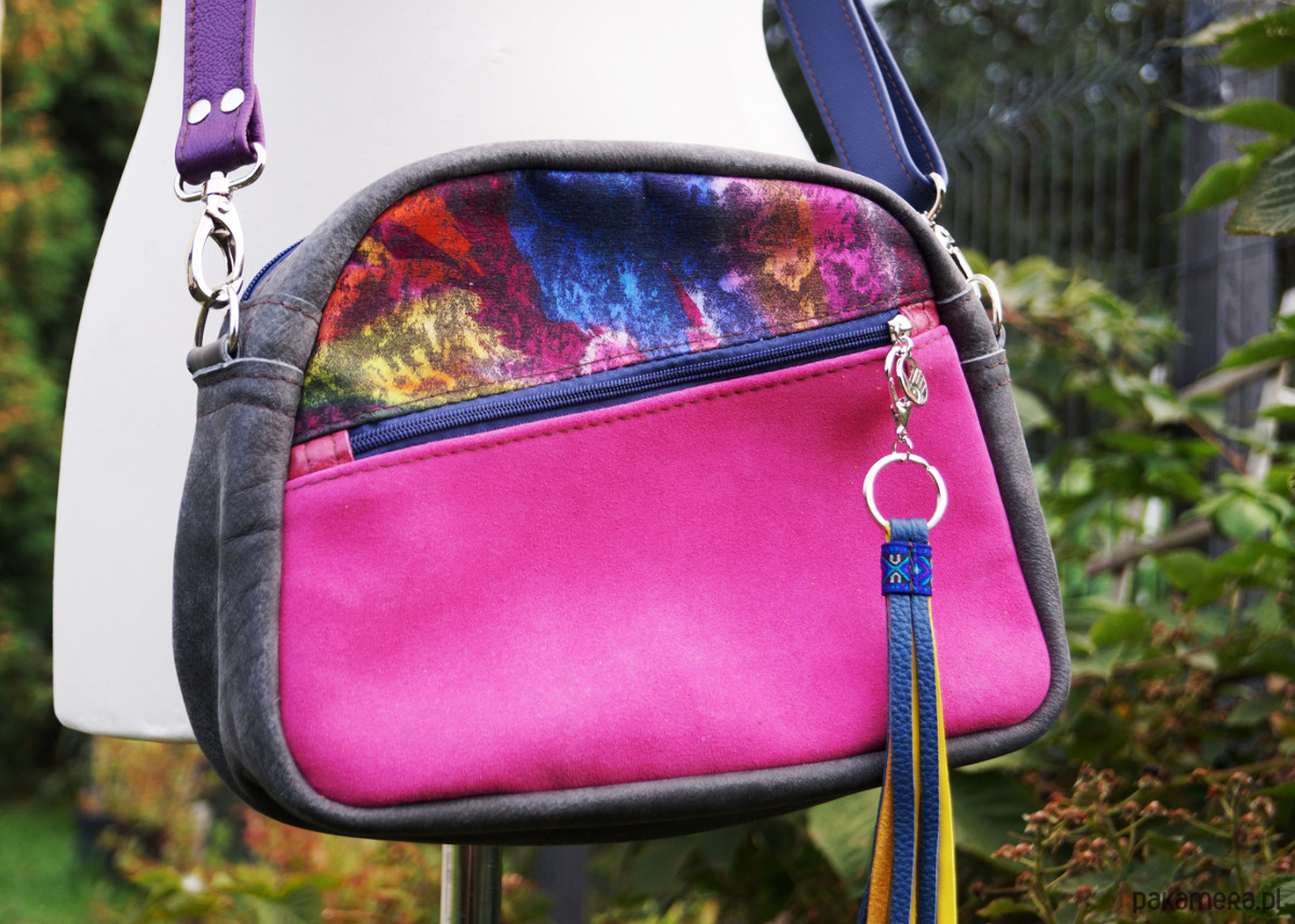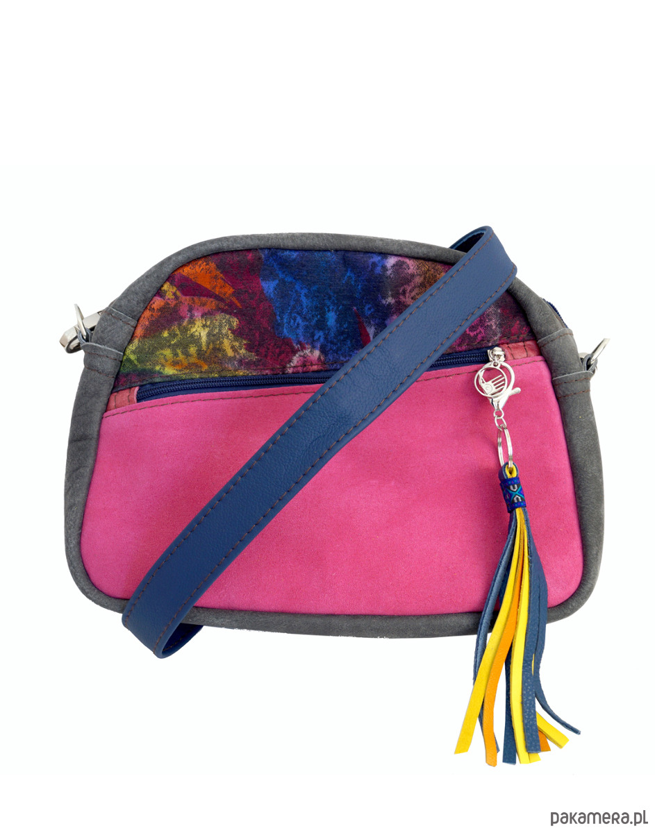 Średniej wielkości torebka o kroju kuferka, z przykuwającym uwagę asymetrycznym cięciem i kolorowymi detalami. Uszyta ze świetnej jakości skór naturalnych, bydlęcych, w chłodnych odcieniach (szary, fuksja, fiolet, granat) oraz z kolorowego płótna. Składa się z głównej przegrody, w której znajduje się dużą kieszeń na zamek i dwie małe otwarte kieszonki. Z przodu duża kieszeń na zamek. Wysokość – 22, szerokość – 29, głębokość – 10-12, dł. regulowanego paska – 130cm.