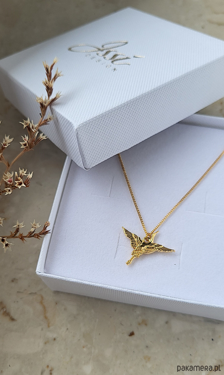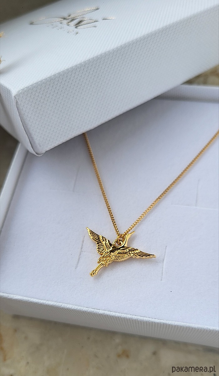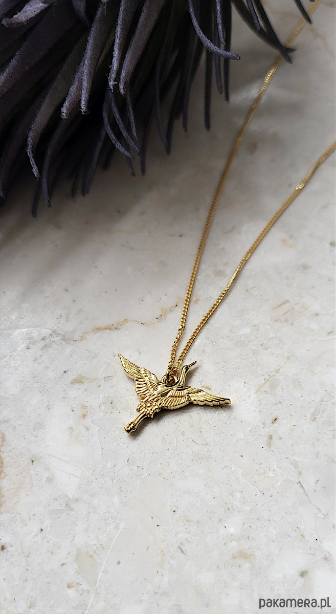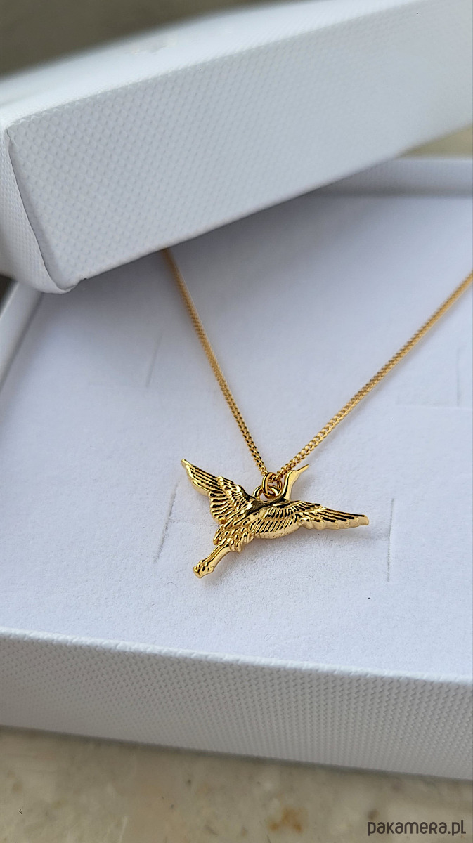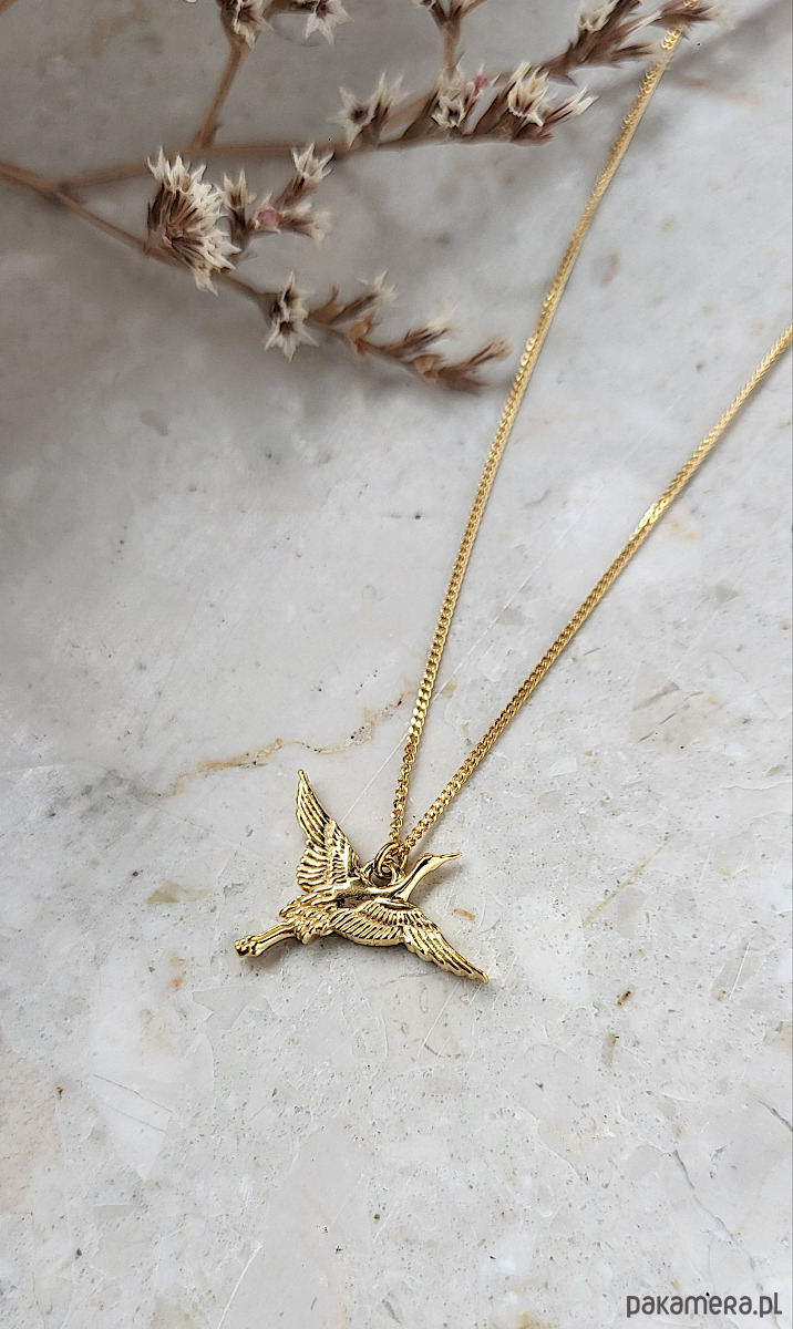 Naszyjnik z zawieszką w kształcie lecącego żurawia. Wykonany ze srebra pr.925 pokrytego dwoma warstwami 24K złota.