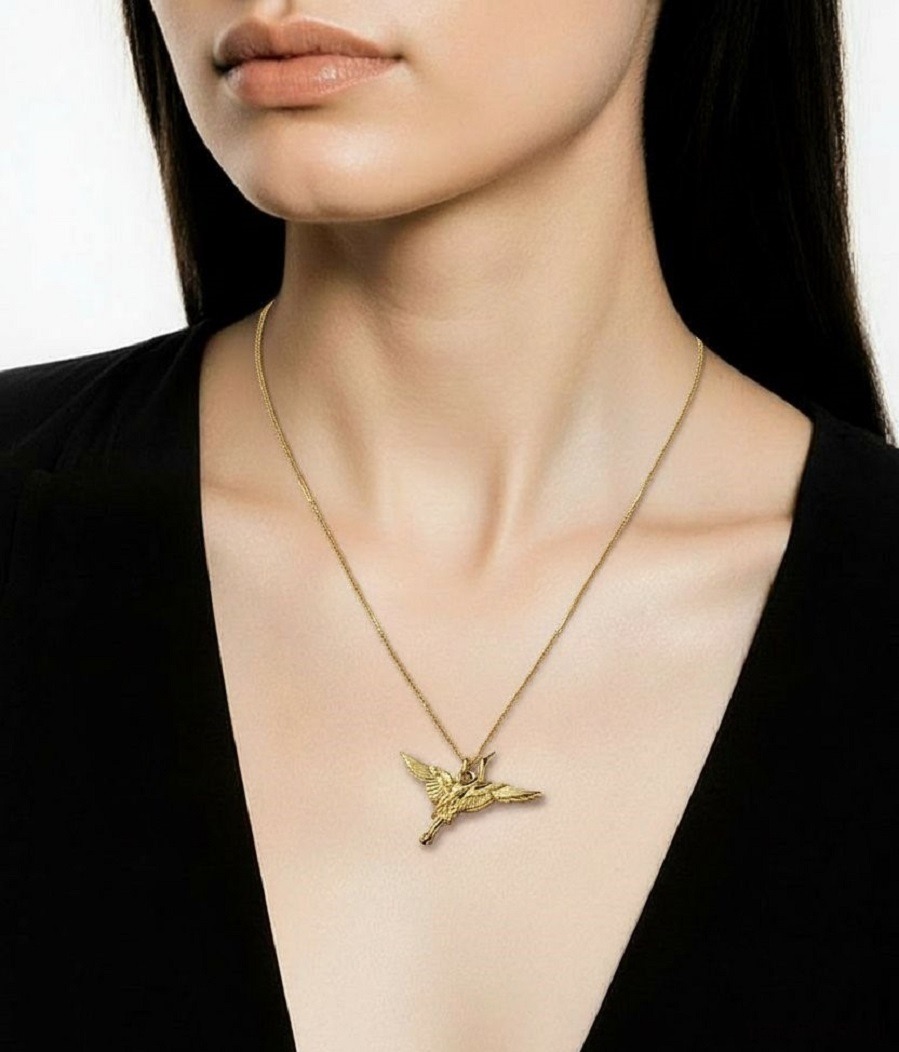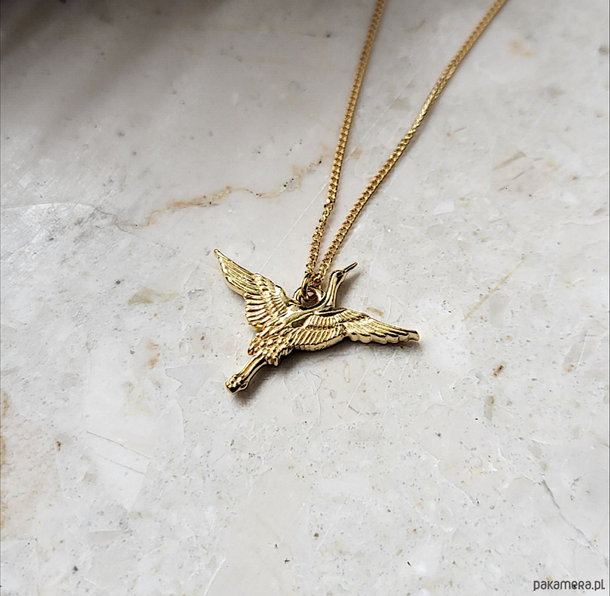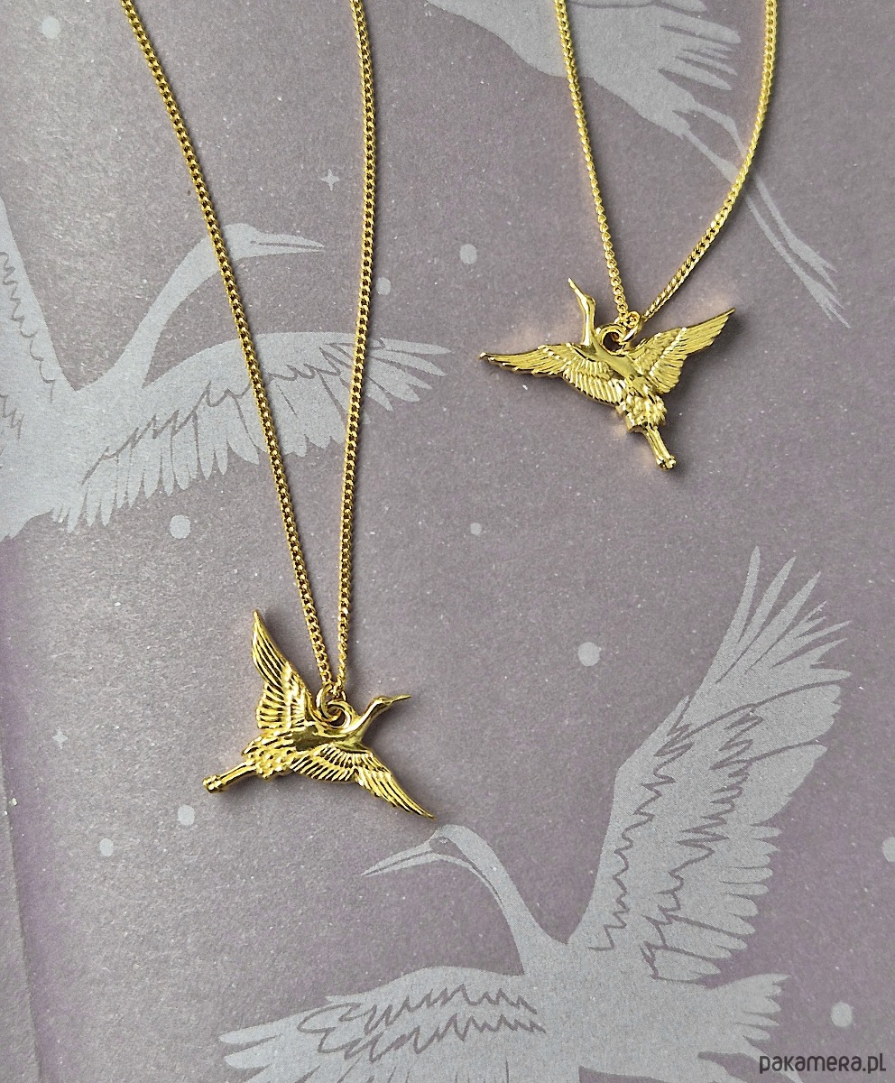 Naszyjnik z zawieszką w kształcie lecącego żurawia. Wykonany ze srebra pr.925 pokrytego dwoma warstwami 24K złota.