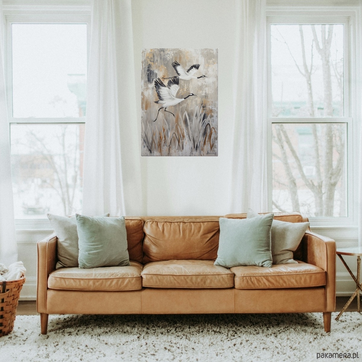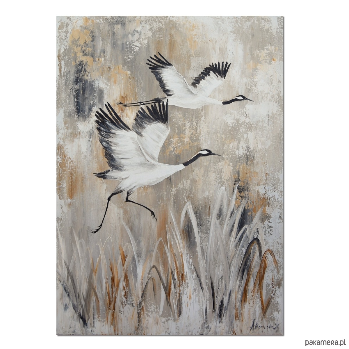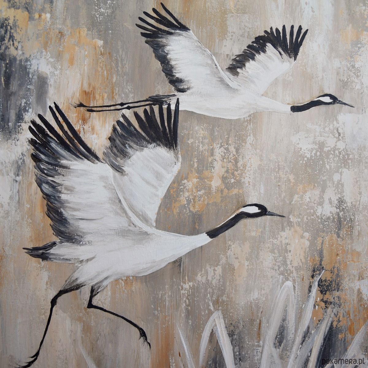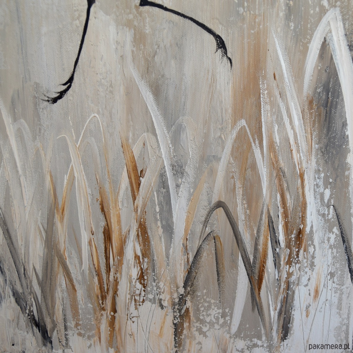 Obraz malowany ręcznie na płótnie naciągniętym na ramę (krosno) o grubości ok. 2 cm. Malowany farbami akrylowymi. Kolorystyka- szary, beżowy, taupe, biały, czarny, brązowy.