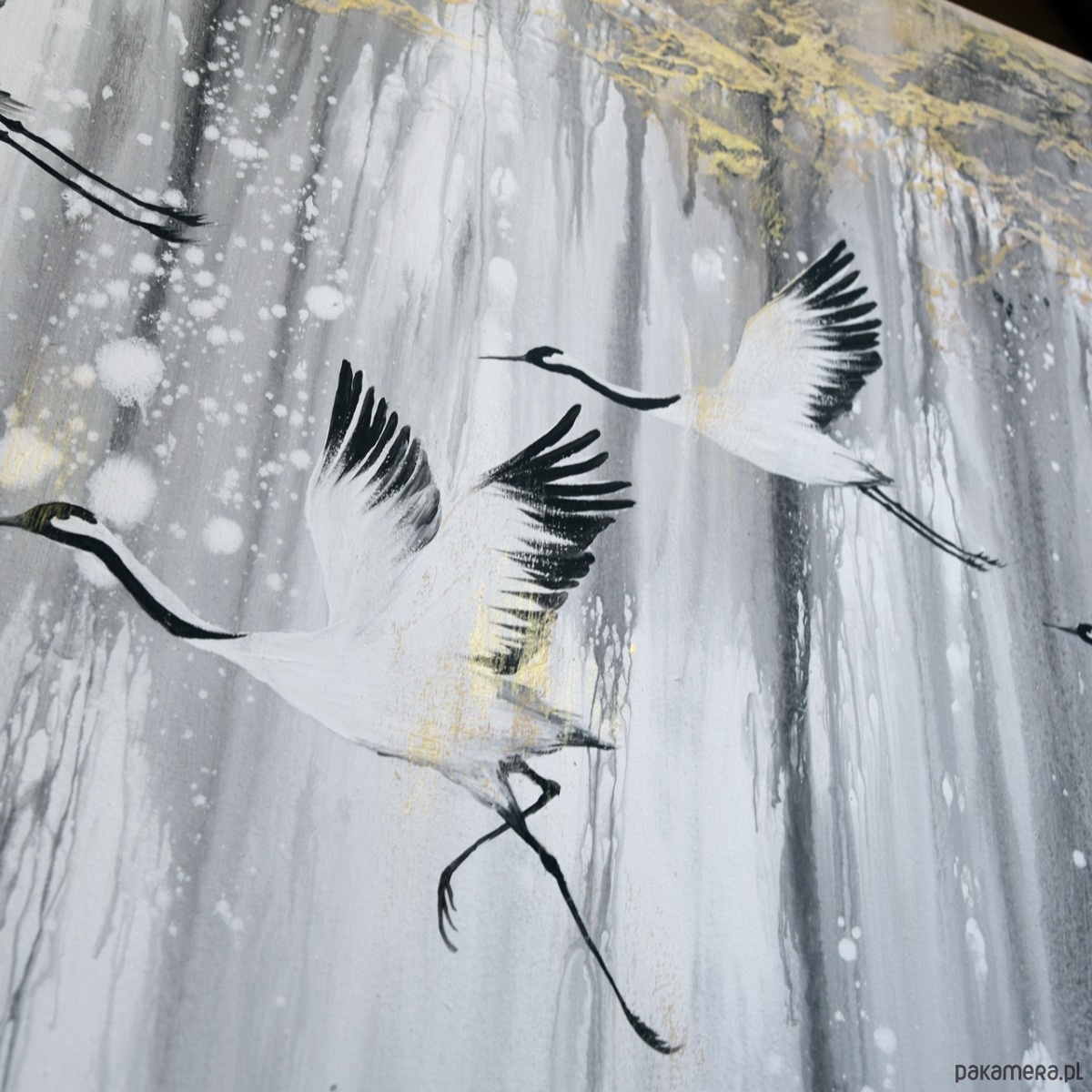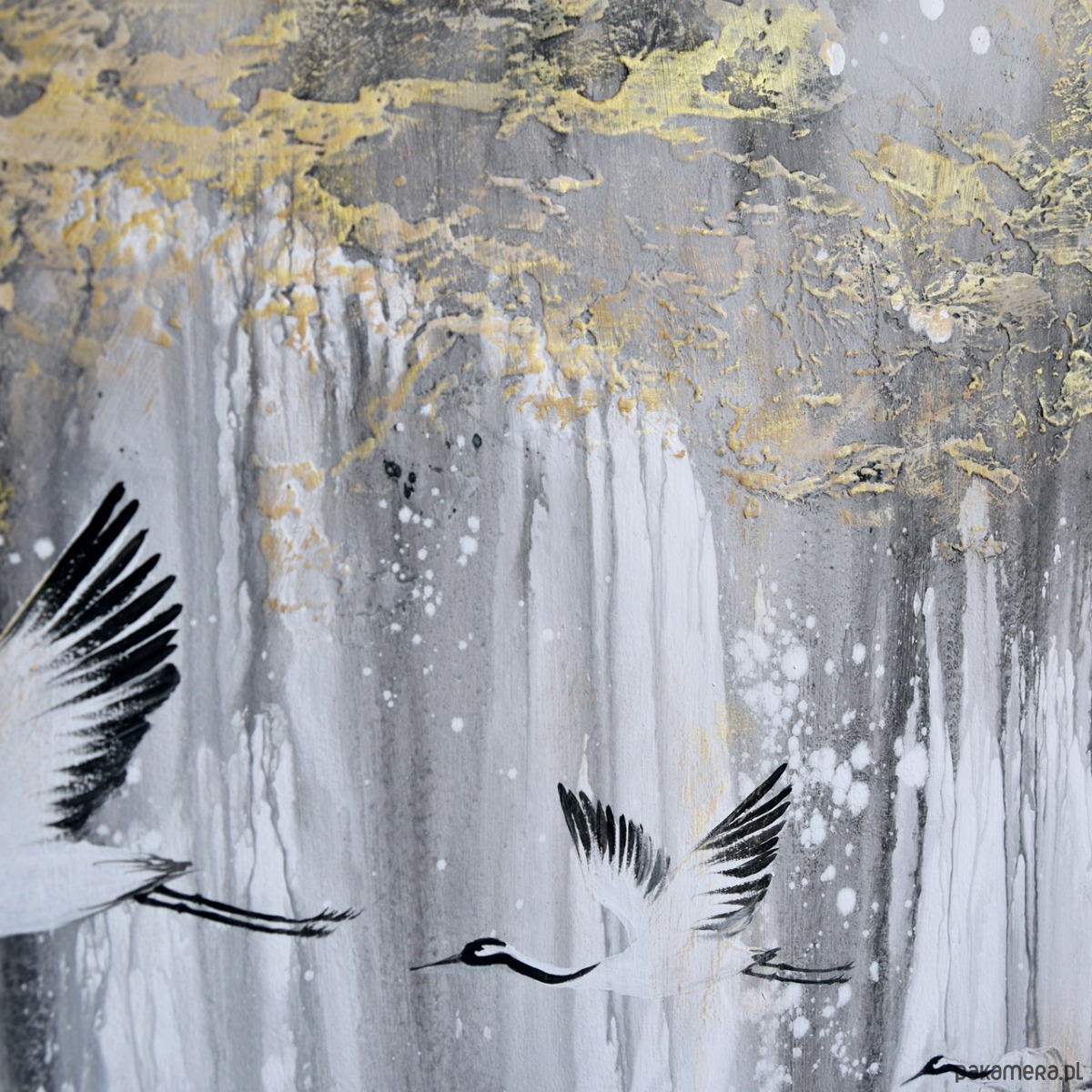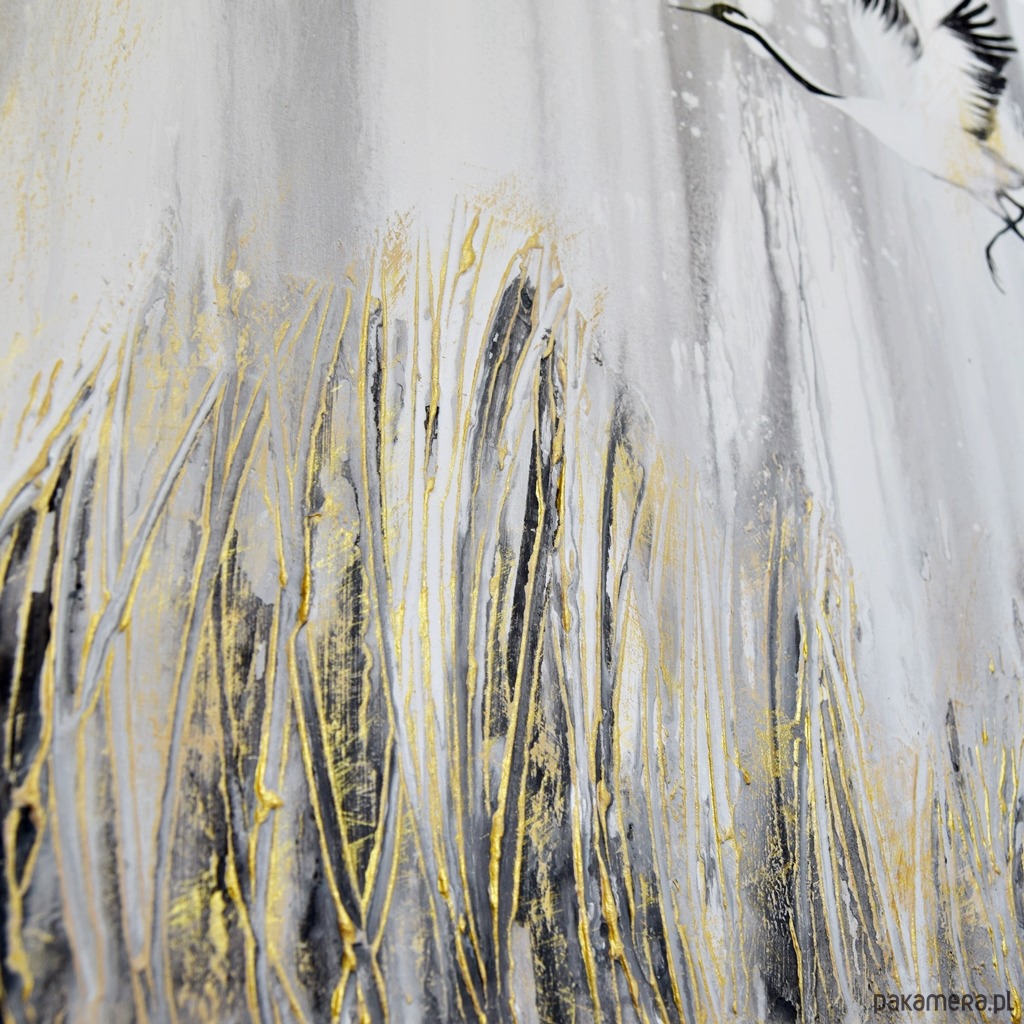 Obraz malowany ręcznie na płótnie naciągniętym na ramę (krosno) o grubości ok. 2 cm. Malowany farbami akrylowymi, w tym techniką pouringu, czyli spryskiwania i wylewania farby - takiego samego efektu nie da się odtworzyć, więc mają Państwo gwarancję, że kupują jedyny, niepowtarzalny egzemplarz. Jest tu również wyraźna struktura i przetarcia metaliczną złotą farbą. Kolorystyka- odcienie szarości, biały, czarny, beżowy, złoty.