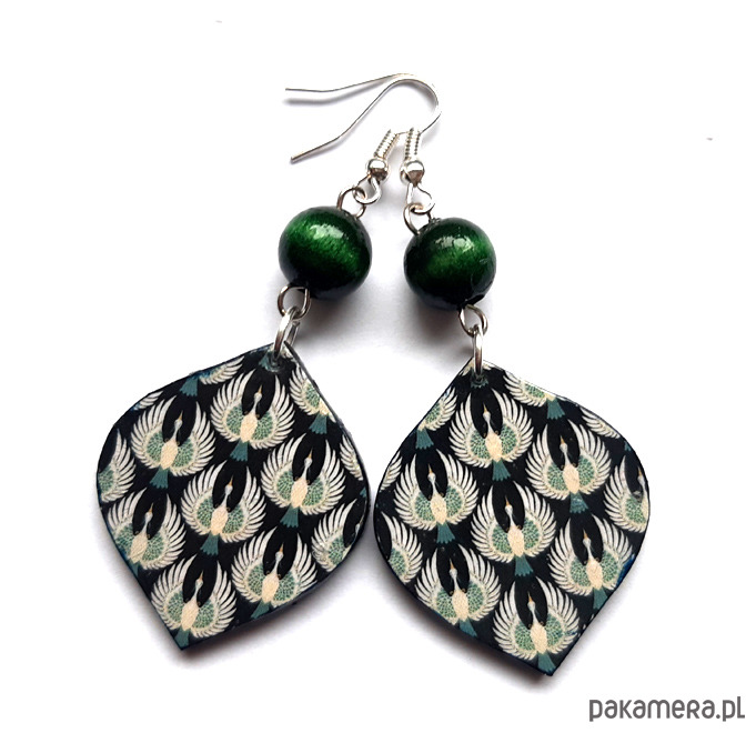 kolczyki drewniane, ozdobione metodą decoupage, dwustronne, starannie wykończone farbami akrylowymi i zabezpieczone wielokrotnie lakierem, koraliki drewniane, bigle posrebrzane, długość kolczyków bez bigli: 5,5 cm, szerokość: 3 cm, bardzo lekkie