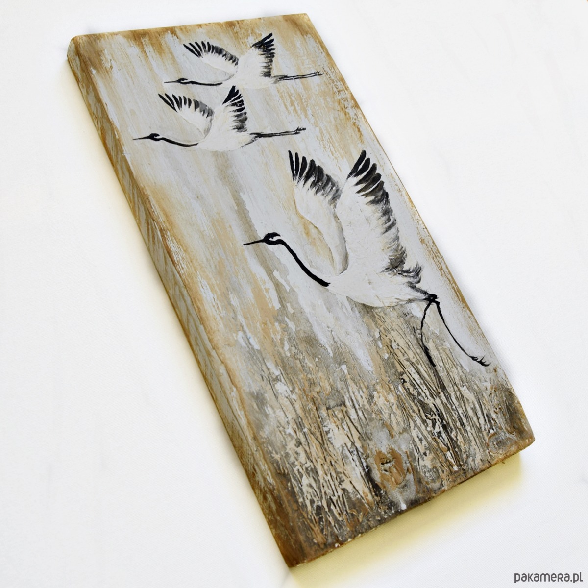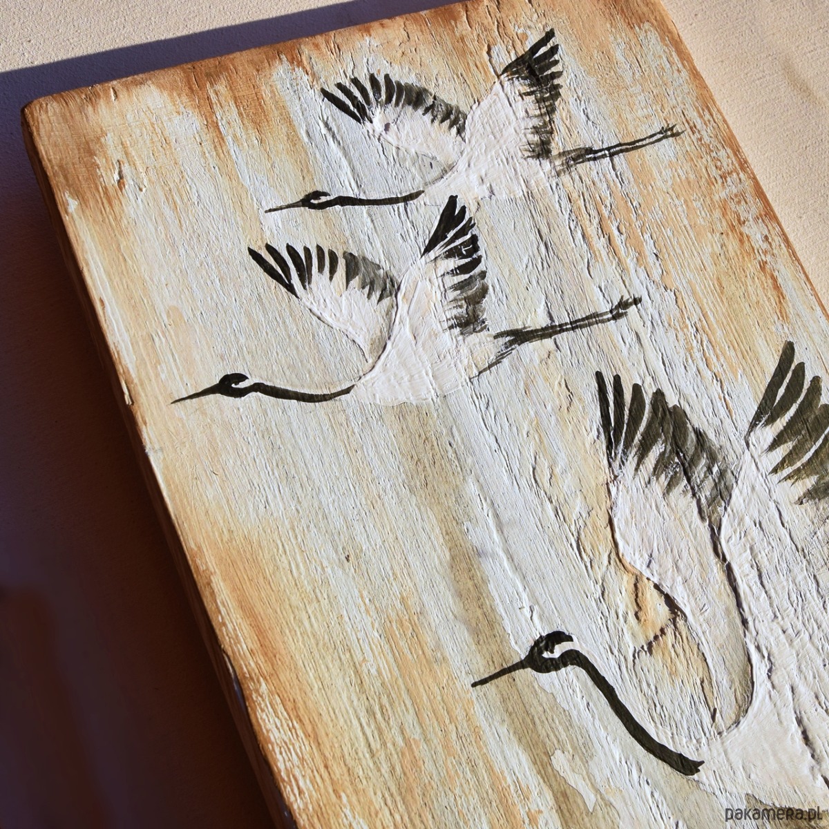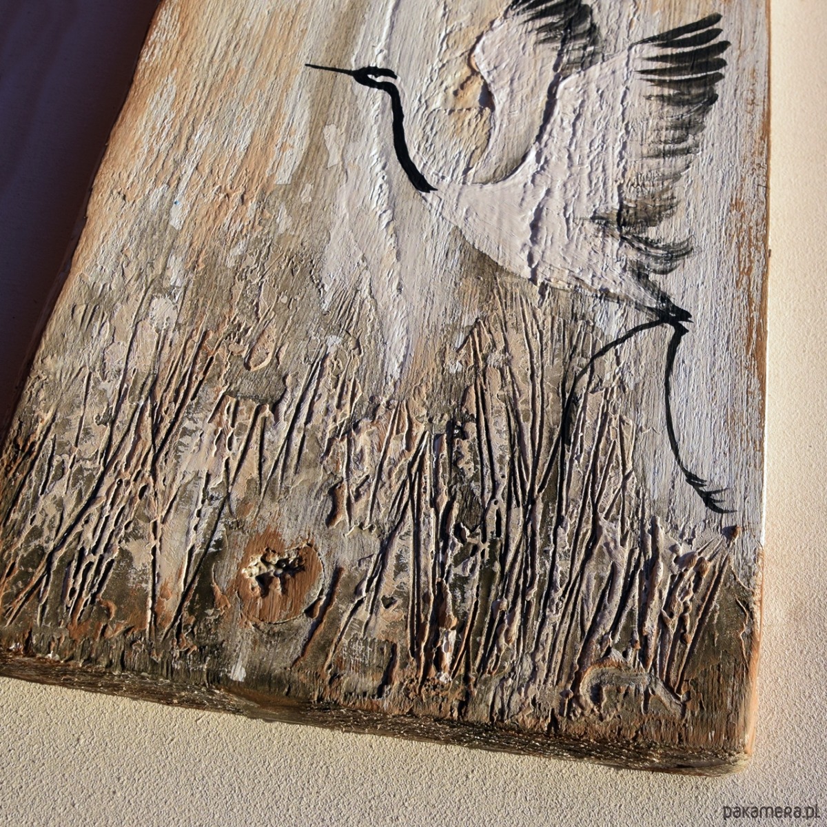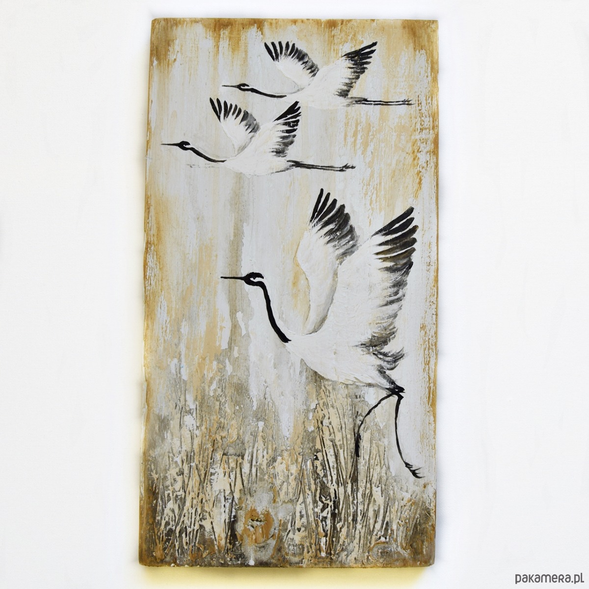 Obraz z serii Żurawie, malowany farbami akrylowymi, częściowo z grubą, wyraźną strukturą, na grubej desce sosnowej. Całość jest pokryta werniksem dla ochrony przed wilgocią.