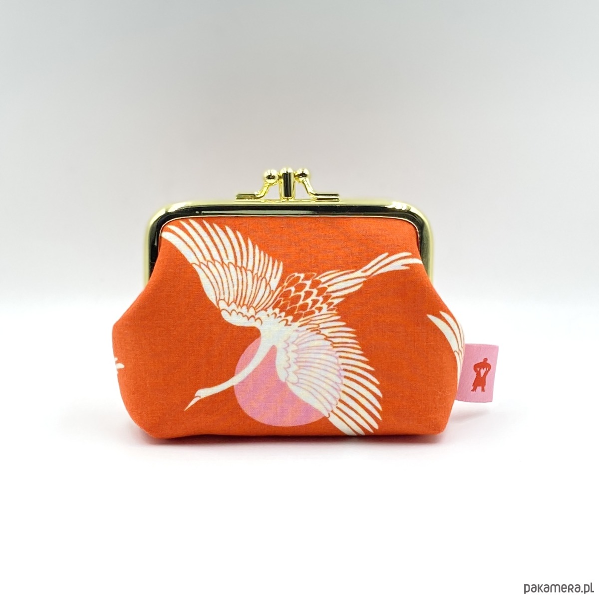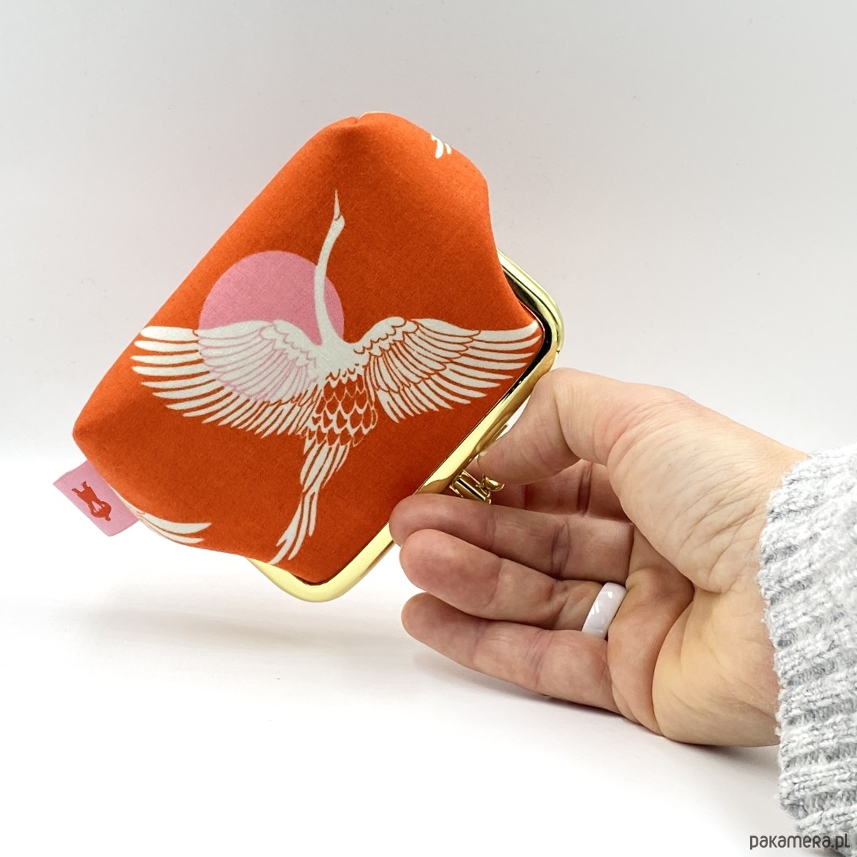 Portmonetka „Żurawie Origami” przedstawia sylwetkę żurawia na tle zachodzącego słońca, przedstawioną na makowoczerwonej tkaninie. Wewnętrzna podszewka wykonana została z koralowe i granatowej bawełny w krzyżyki. Dwukomorowa portmonetka, mieści w sobie karty kredytowe.