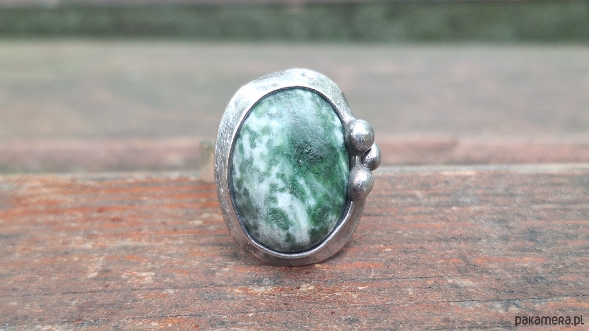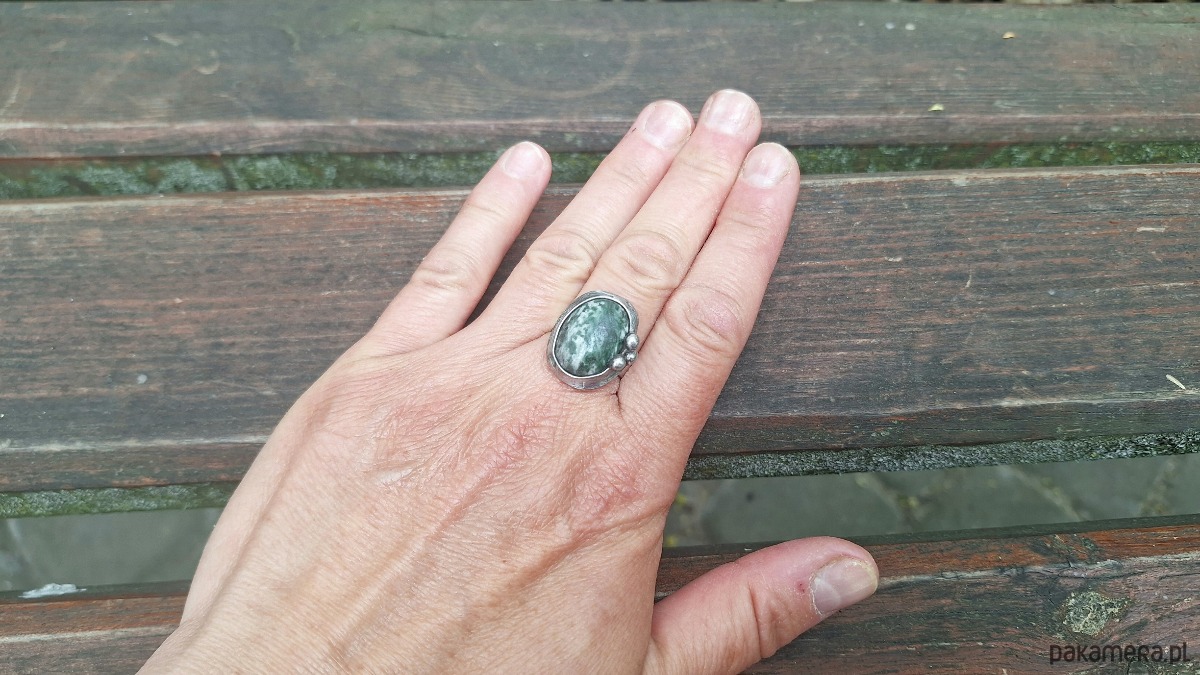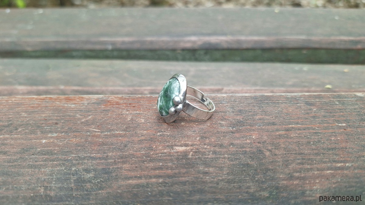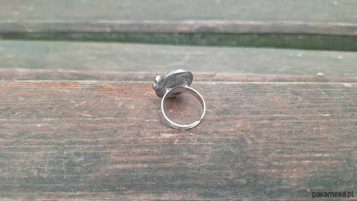 Pierścionek wykonany z miedzi, cyny i agatu. Wymiary ok. 2 na 1.5 cm. Regulowany. Nie jest ciężki.