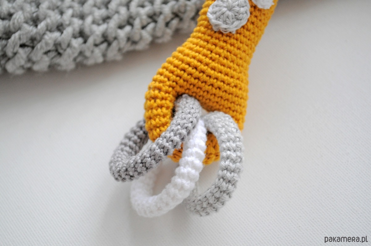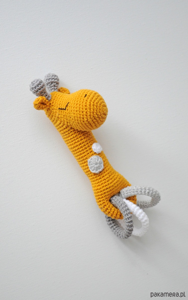 Żyrafka w kolorze ochry może posłużyć jako oryginalny prezent dla maluszka i jego rodziców, ozdoba na babyshower lub dekoracja pokoju dziecięcego.