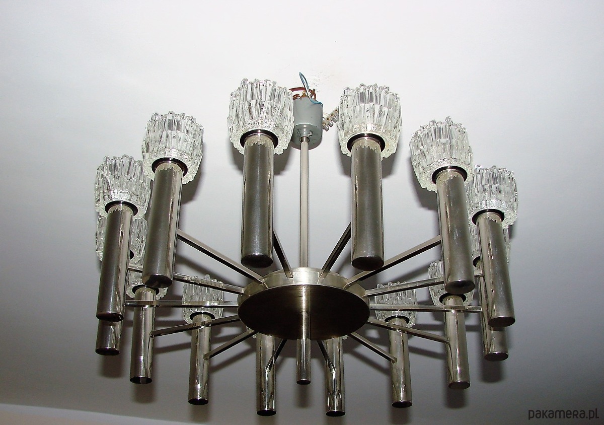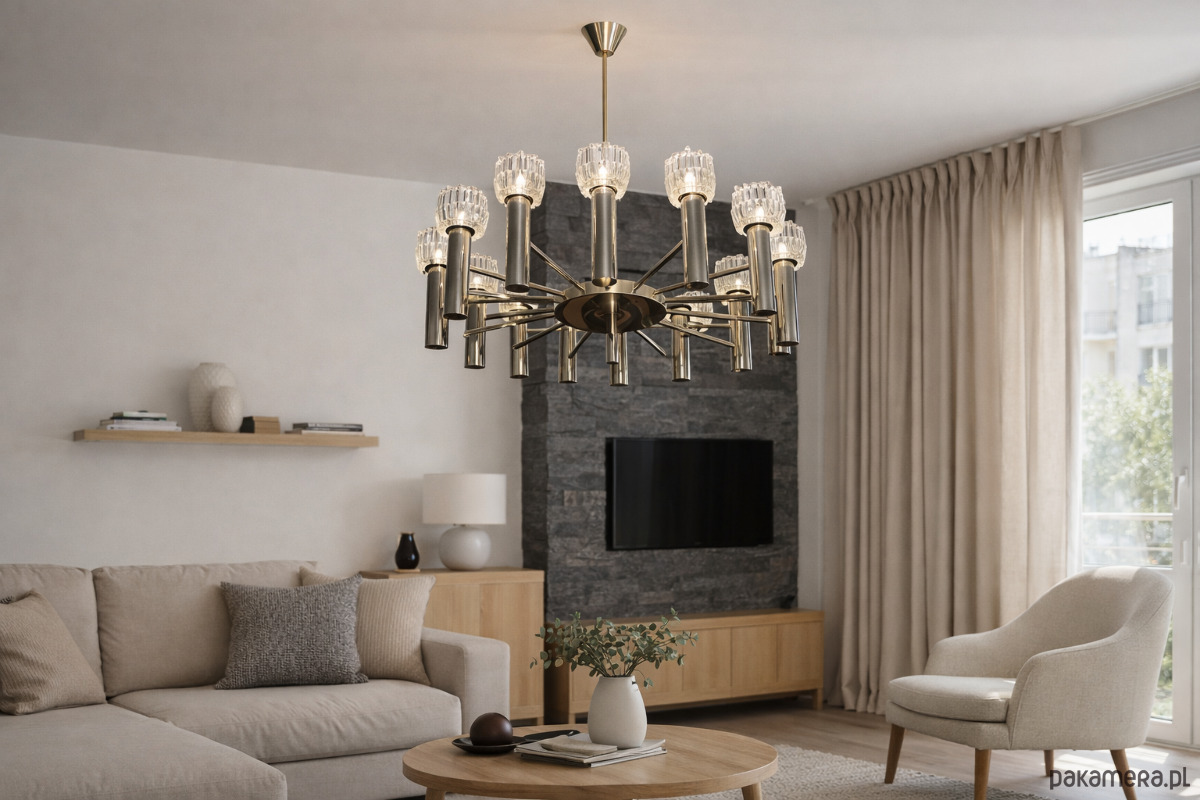 Żyrandol posiada aż 12 punktów świetlnych, co zapewnia mocne, dekoracyjne oświetlenie i spektakularny efekt wizualny. Doskonale sprawdzi się w salonie, jadalni, holu lub przestrzeniach loftowych i vintage, stanowiąc centralny punkt aranżacji.