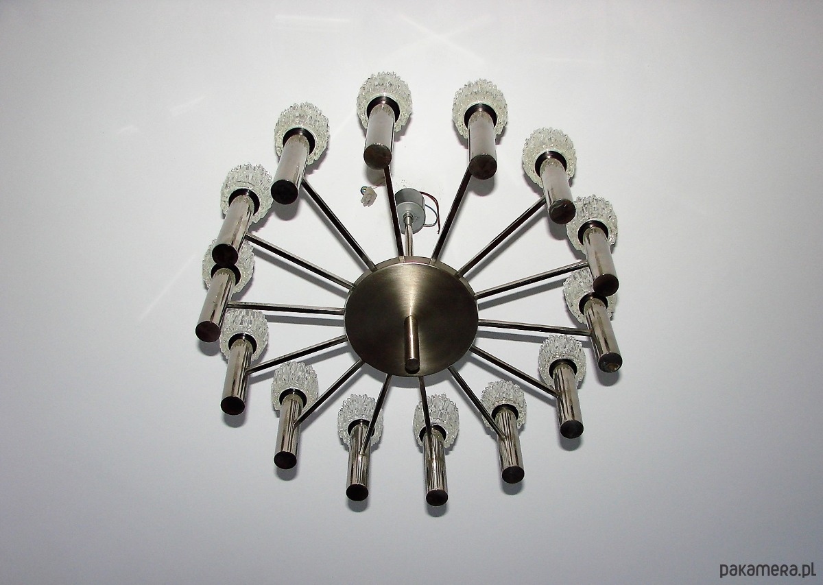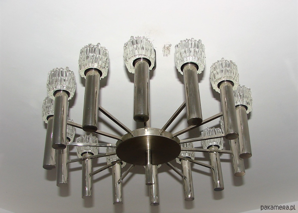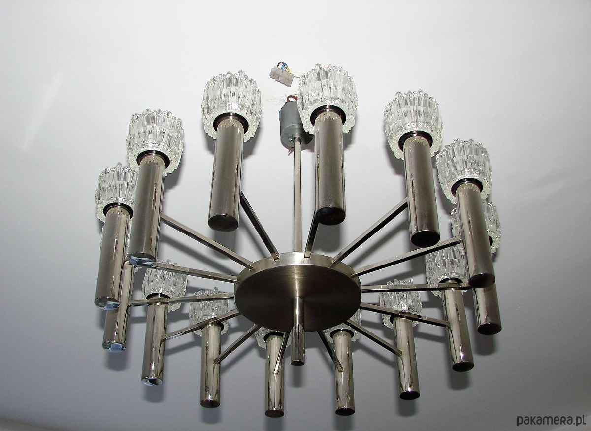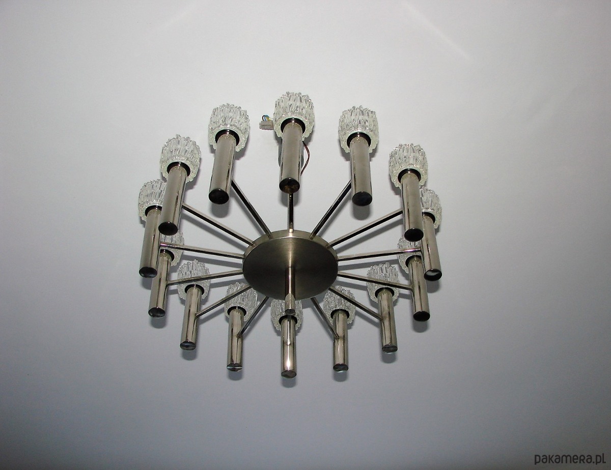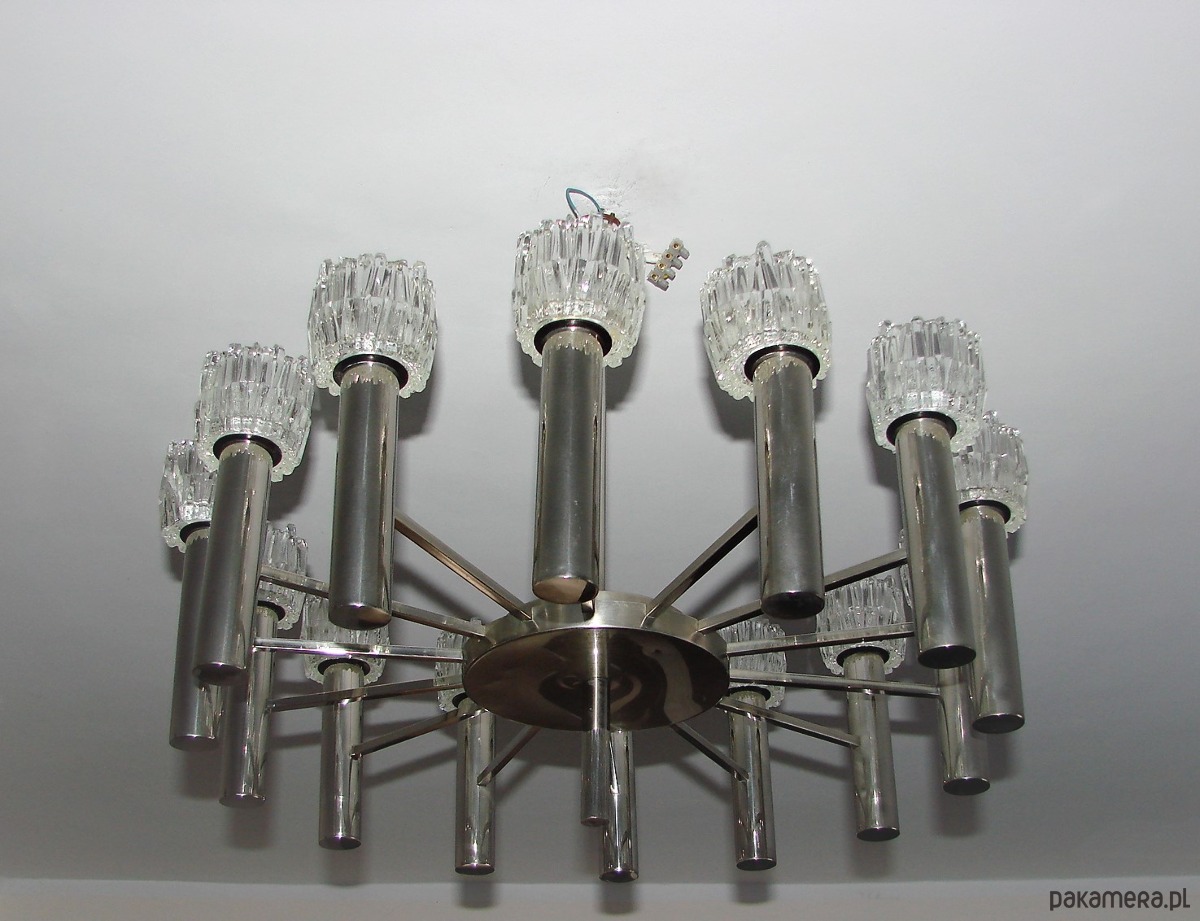 Efektowny żyrandol w stylu modernistycznym, sygnowany designem Scolari, pochodzący z lat 70. XX wieku. Konstrukcja wykonana z mosiądzu chromowanego, charakteryzuje się dynamiczną, rzeźbiarską formą typową dla włoskiego wzornictwa tego okresu.