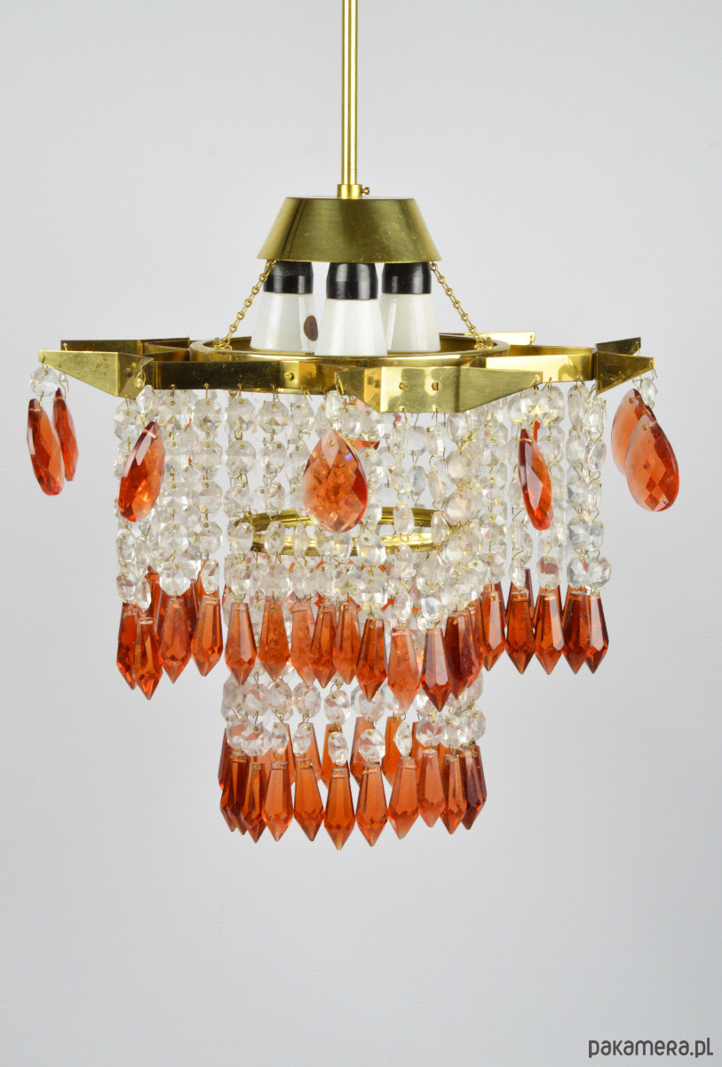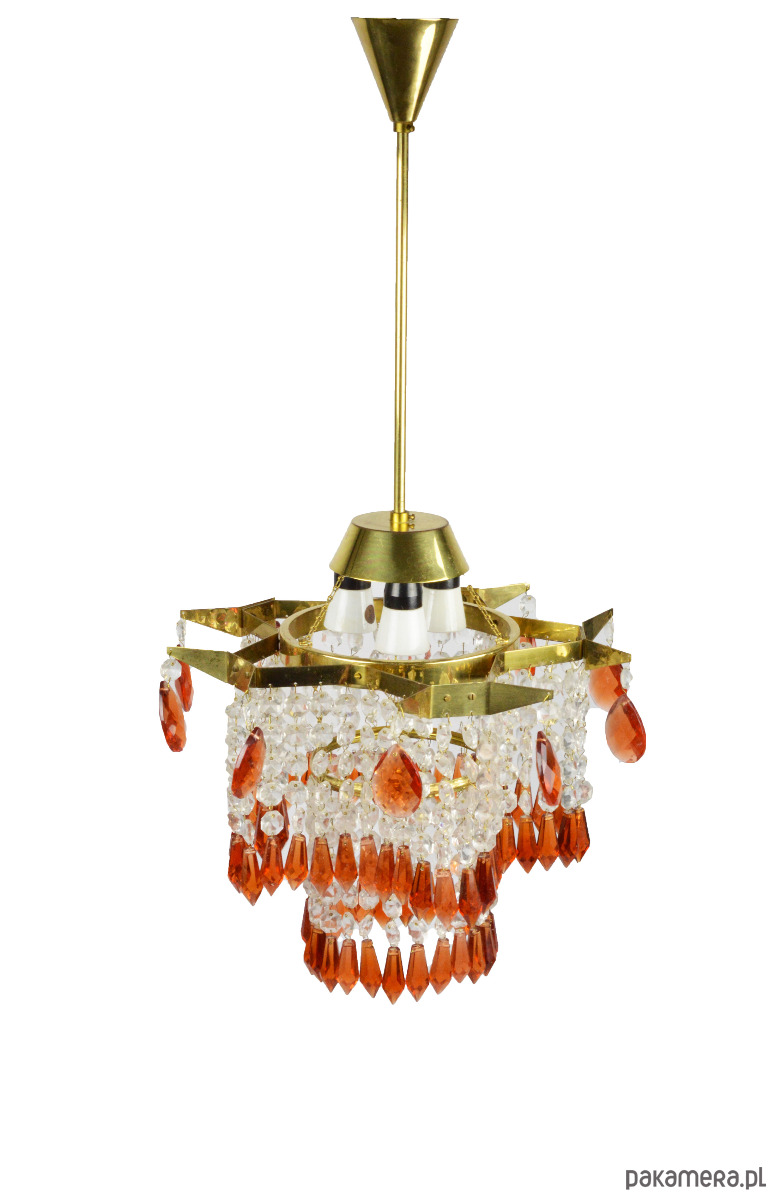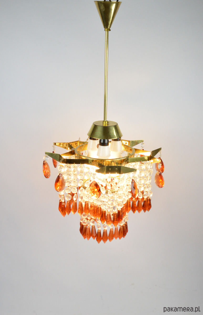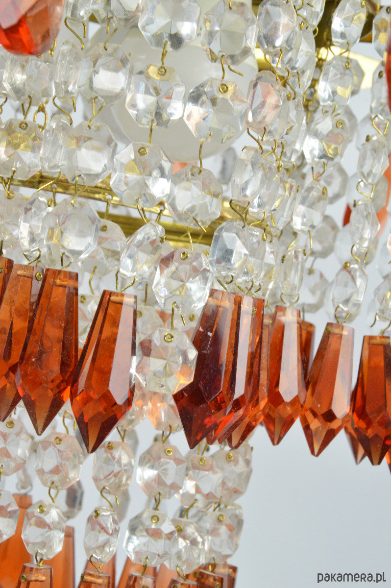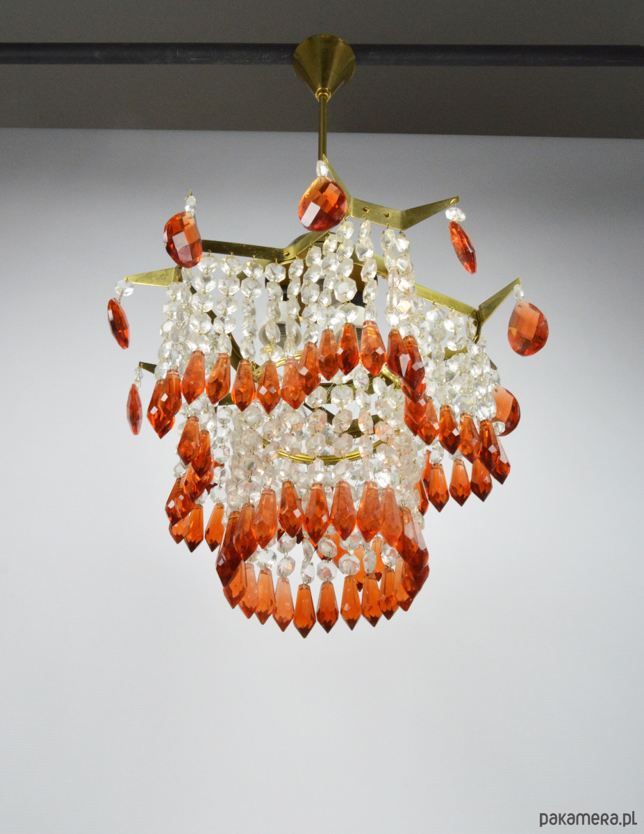 Żyrandol wyprodukowany dla Jablonecke sklarny w Novy Bydzov, Czechosłowacja. Żyrandol składa się ze szklanych wisiorków w dwóch kolorach - przeźroczysty i bursztynowy. Stan zachowania dobry, widoczne normalne ślady użytkowania - brak jednego z bursztynowych sopli (widoczne na zdjęciu).