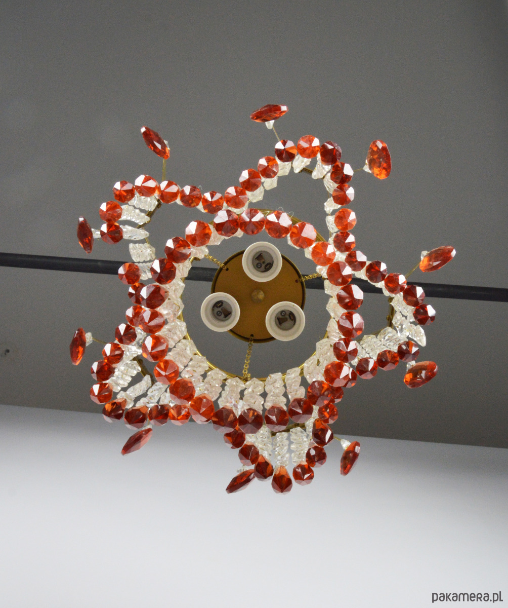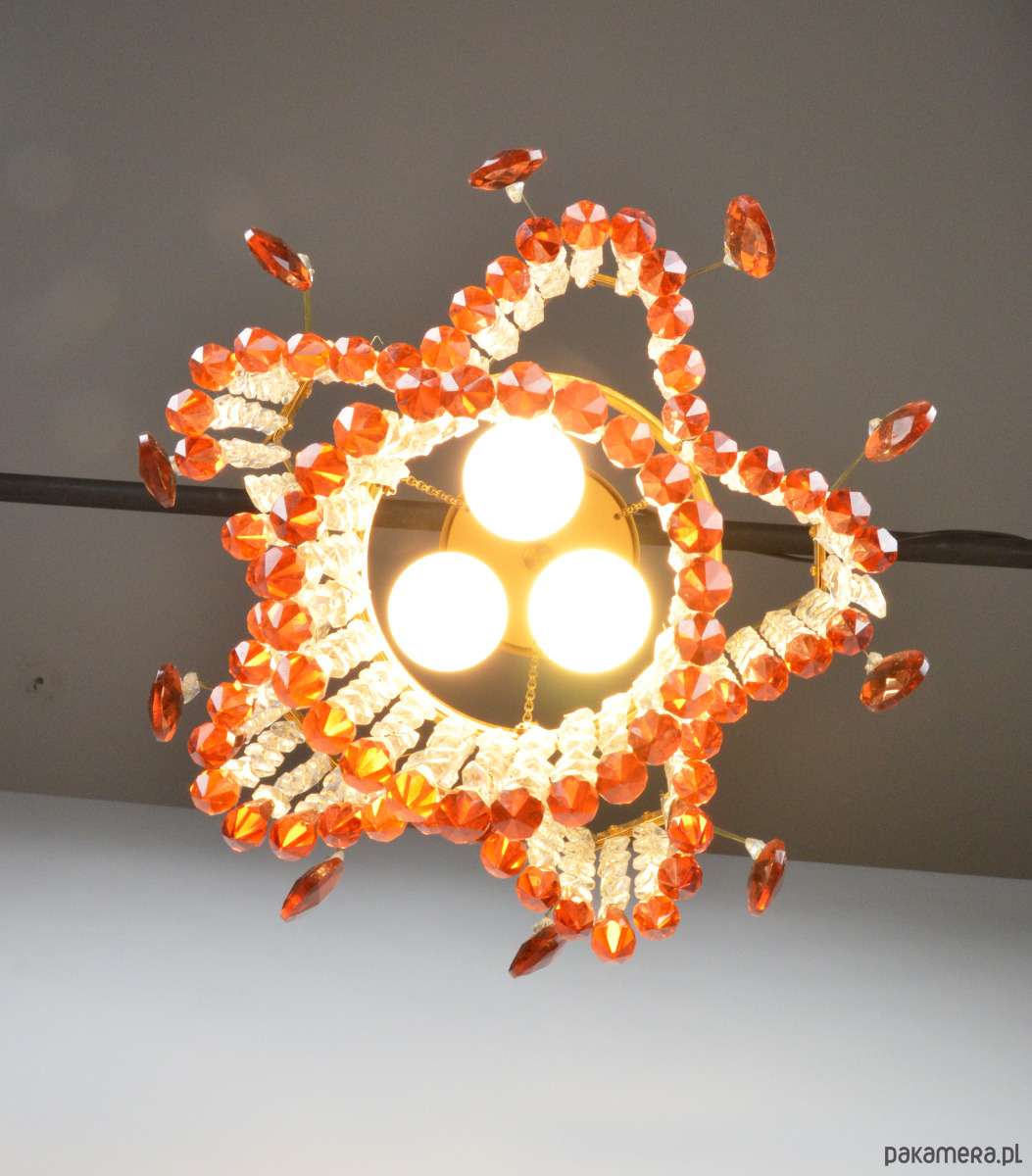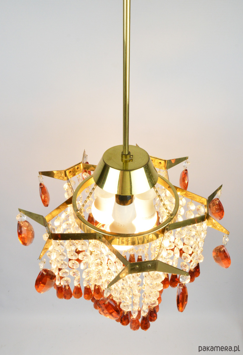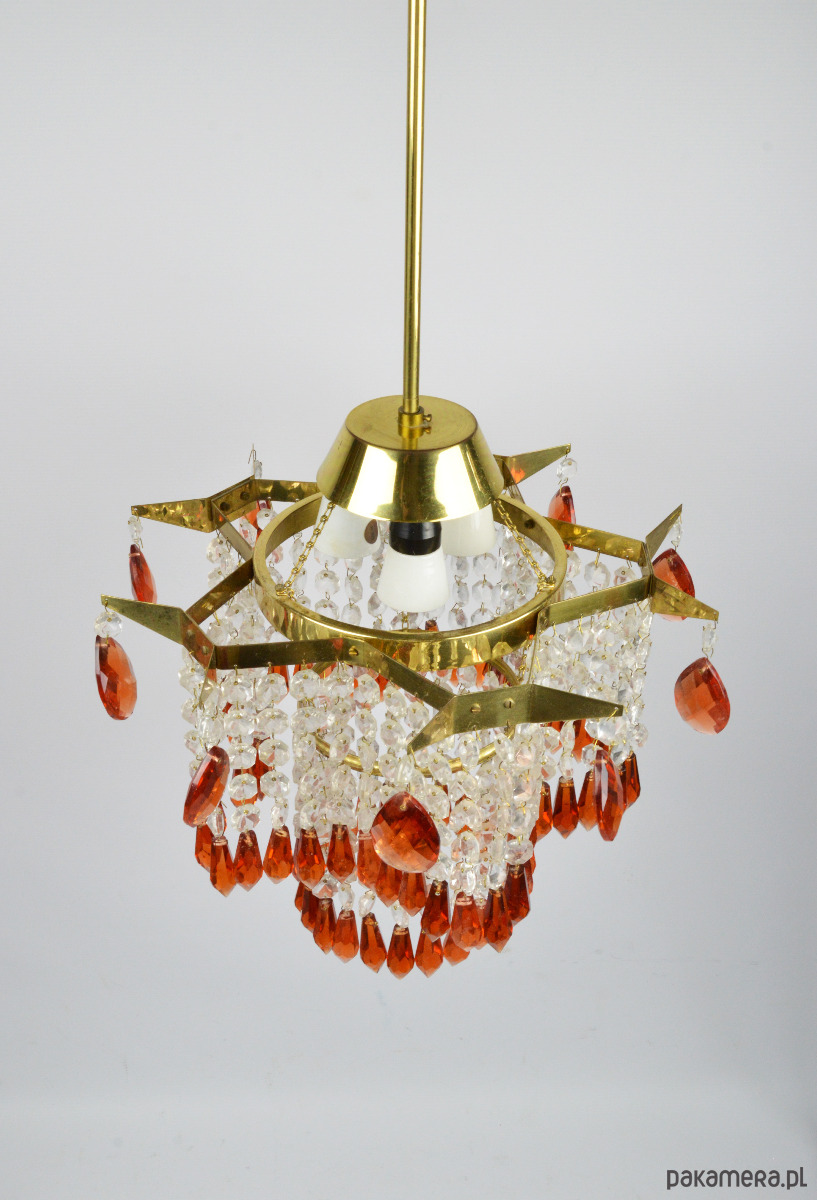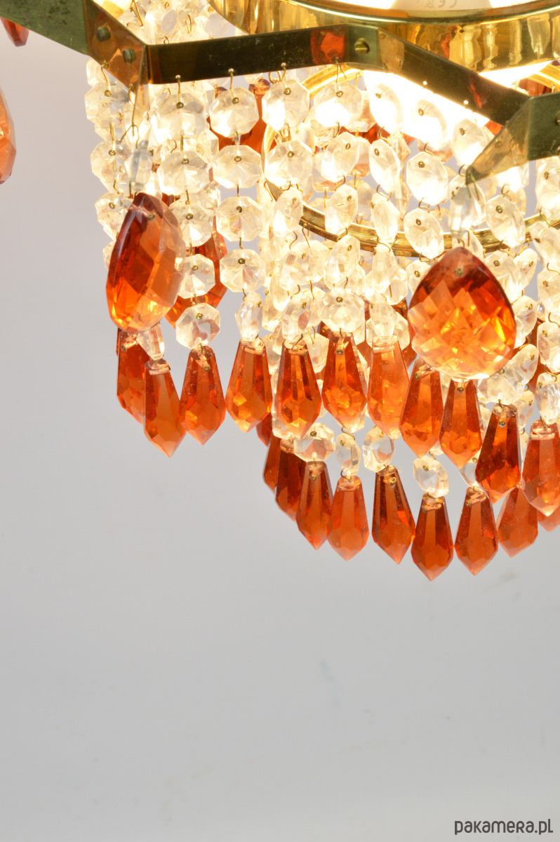 Żyrandol wyprodukowany dla Jablonecke sklarny w Novy Bydzov, Czechosłowacja. Żyrandol składa się ze szklanych wisiorków w dwóch kolorach - przeźroczysty i bursztynowy. Stan zachowania dobry, widoczne normalne ślady użytkowania - brak jednego z bursztynowych sopli (widoczne na zdjęciu).